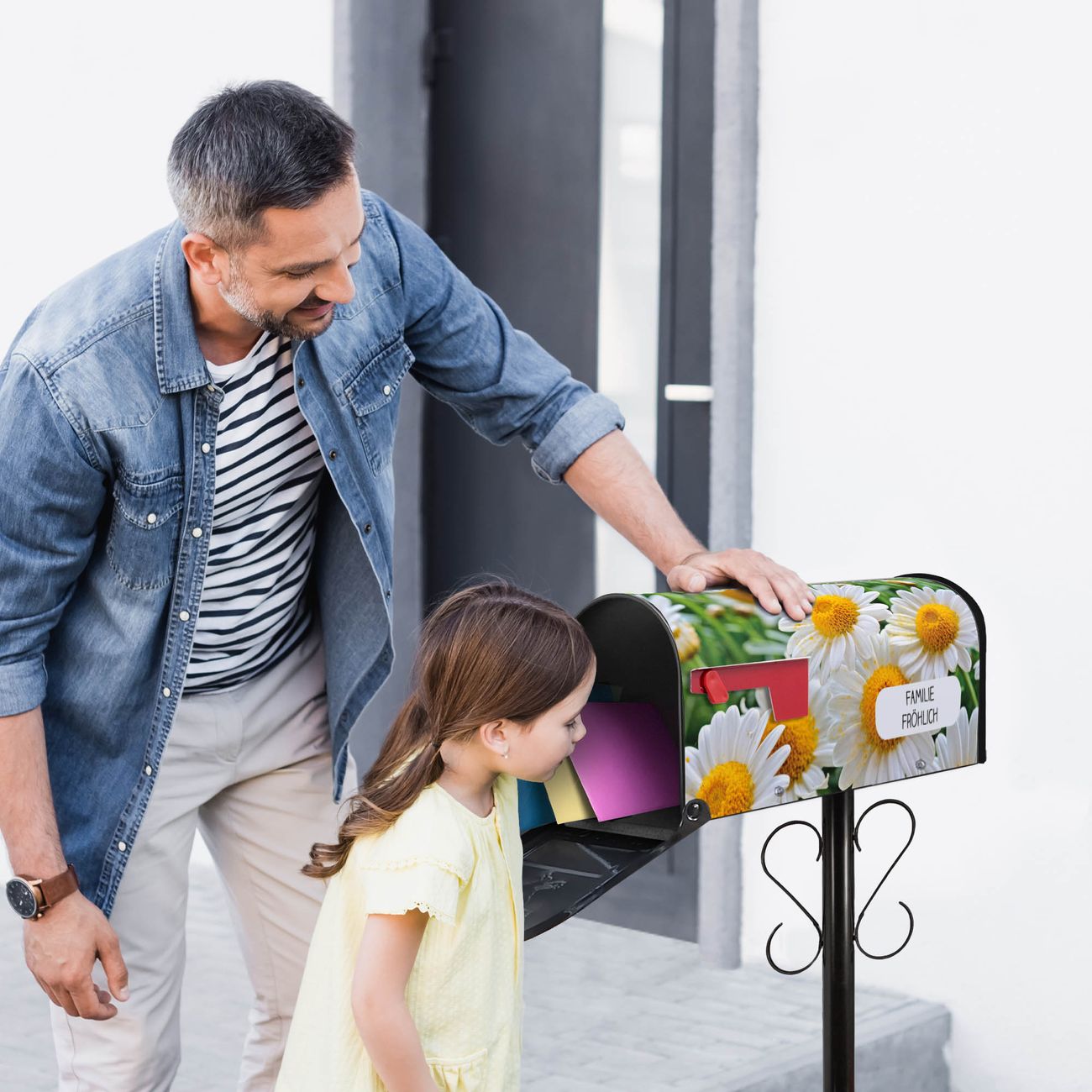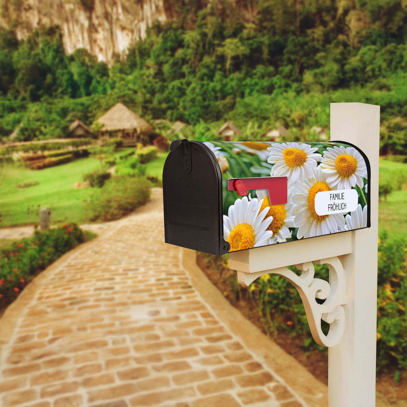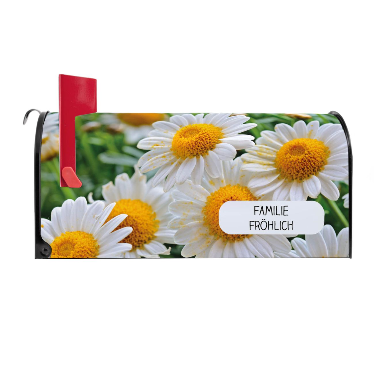 Unser amerikanischer Briefkasten mit dem Motiv Margeriten Illustration hat ein sehr ansprechendes und ausgefallenes Design, ist in der Grundfarbe weiß, grün oder schwarz erhältlich. Damit entlocken Sie Ihren Nachbarn und dem Postboten immer wieder ein Lächeln. Die Mailbox ist ein Original Import aus Mississippi USA und wird von unserer kleinen Manufaktur in Sachsen von Hand veredelt. Die US-Mailbox bietet ausreichend Platz auch für große Sendungen, eine Fahne die Ihnen Post anzeigt, wetterfestes und äußerst stabiles Material - so macht Post empfangen Freude.