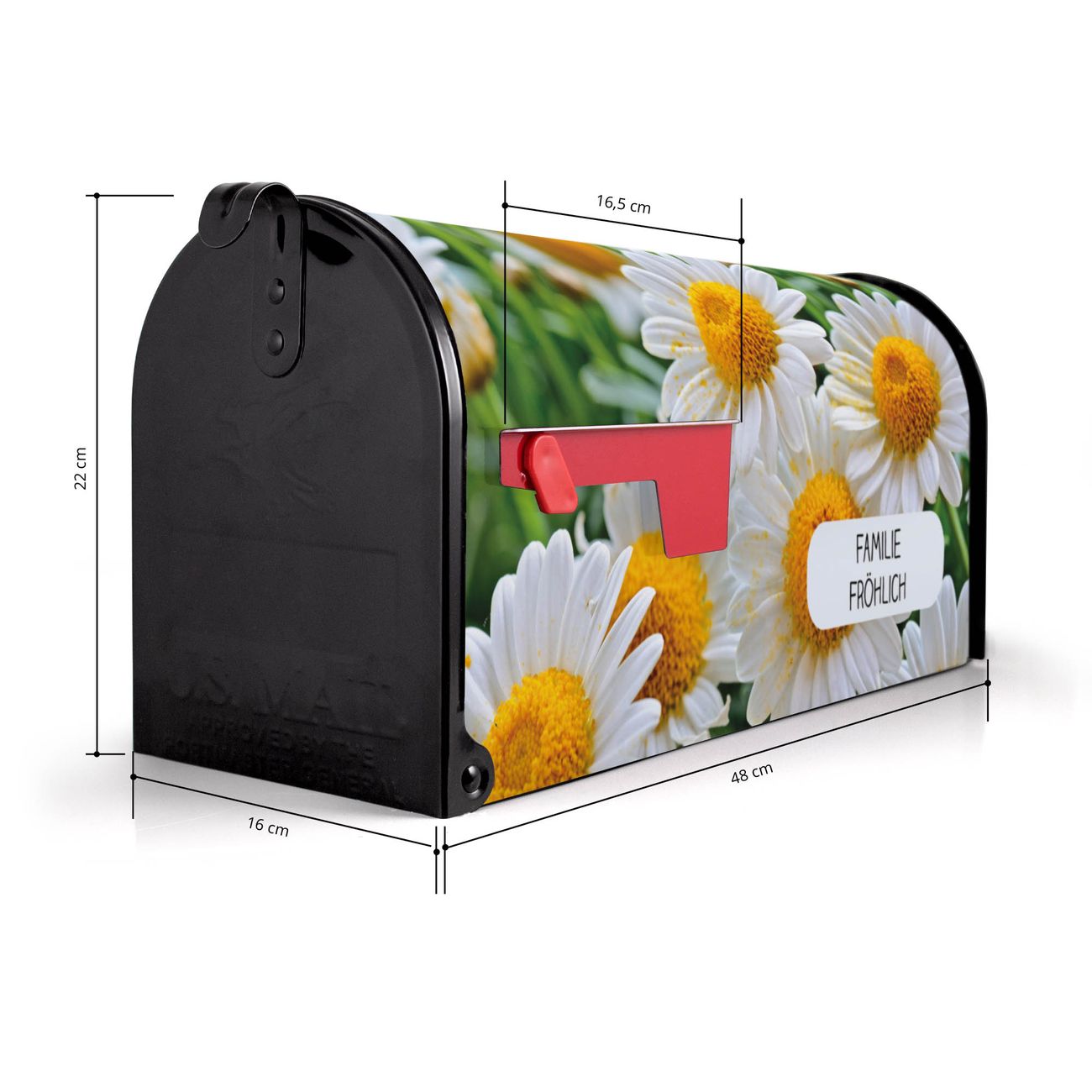 Der amerikanische Briefkasten von banjado mit Margeriten Illustration Motiv bietet Ihnen ausreichend Fassungsvermögen, um große A4 Sendungen und Zeitschriften zu empfangen. Die typisch amerikanische rote Fahne zeigt Ihnen an, wenn Sie Post erhalten haben. Die US-Mailbox besteht aus verzinktem Stahlblech welches lackiert wurde und ist 48 x 22 x 16 CM (BxHxT) groß. Die Folie mit Motiv Margeriten Illustration besteht aus einer wetter- und UV-resistenten Folie, die mit einem Schutzlaminat überzogen ist, sodass die US Mailbox zusätzlich vor Kratzern geschützt ist. An der Unterkante sind 4 Löcher je Seite um die Mailbox, typisch amerikanisch, an einem Holzpfahl oder einem Zaun zu befestigen. Auf Wunsch können Sie bei uns den passenden Standfuß oder die passende Wandhalterung kaufen um die US-Mailbox sicher zu befestigen. Wir bieten Ihnen ebenfalls Namensschilder, bereits beschriftet oder frei zu beschriften, und verschiedene selbst gestaltete Bitte-Keine-Werbung-Aufkleber.