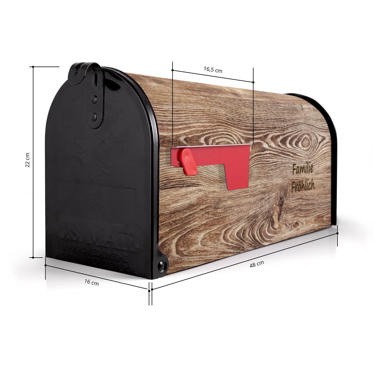 Der amerikanische Briefkasten von banjado mit Maserung Motiv bietet Ihnen ausreichend Fassungsvermögen, um große A4 Sendungen und Zeitschriften zu empfangen. Die typisch amerikanische rote Fahne zeigt Ihnen an, wenn Sie Post erhalten haben. Die US-Mailbox besteht aus verzinktem Stahlblech welches lackiert wurde und ist 48 x 22 x 16 CM (BxHxT) groß. Die Folie mit Motiv Maserung besteht aus einer wetter- und UV-resistenten Folie, die mit einem Schutzlaminat überzogen ist, sodass die US Mailbox zusätzlich vor Kratzern geschützt ist. An der Unterkante sind 4 Löcher je Seite um die Mailbox, typisch amerikanisch, an einem Holzpfahl oder einem Zaun zu befestigen. Auf Wunsch können Sie bei uns den passenden Standfuß oder die passende Wandhalterung kaufen um die US-Mailbox sicher zu befestigen. Wir bieten Ihnen ebenfalls Namensschilder, bereits beschriftet oder frei zu beschriften, und verschiedene selbst gestaltete Bitte-Keine-Werbung-Aufkleber.