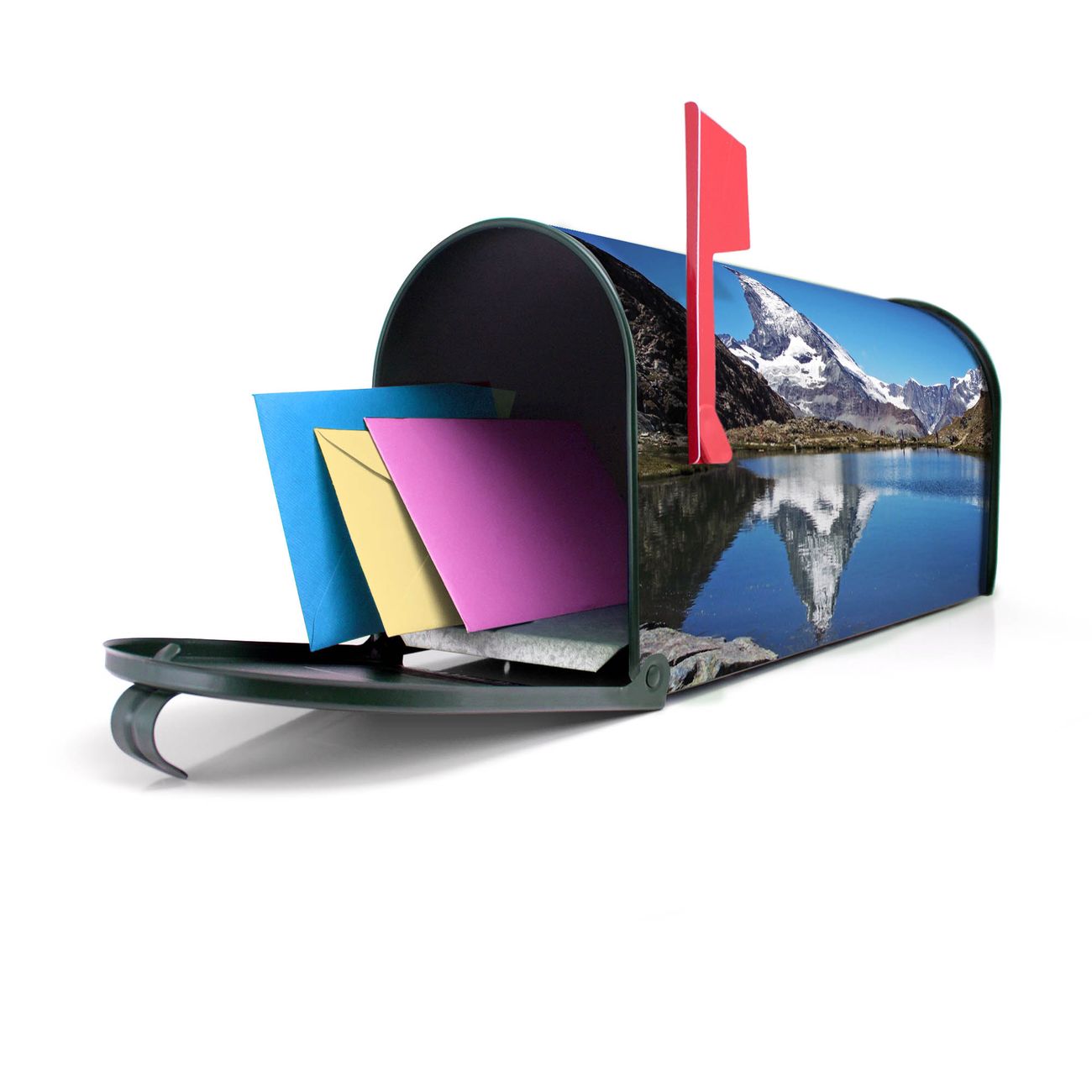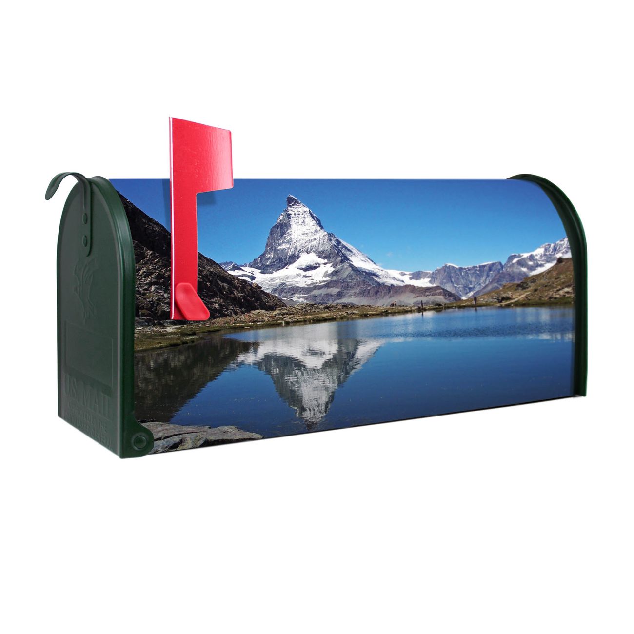Unser amerikanischer Briefkasten mit dem Motiv Matterhorn hat ein sehr ansprechendes und ausgefallenes Design, ist in der Grundfarbe weiß, grün oder schwarz erhältlich. Damit entlocken Sie Ihren Nachbarn und dem Postboten immer wieder ein Lächeln. Die Mailbox ist ein Original Import aus Mississippi USA und wird von unserer kleinen Manufaktur in Sachsen von Hand veredelt. Die US-Mailbox bietet ausreichend Platz auch für große Sendungen, eine Fahne die Ihnen Post anzeigt, wetterfestes und äußerst stabiles Material - so macht Post empfangen Freude.