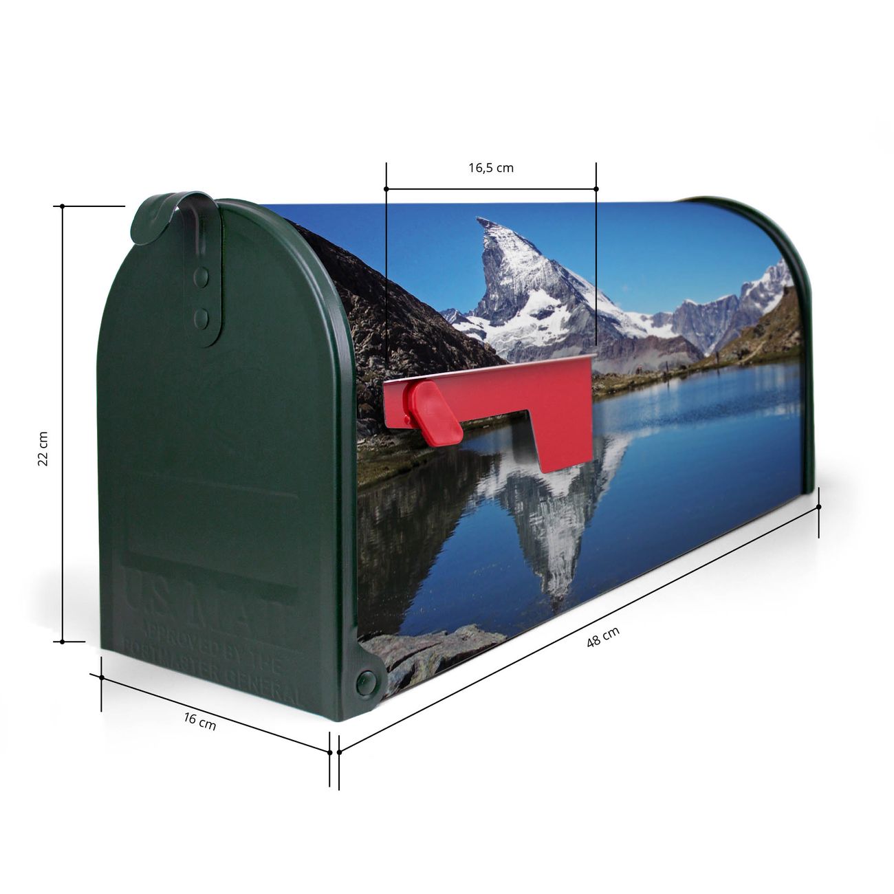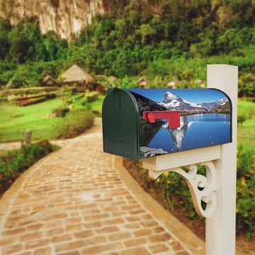 Der amerikanische Briefkasten von banjado mit Matterhorn Motiv bietet Ihnen ausreichend Fassungsvermögen, um große A4 Sendungen und Zeitschriften zu empfangen. Die typisch amerikanische rote Fahne zeigt Ihnen an, wenn Sie Post erhalten haben. Die US-Mailbox besteht aus verzinktem Stahlblech welches lackiert wurde und ist 48 x 22 x 16 CM (BxHxT) groß. Die Folie mit Motiv Matterhorn besteht aus einer wetter- und UV-resistenten Folie, die mit einem Schutzlaminat überzogen ist, sodass die US Mailbox zusätzlich vor Kratzern geschützt ist. An der Unterkante sind 4 Löcher je Seite um die Mailbox, typisch amerikanisch, an einem Holzpfahl oder einem Zaun zu befestigen. Auf Wunsch können Sie bei uns den passenden Standfuß oder die passende Wandhalterung kaufen um die US-Mailbox sicher zu befestigen. Wir bieten Ihnen ebenfalls Namensschilder, bereits beschriftet oder frei zu beschriften, und verschiedene selbst gestaltete Bitte-Keine-Werbung-Aufkleber.