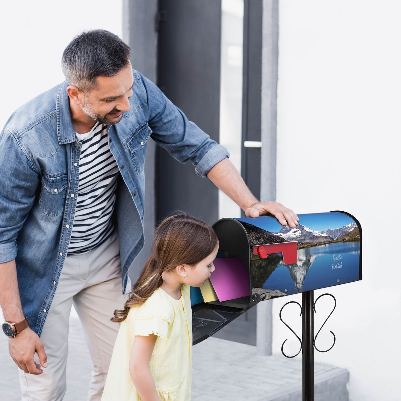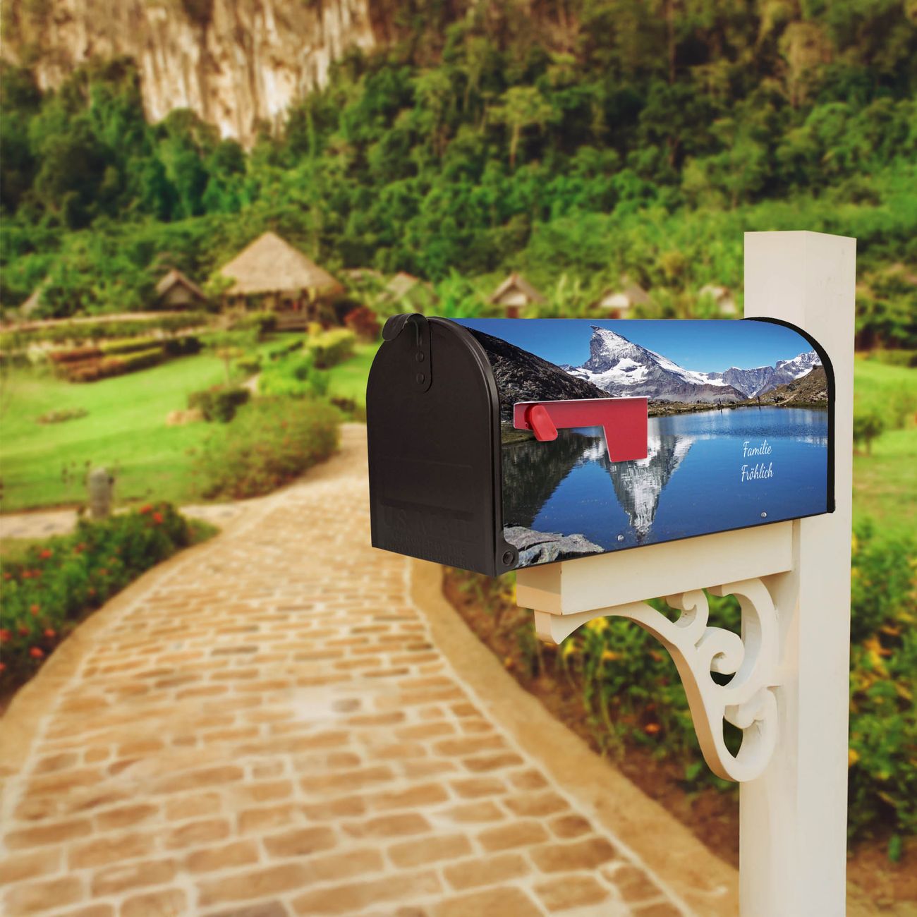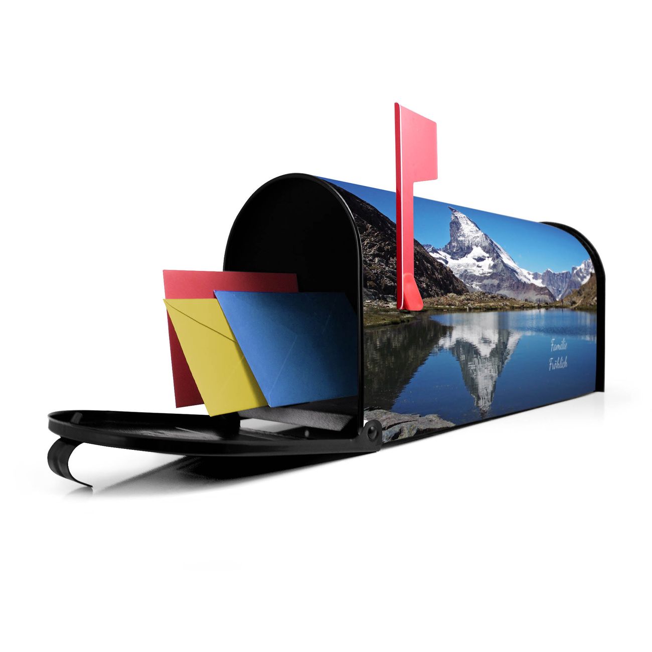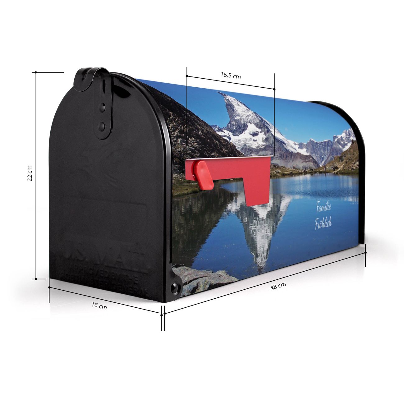 Der amerikanische Briefkasten von banjado mit Matterhorn Motiv bietet Ihnen ausreichend Fassungsvermögen, um große A4 Sendungen und Zeitschriften zu empfangen. Die typisch amerikanische rote Fahne zeigt Ihnen an, wenn Sie Post erhalten haben. Die US-Mailbox besteht aus verzinktem Stahlblech welches lackiert wurde und ist 48 x 22 x 16 CM (BxHxT) groß. Die Folie mit Motiv Matterhorn besteht aus einer wetter- und UV-resistenten Folie, die mit einem Schutzlaminat überzogen ist, sodass die US Mailbox zusätzlich vor Kratzern geschützt ist. An der Unterkante sind 4 Löcher je Seite um die Mailbox, typisch amerikanisch, an einem Holzpfahl oder einem Zaun zu befestigen. Auf Wunsch können Sie bei uns den passenden Standfuß oder die passende Wandhalterung kaufen um die US-Mailbox sicher zu befestigen. Wir bieten Ihnen ebenfalls Namensschilder, bereits beschriftet oder frei zu beschriften, und verschiedene selbst gestaltete Bitte-Keine-Werbung-Aufkleber.
