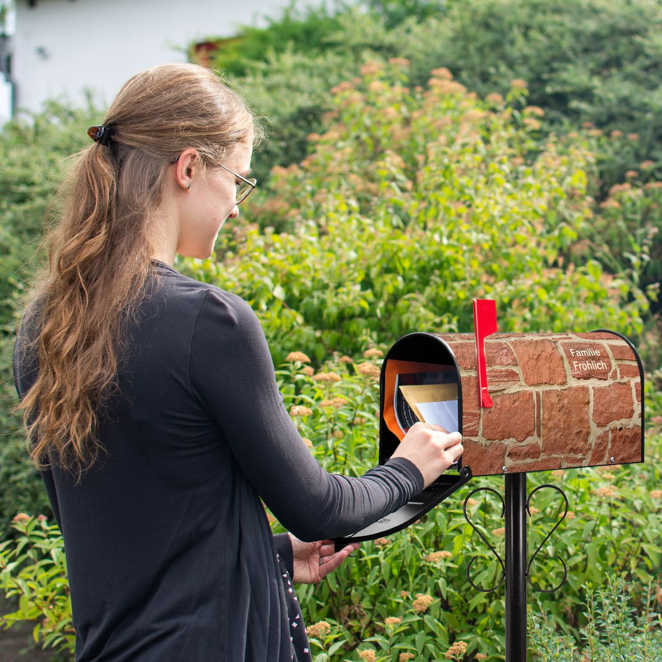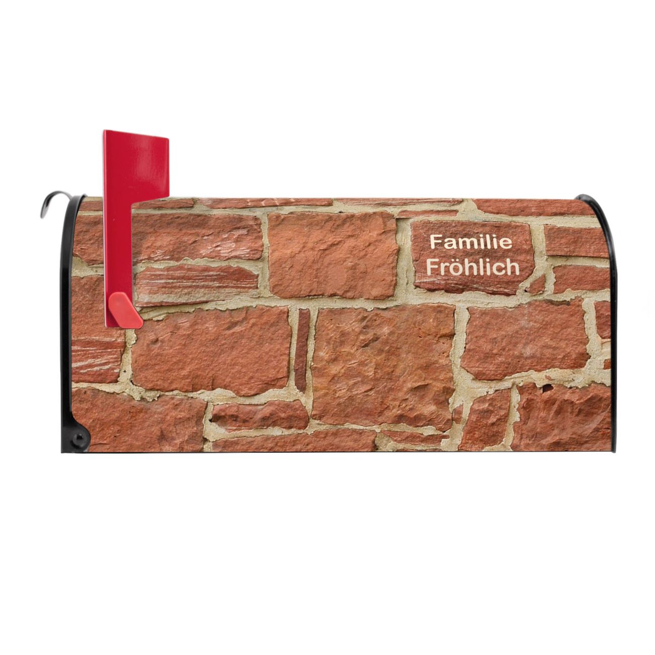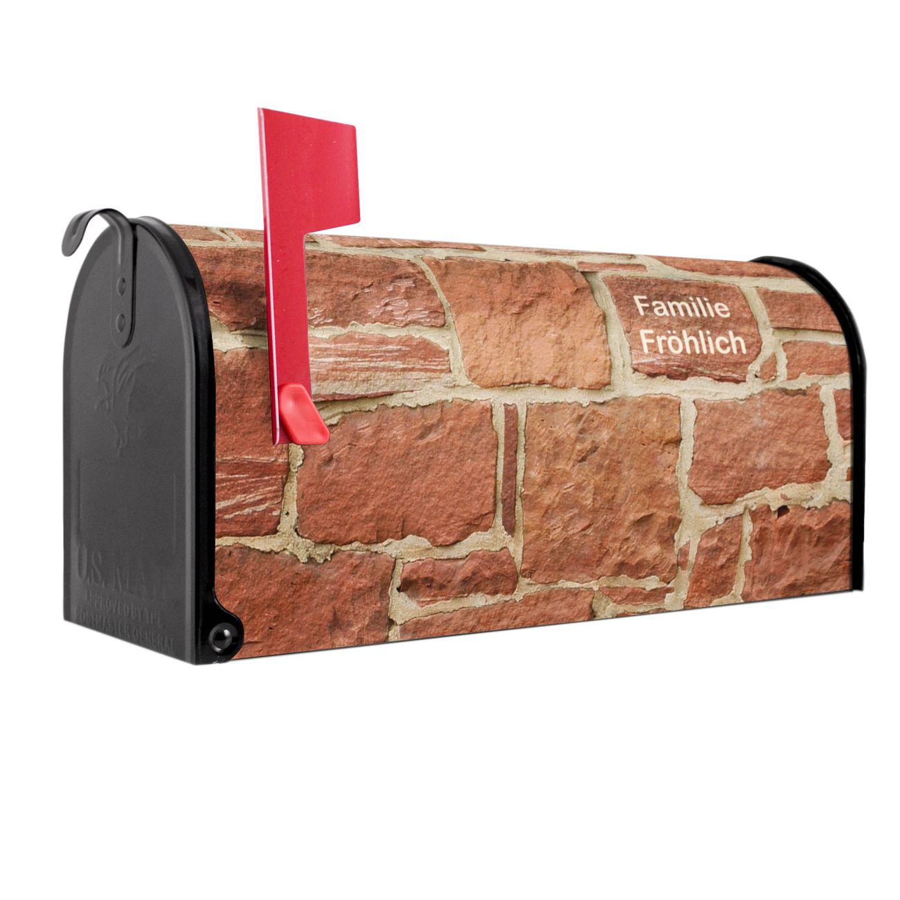 Der amerikanische Briefkasten von banjado mit Mauerwerk Motiv bietet Ihnen ausreichend Fassungsvermögen, um große A4 Sendungen und Zeitschriften zu empfangen. Die typisch amerikanische rote Fahne zeigt Ihnen an, wenn Sie Post erhalten haben. Die US-Mailbox besteht aus verzinktem Stahlblech welches lackiert wurde und ist 48 x 22 x 16 CM (BxHxT) groß. Die Folie mit Motiv Mauerwerk besteht aus einer wetter- und UV-resistenten Folie, die mit einem Schutzlaminat überzogen ist, sodass die US Mailbox zusätzlich vor Kratzern geschützt ist. An der Unterkante sind 4 Löcher je Seite um die Mailbox, typisch amerikanisch, an einem Holzpfahl oder einem Zaun zu befestigen. Auf Wunsch können Sie bei uns den passenden Standfuß oder die passende Wandhalterung kaufen um die US-Mailbox sicher zu befestigen. Wir bieten Ihnen ebenfalls Namensschilder, bereits beschriftet oder frei zu beschriften, und verschiedene selbst gestaltete Bitte-Keine-Werbung-Aufkleber.