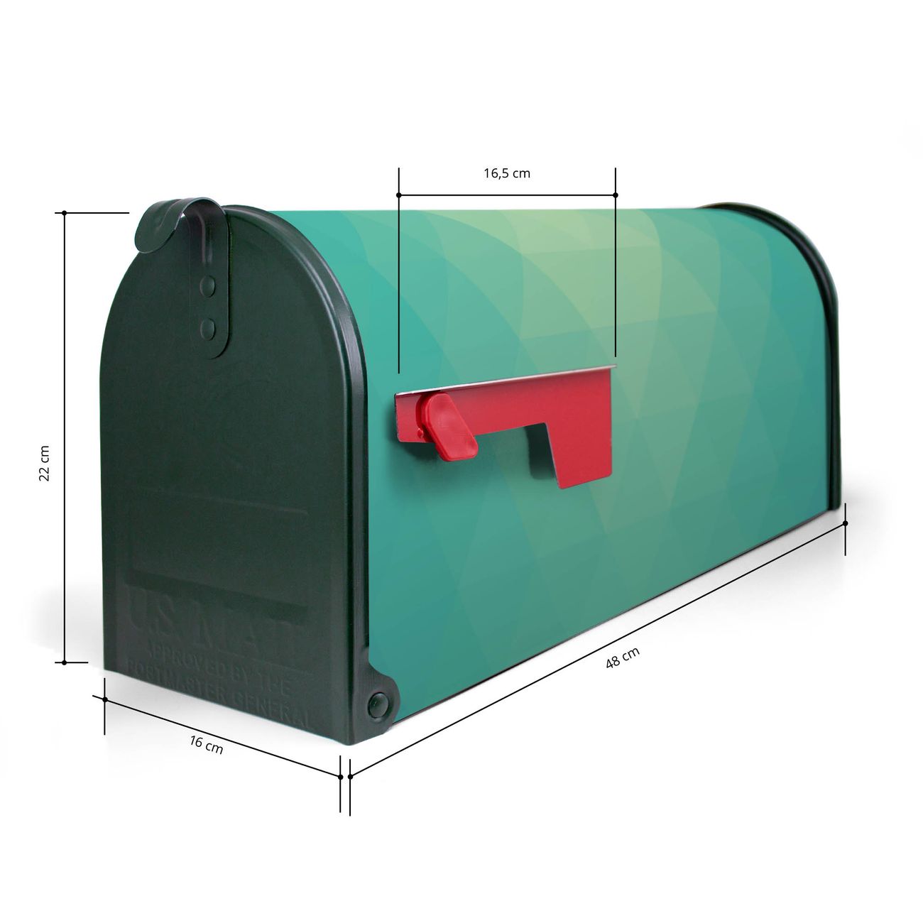 Der amerikanische Briefkasten von banjado mit Meeresblau Motiv bietet Ihnen ausreichend Fassungsvermögen, um große A4 Sendungen und Zeitschriften zu empfangen. Die typisch amerikanische rote Fahne zeigt Ihnen an, wenn Sie Post erhalten haben. Die US-Mailbox besteht aus verzinktem Stahlblech welches lackiert wurde und ist 48 x 22 x 16 CM (BxHxT) groß. Die Folie mit Motiv Meeresblau besteht aus einer wetter- und UV-resistenten Folie, die mit einem Schutzlaminat überzogen ist, sodass die US Mailbox zusätzlich vor Kratzern geschützt ist. An der Unterkante sind 4 Löcher je Seite um die Mailbox, typisch amerikanisch, an einem Holzpfahl oder einem Zaun zu befestigen. Auf Wunsch können Sie bei uns den passenden Standfuß oder die passende Wandhalterung kaufen um die US-Mailbox sicher zu befestigen. Wir bieten Ihnen ebenfalls Namensschilder, bereits beschriftet oder frei zu beschriften, und verschiedene selbst gestaltete Bitte-Keine-Werbung-Aufkleber.