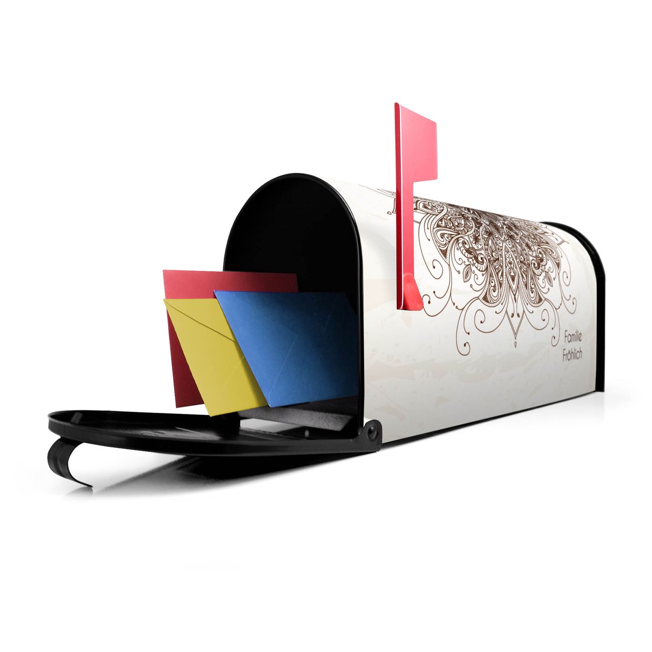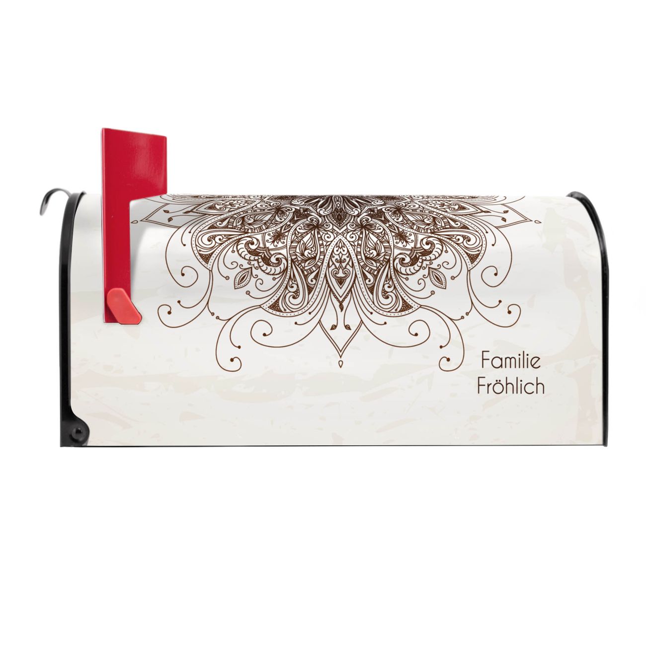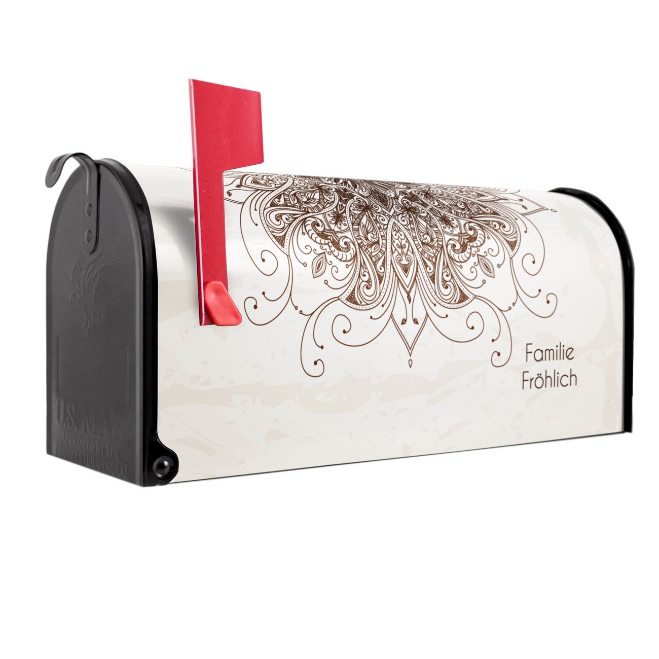 Unser amerikanischer Briefkasten mit dem Motiv Mehendi hat ein sehr ansprechendes und ausgefallenes Design, ist in der Grundfarbe weiß, grün oder schwarz erhältlich. Damit entlocken Sie Ihren Nachbarn und dem Postboten immer wieder ein Lächeln. Die Mailbox ist ein Original Import aus Mississippi USA und wird von unserer kleinen Manufaktur in Sachsen von Hand veredelt. Die US-Mailbox bietet ausreichend Platz auch für große Sendungen, eine Fahne die Ihnen Post anzeigt, wetterfestes und äußerst stabiles Material - so macht Post empfangen Freude.