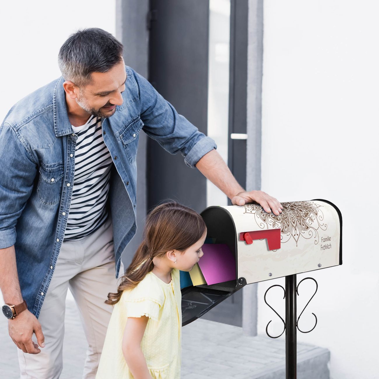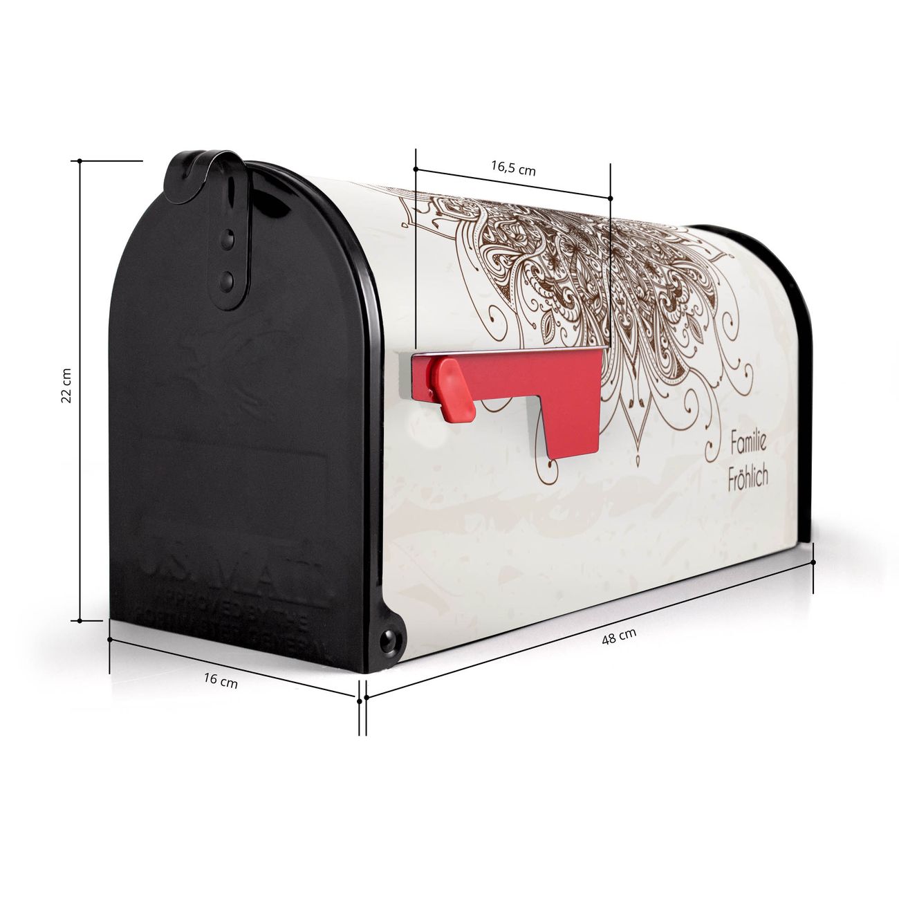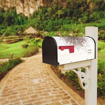 Der amerikanische Briefkasten von banjado mit Mehendi Motiv bietet Ihnen ausreichend Fassungsvermögen, um große A4 Sendungen und Zeitschriften zu empfangen. Die typisch amerikanische rote Fahne zeigt Ihnen an, wenn Sie Post erhalten haben. Die US-Mailbox besteht aus verzinktem Stahlblech welches lackiert wurde und ist 48 x 22 x 16 CM (BxHxT) groß. Die Folie mit Motiv Mehendi besteht aus einer wetter- und UV-resistenten Folie, die mit einem Schutzlaminat überzogen ist, sodass die US Mailbox zusätzlich vor Kratzern geschützt ist. An der Unterkante sind 4 Löcher je Seite um die Mailbox, typisch amerikanisch, an einem Holzpfahl oder einem Zaun zu befestigen. Auf Wunsch können Sie bei uns den passenden Standfuß oder die passende Wandhalterung kaufen um die US-Mailbox sicher zu befestigen. Wir bieten Ihnen ebenfalls Namensschilder, bereits beschriftet oder frei zu beschriften, und verschiedene selbst gestaltete Bitte-Keine-Werbung-Aufkleber.