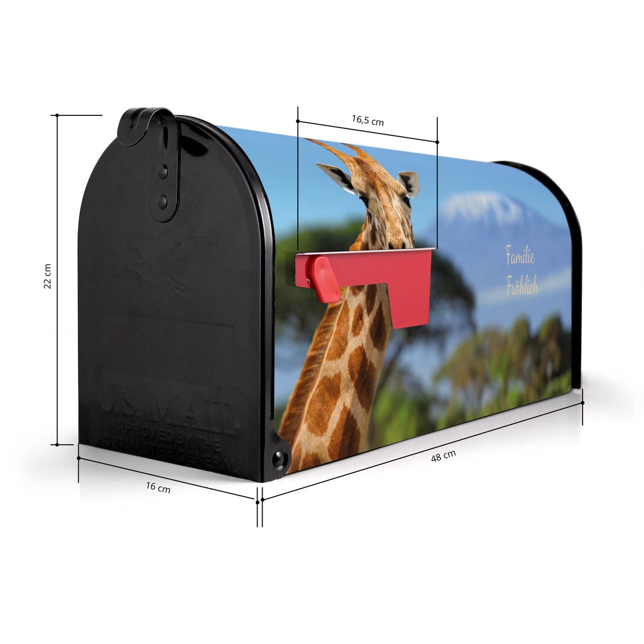 Der amerikanische Briefkasten von banjado mit Miss Kilimandscharo Motiv bietet Ihnen ausreichend Fassungsvermögen, um große A4 Sendungen und Zeitschriften zu empfangen. Die typisch amerikanische rote Fahne zeigt Ihnen an, wenn Sie Post erhalten haben. Die US-Mailbox besteht aus verzinktem Stahlblech welches lackiert wurde und ist 48 x 22 x 16 CM (BxHxT) groß. Die Folie mit Motiv Miss Kilimandscharo besteht aus einer wetter- und UV-resistenten Folie, die mit einem Schutzlaminat überzogen ist, sodass die US Mailbox zusätzlich vor Kratzern geschützt ist. An der Unterkante sind 4 Löcher je Seite um die Mailbox, typisch amerikanisch, an einem Holzpfahl oder einem Zaun zu befestigen. Auf Wunsch können Sie bei uns den passenden Standfuß oder die passende Wandhalterung kaufen um die US-Mailbox sicher zu befestigen. Wir bieten Ihnen ebenfalls Namensschilder, bereits beschriftet oder frei zu beschriften, und verschiedene selbst gestaltete Bitte-Keine-Werbung-Aufkleber.