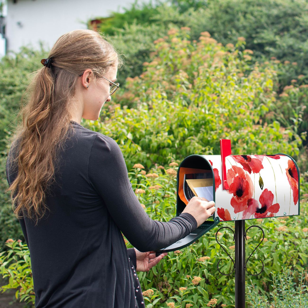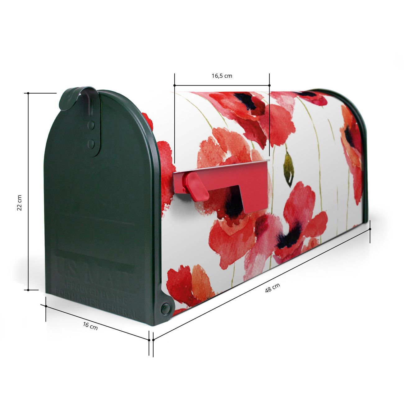 Der amerikanische Briefkasten von banjado mit Mohn Aquarell Motiv bietet Ihnen ausreichend Fassungsvermögen, um große A4 Sendungen und Zeitschriften zu empfangen. Die typisch amerikanische rote Fahne zeigt Ihnen an, wenn Sie Post erhalten haben. Die US-Mailbox besteht aus verzinktem Stahlblech welches lackiert wurde und ist 48 x 22 x 16 CM (BxHxT) groß. Die Folie mit Motiv Mohn Aquarell besteht aus einer wetter- und UV-resistenten Folie, die mit einem Schutzlaminat überzogen ist, sodass die US Mailbox zusätzlich vor Kratzern geschützt ist. An der Unterkante sind 4 Löcher je Seite um die Mailbox, typisch amerikanisch, an einem Holzpfahl oder einem Zaun zu befestigen. Auf Wunsch können Sie bei uns den passenden Standfuß oder die passende Wandhalterung kaufen um die US-Mailbox sicher zu befestigen. Wir bieten Ihnen ebenfalls Namensschilder, bereits beschriftet oder frei zu beschriften, und verschiedene selbst gestaltete Bitte-Keine-Werbung-Aufkleber.