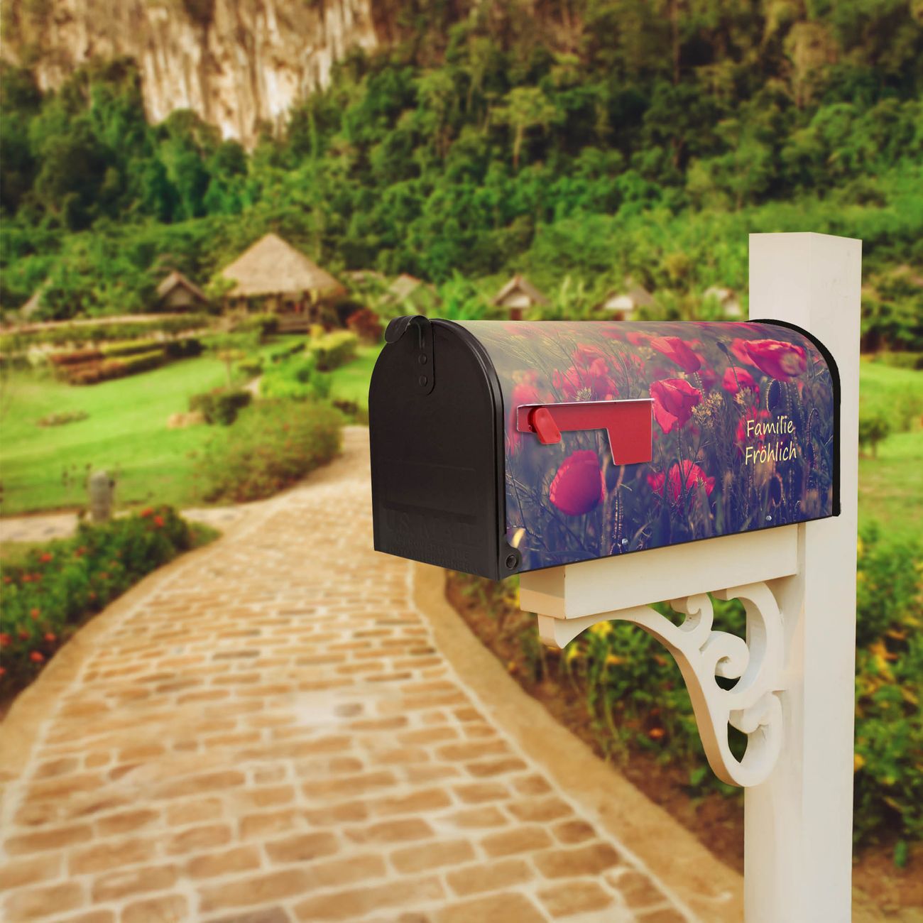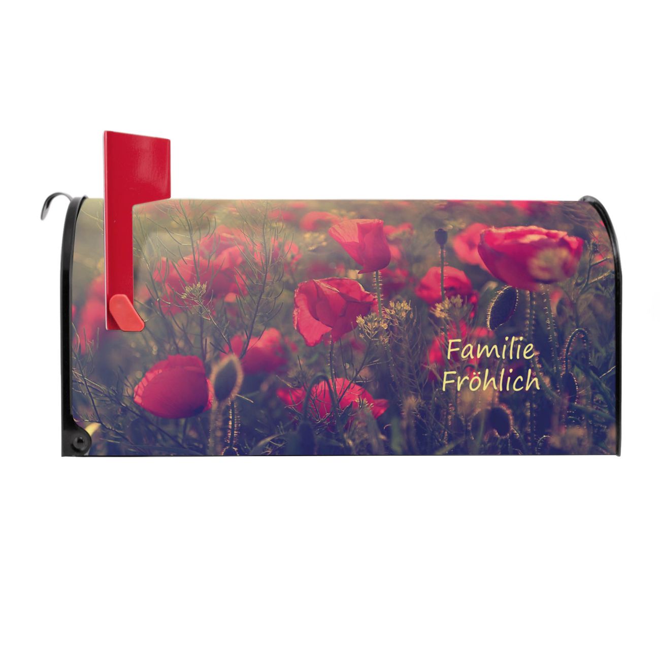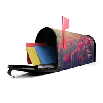 Der amerikanische Briefkasten von banjado mit Mohn Motiv bietet Ihnen ausreichend Fassungsvermögen, um große A4 Sendungen und Zeitschriften zu empfangen. Die typisch amerikanische rote Fahne zeigt Ihnen an, wenn Sie Post erhalten haben. Die US-Mailbox besteht aus verzinktem Stahlblech welches lackiert wurde und ist 48 x 22 x 16 CM (BxHxT) groß. Die Folie mit Motiv Mohn besteht aus einer wetter- und UV-resistenten Folie, die mit einem Schutzlaminat überzogen ist, sodass die US Mailbox zusätzlich vor Kratzern geschützt ist. An der Unterkante sind 4 Löcher je Seite um die Mailbox, typisch amerikanisch, an einem Holzpfahl oder einem Zaun zu befestigen. Auf Wunsch können Sie bei uns den passenden Standfuß oder die passende Wandhalterung kaufen um die US-Mailbox sicher zu befestigen. Wir bieten Ihnen ebenfalls Namensschilder, bereits beschriftet oder frei zu beschriften, und verschiedene selbst gestaltete Bitte-Keine-Werbung-Aufkleber.