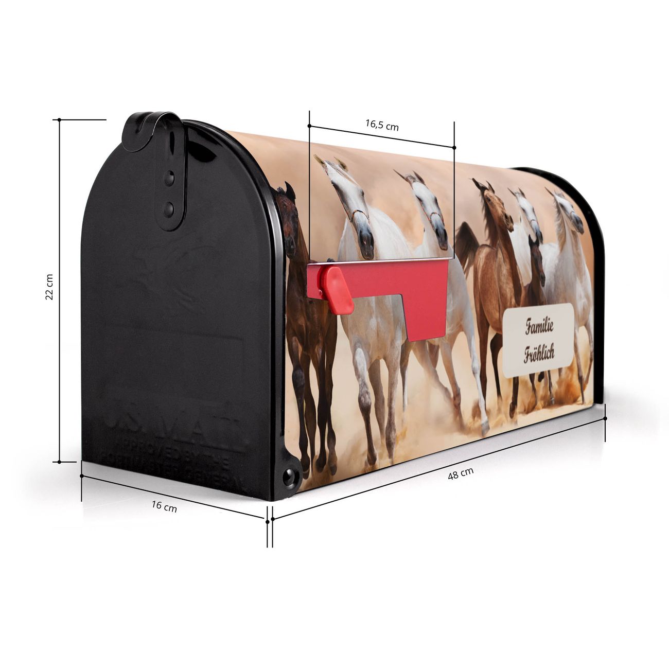 Der amerikanische Briefkasten von banjado mit Mongolische Stimmung Motiv bietet Ihnen ausreichend Fassungsvermögen, um große A4 Sendungen und Zeitschriften zu empfangen. Die typisch amerikanische rote Fahne zeigt Ihnen an, wenn Sie Post erhalten haben. Die US-Mailbox besteht aus verzinktem Stahlblech welches lackiert wurde und ist 48 x 22 x 16 CM (BxHxT) groß. Die Folie mit Motiv Mongolische Stimmung besteht aus einer wetter- und UV-resistenten Folie, die mit einem Schutzlaminat überzogen ist, sodass die US Mailbox zusätzlich vor Kratzern geschützt ist. An der Unterkante sind 4 Löcher je Seite um die Mailbox, typisch amerikanisch, an einem Holzpfahl oder einem Zaun zu befestigen. Auf Wunsch können Sie bei uns den passenden Standfuß oder die passende Wandhalterung kaufen um die US-Mailbox sicher zu befestigen. Wir bieten Ihnen ebenfalls Namensschilder, bereits beschriftet oder frei zu beschriften, und verschiedene selbst gestaltete Bitte-Keine-Werbung-Aufkleber.
