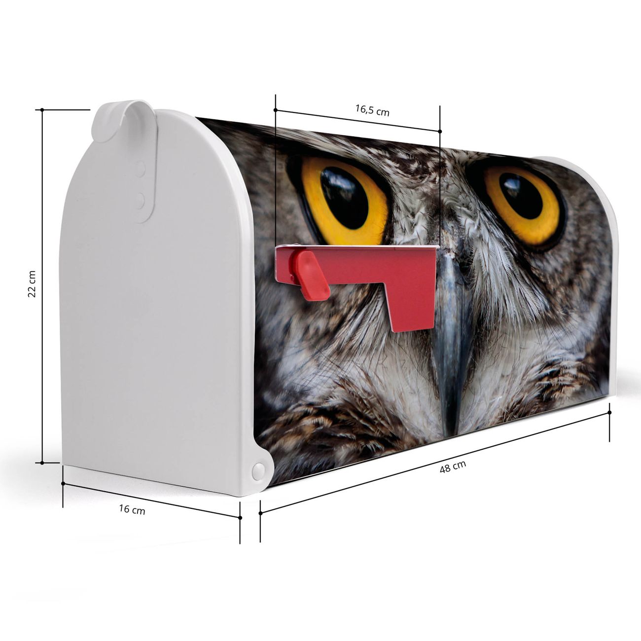 Der amerikanische Briefkasten von banjado mit Monique Motiv bietet Ihnen ausreichend Fassungsvermögen, um große A4 Sendungen und Zeitschriften zu empfangen. Die typisch amerikanische rote Fahne zeigt Ihnen an, wenn Sie Post erhalten haben. Die US-Mailbox besteht aus verzinktem Stahlblech welches lackiert wurde und ist 48 x 22 x 16 CM (BxHxT) groß. Die Folie mit Motiv Monique besteht aus einer wetter- und UV-resistenten Folie, die mit einem Schutzlaminat überzogen ist, sodass die US Mailbox zusätzlich vor Kratzern geschützt ist. An der Unterkante sind 4 Löcher je Seite um die Mailbox, typisch amerikanisch, an einem Holzpfahl oder einem Zaun zu befestigen. Auf Wunsch können Sie bei uns den passenden Standfuß oder die passende Wandhalterung kaufen um die US-Mailbox sicher zu befestigen. Wir bieten Ihnen ebenfalls Namensschilder, bereits beschriftet oder frei zu beschriften, und verschiedene selbst gestaltete Bitte-Keine-Werbung-Aufkleber.