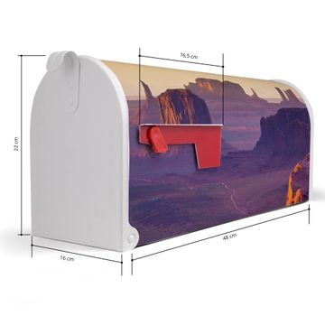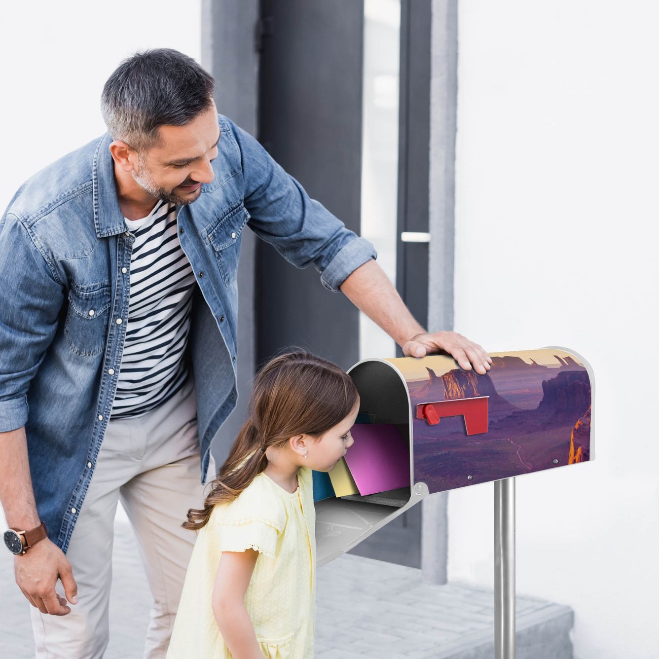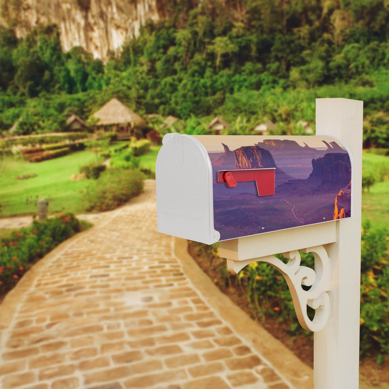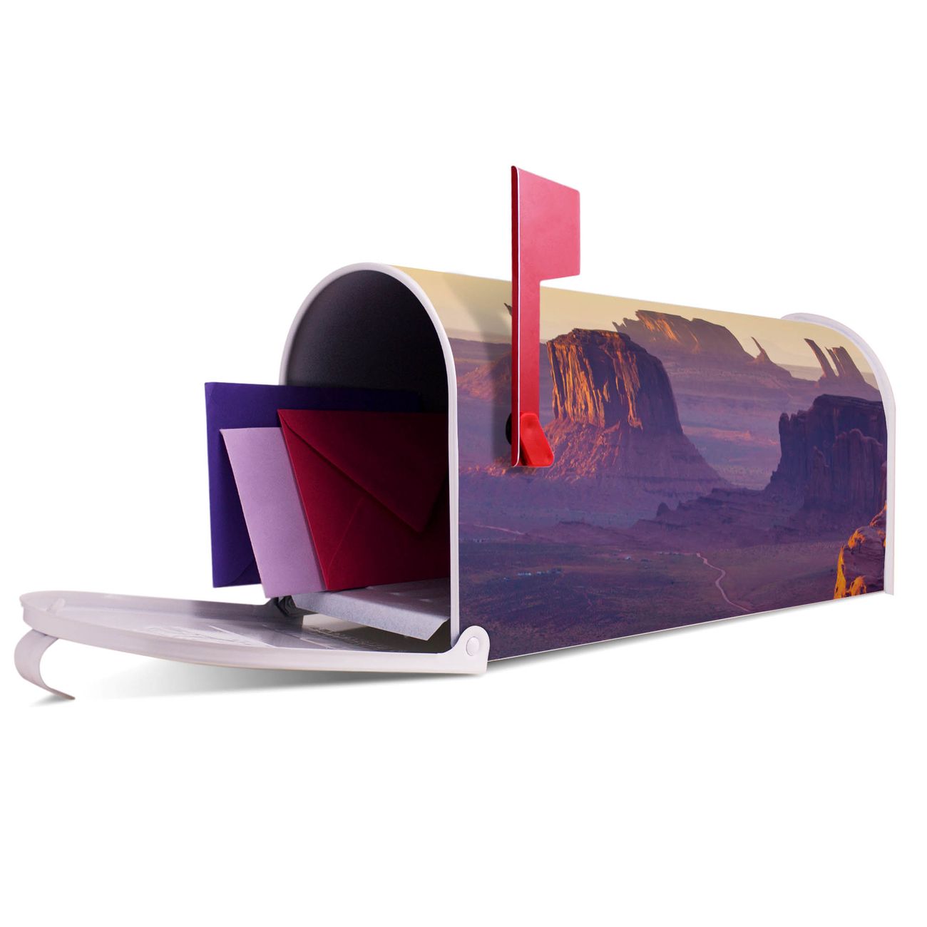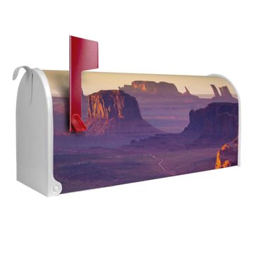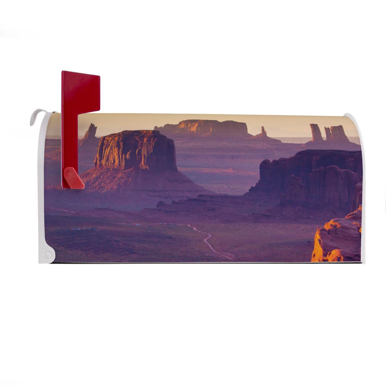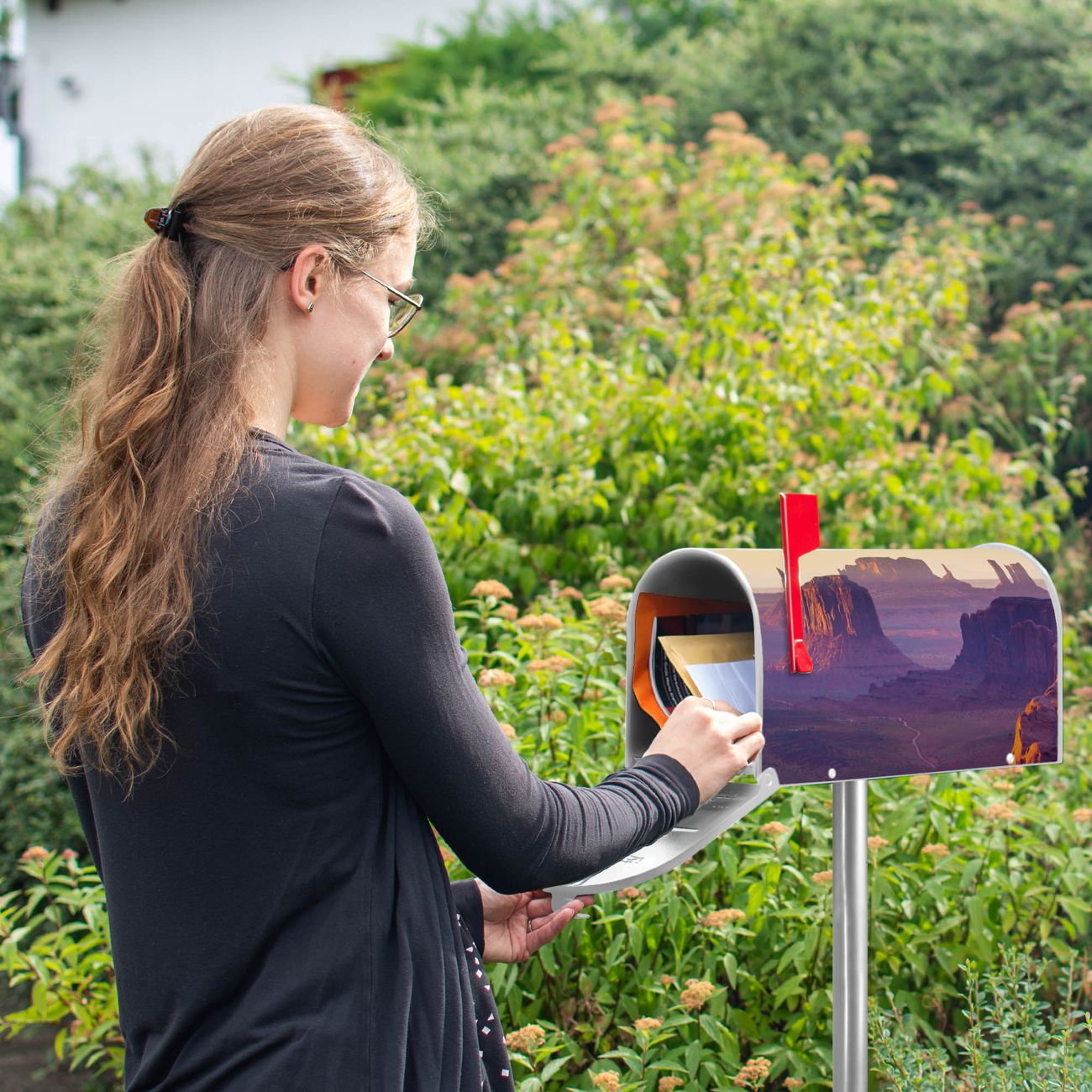 Der amerikanische Briefkasten von banjado mit Monument Valley Motiv bietet Ihnen ausreichend Fassungsvermögen, um große A4 Sendungen und Zeitschriften zu empfangen. Die typisch amerikanische rote Fahne zeigt Ihnen an, wenn Sie Post erhalten haben. Die US-Mailbox besteht aus verzinktem Stahlblech welches lackiert wurde und ist 48 x 22 x 16 CM (BxHxT) groß. Die Folie mit Motiv Monument Valley besteht aus einer wetter- und UV-resistenten Folie, die mit einem Schutzlaminat überzogen ist, sodass die US Mailbox zusätzlich vor Kratzern geschützt ist. An der Unterkante sind 4 Löcher je Seite um die Mailbox, typisch amerikanisch, an einem Holzpfahl oder einem Zaun zu befestigen. Auf Wunsch können Sie bei uns den passenden Standfuß oder die passende Wandhalterung kaufen um die US-Mailbox sicher zu befestigen. Wir bieten Ihnen ebenfalls Namensschilder, bereits beschriftet oder frei zu beschriften, und verschiedene selbst gestaltete Bitte-Keine-Werbung-Aufkleber.