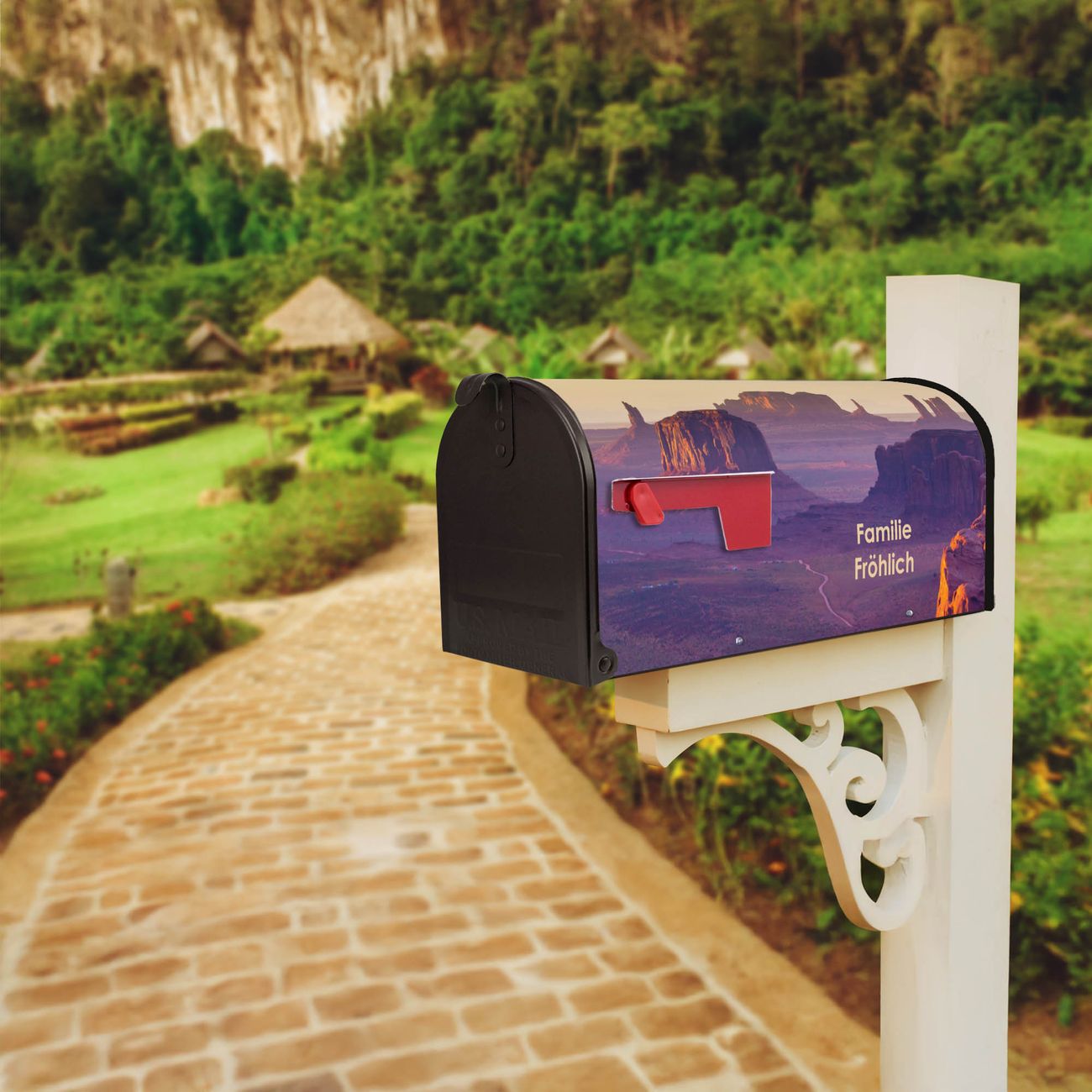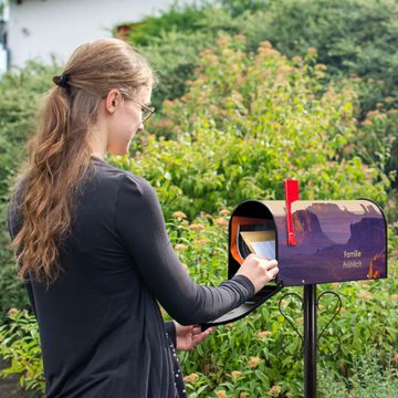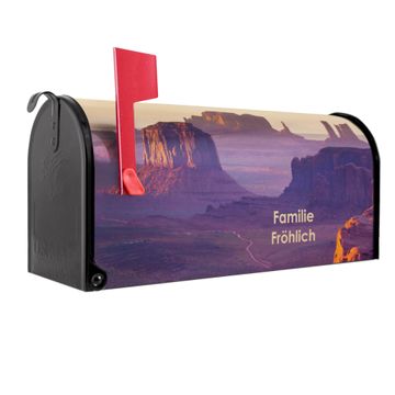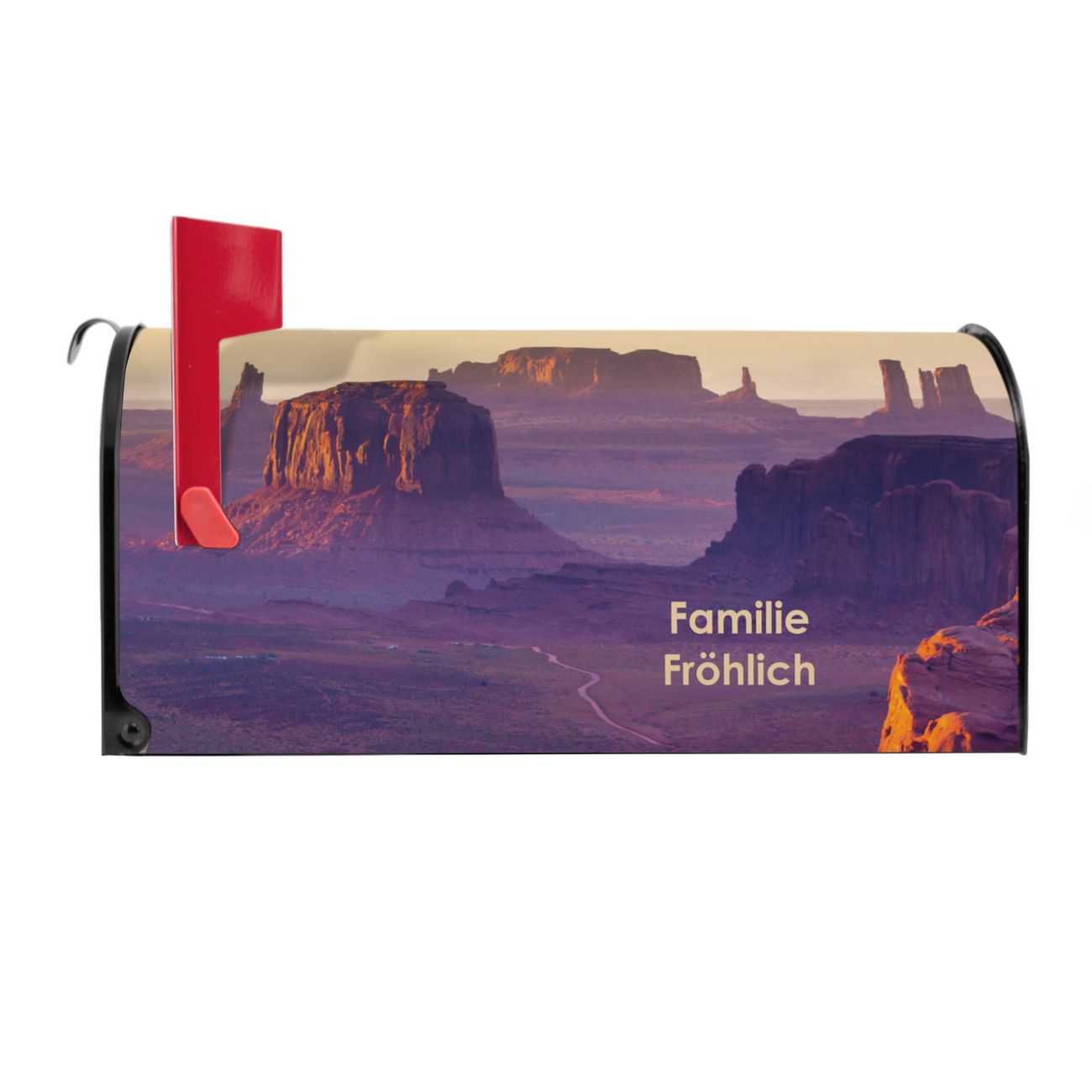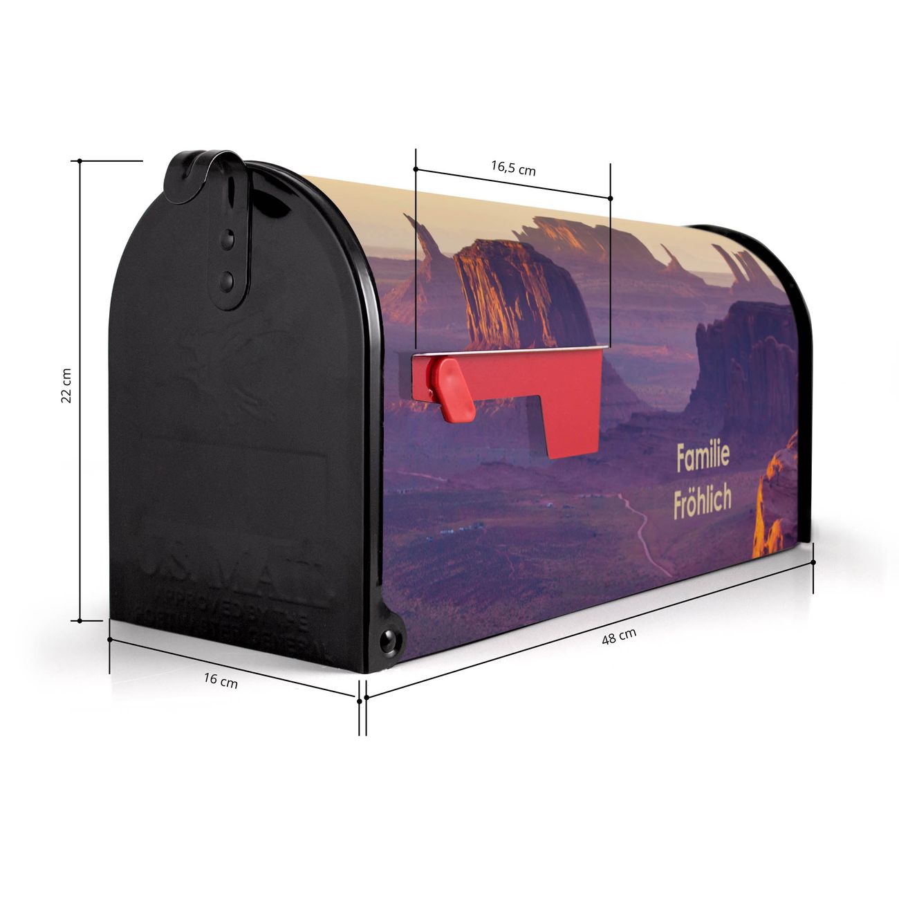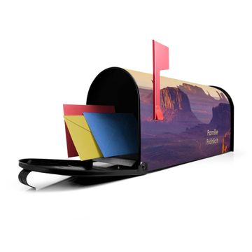 Der amerikanische Briefkasten von banjado mit Monument Valley Motiv bietet Ihnen ausreichend Fassungsvermögen, um große A4 Sendungen und Zeitschriften zu empfangen. Die typisch amerikanische rote Fahne zeigt Ihnen an, wenn Sie Post erhalten haben. Die US-Mailbox besteht aus verzinktem Stahlblech welches lackiert wurde und ist 48 x 22 x 16 CM (BxHxT) groß. Die Folie mit Motiv Monument Valley besteht aus einer wetter- und UV-resistenten Folie, die mit einem Schutzlaminat überzogen ist, sodass die US Mailbox zusätzlich vor Kratzern geschützt ist. An der Unterkante sind 4 Löcher je Seite um die Mailbox, typisch amerikanisch, an einem Holzpfahl oder einem Zaun zu befestigen. Auf Wunsch können Sie bei uns den passenden Standfuß oder die passende Wandhalterung kaufen um die US-Mailbox sicher zu befestigen. Wir bieten Ihnen ebenfalls Namensschilder, bereits beschriftet oder frei zu beschriften, und verschiedene selbst gestaltete Bitte-Keine-Werbung-Aufkleber.