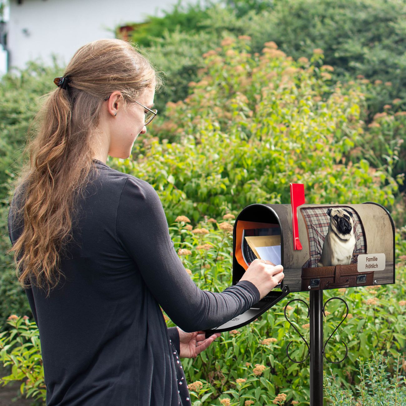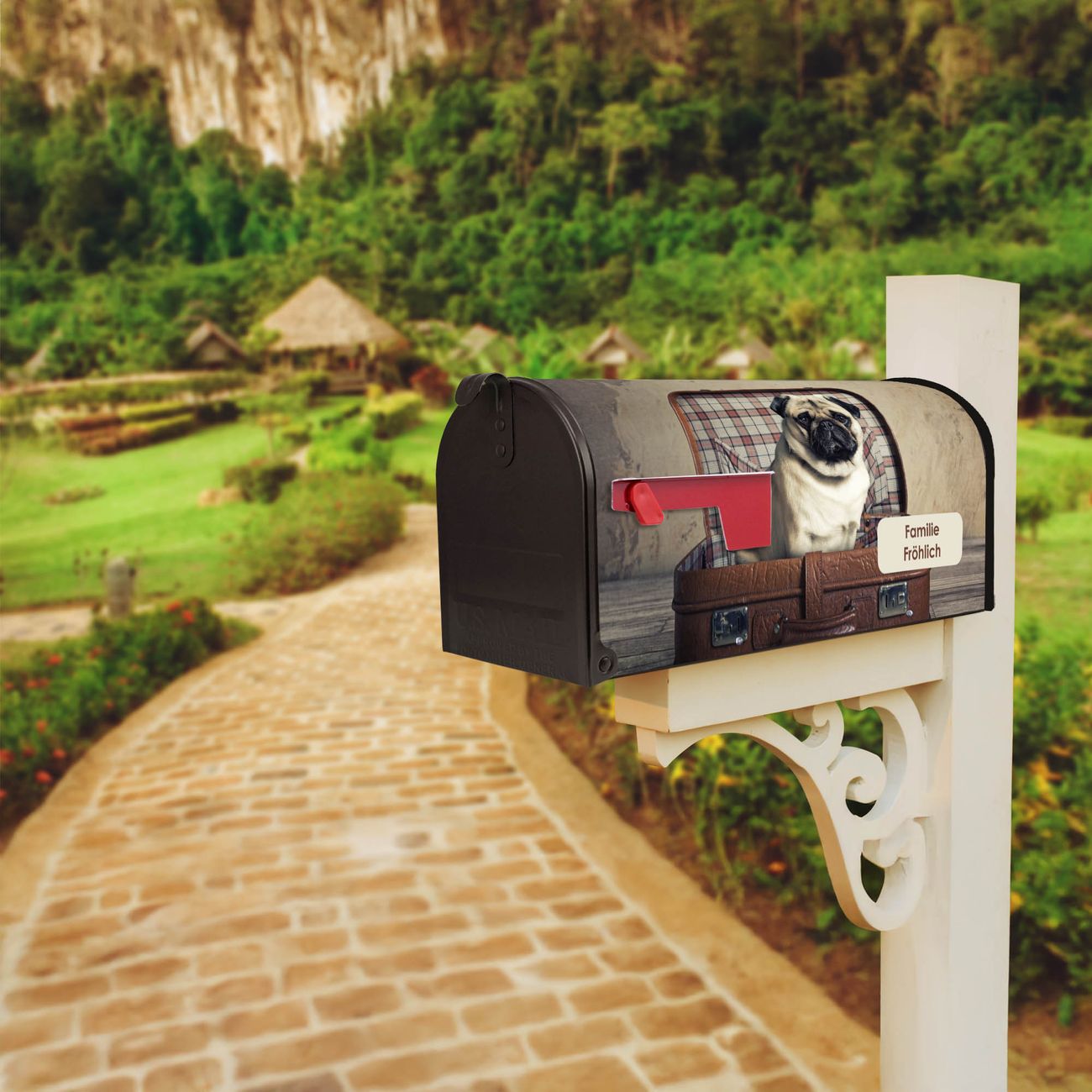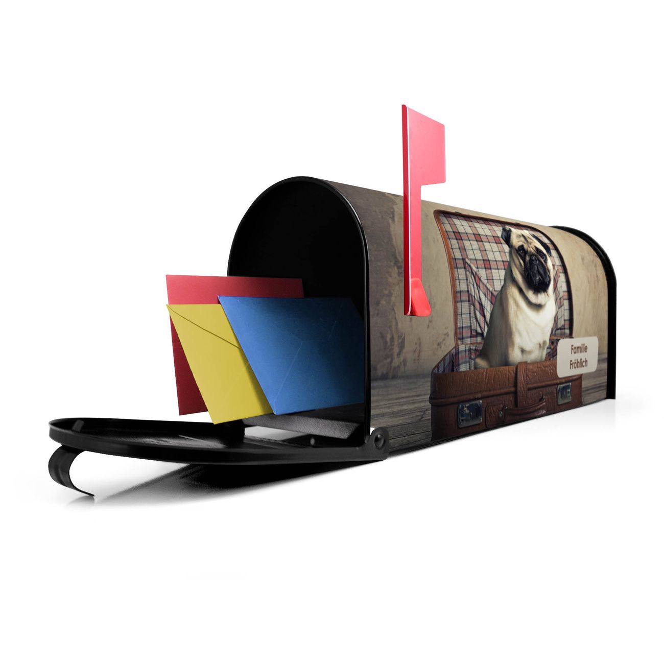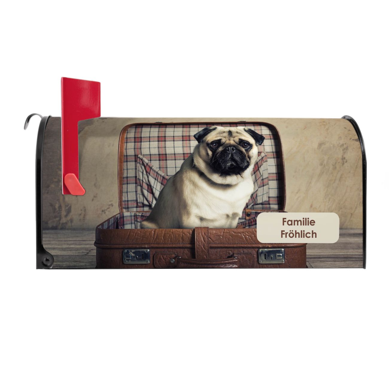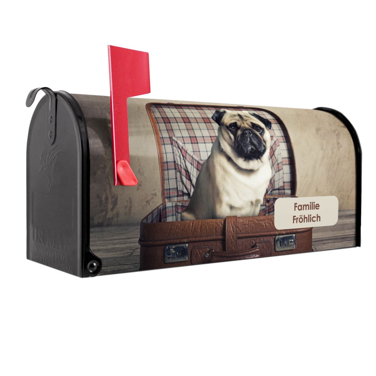 Amerikanischer Briefkasten Mops im Koffer