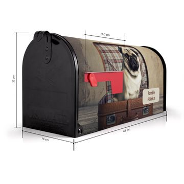 Der amerikanische Briefkasten von banjado mit Mops im Koffer Motiv bietet Ihnen ausreichend Fassungsvermögen, um große A4 Sendungen und Zeitschriften zu empfangen. Die typisch amerikanische rote Fahne zeigt Ihnen an, wenn Sie Post erhalten haben. Die US-Mailbox besteht aus verzinktem Stahlblech welches lackiert wurde und ist 48 x 22 x 16 CM (BxHxT) groß. Die Folie mit Motiv Mops im Koffer besteht aus einer wetter- und UV-resistenten Folie, die mit einem Schutzlaminat überzogen ist, sodass die US Mailbox zusätzlich vor Kratzern geschützt ist. An der Unterkante sind 4 Löcher je Seite um die Mailbox, typisch amerikanisch, an einem Holzpfahl oder einem Zaun zu befestigen. Auf Wunsch können Sie bei uns den passenden Standfuß oder die passende Wandhalterung kaufen um die US-Mailbox sicher zu befestigen. Wir bieten Ihnen ebenfalls Namensschilder, bereits beschriftet oder frei zu beschriften, und verschiedene selbst gestaltete Bitte-Keine-Werbung-Aufkleber.