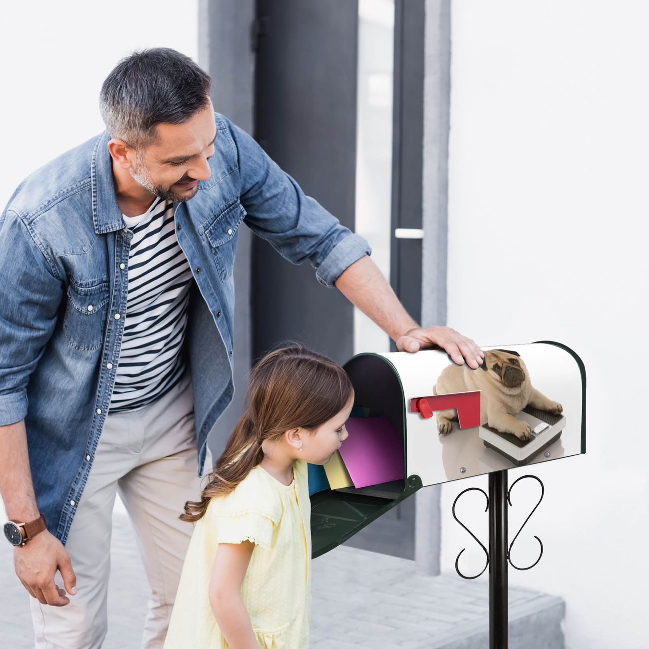 Unser amerikanischer Briefkasten mit dem Motiv Mops hat ein sehr ansprechendes und ausgefallenes Design, ist in der Grundfarbe weiß, grün oder schwarz erhältlich. Damit entlocken Sie Ihren Nachbarn und dem Postboten immer wieder ein Lächeln. Die Mailbox ist ein Original Import aus Mississippi USA und wird von unserer kleinen Manufaktur in Sachsen von Hand veredelt. Die US-Mailbox bietet ausreichend Platz auch für große Sendungen, eine Fahne die Ihnen Post anzeigt, wetterfestes und äußerst stabiles Material - so macht Post empfangen Freude.