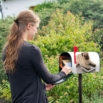 Der amerikanische Briefkasten von banjado mit Mops Motiv bietet Ihnen ausreichend Fassungsvermögen, um große A4 Sendungen und Zeitschriften zu empfangen. Die typisch amerikanische rote Fahne zeigt Ihnen an, wenn Sie Post erhalten haben. Die US-Mailbox besteht aus verzinktem Stahlblech welches lackiert wurde und ist 48 x 22 x 16 CM (BxHxT) groß. Die Folie mit Motiv Mops besteht aus einer wetter- und UV-resistenten Folie, die mit einem Schutzlaminat überzogen ist, sodass die US Mailbox zusätzlich vor Kratzern geschützt ist. An der Unterkante sind 4 Löcher je Seite um die Mailbox, typisch amerikanisch, an einem Holzpfahl oder einem Zaun zu befestigen. Auf Wunsch können Sie bei uns den passenden Standfuß oder die passende Wandhalterung kaufen um die US-Mailbox sicher zu befestigen. Wir bieten Ihnen ebenfalls Namensschilder, bereits beschriftet oder frei zu beschriften, und verschiedene selbst gestaltete Bitte-Keine-Werbung-Aufkleber.