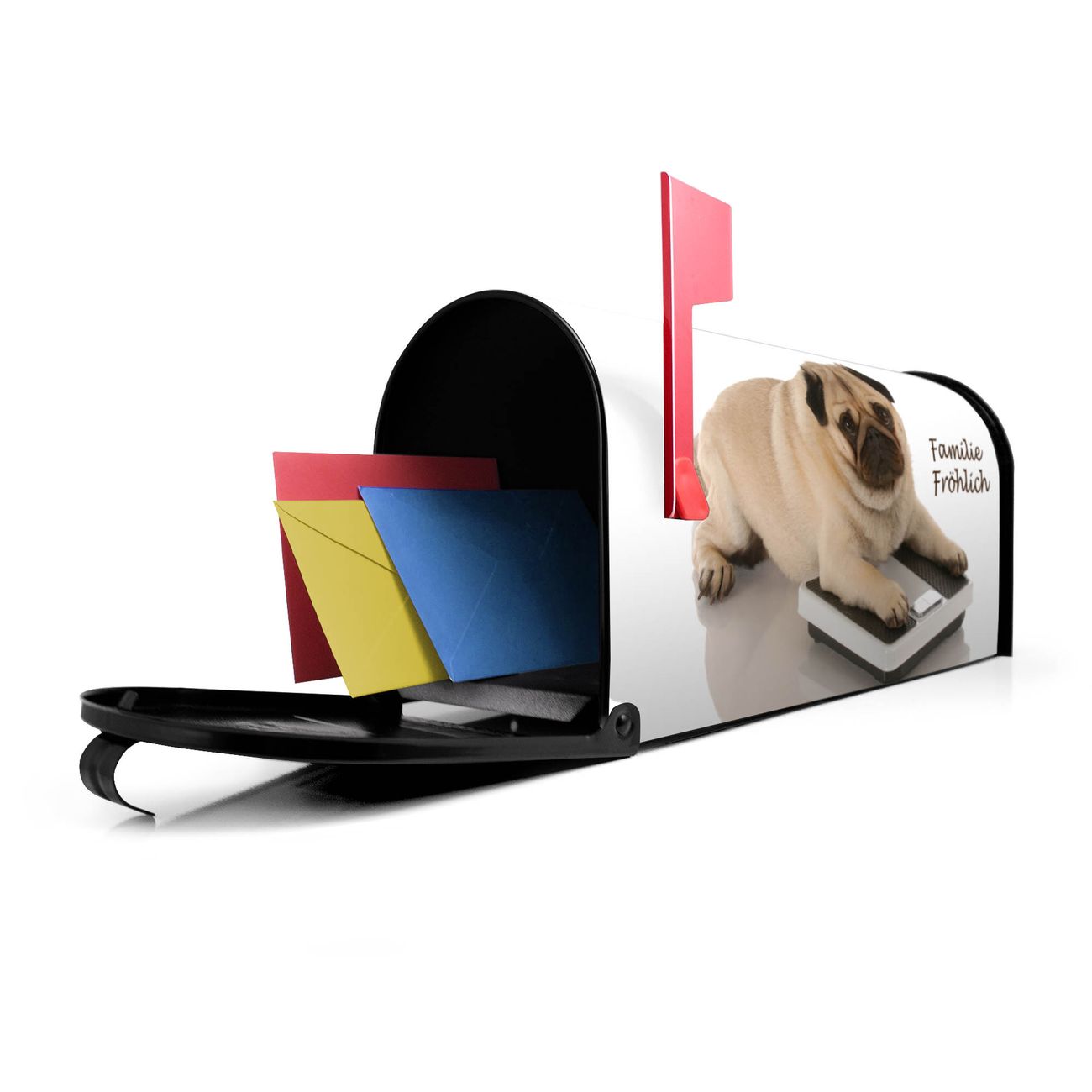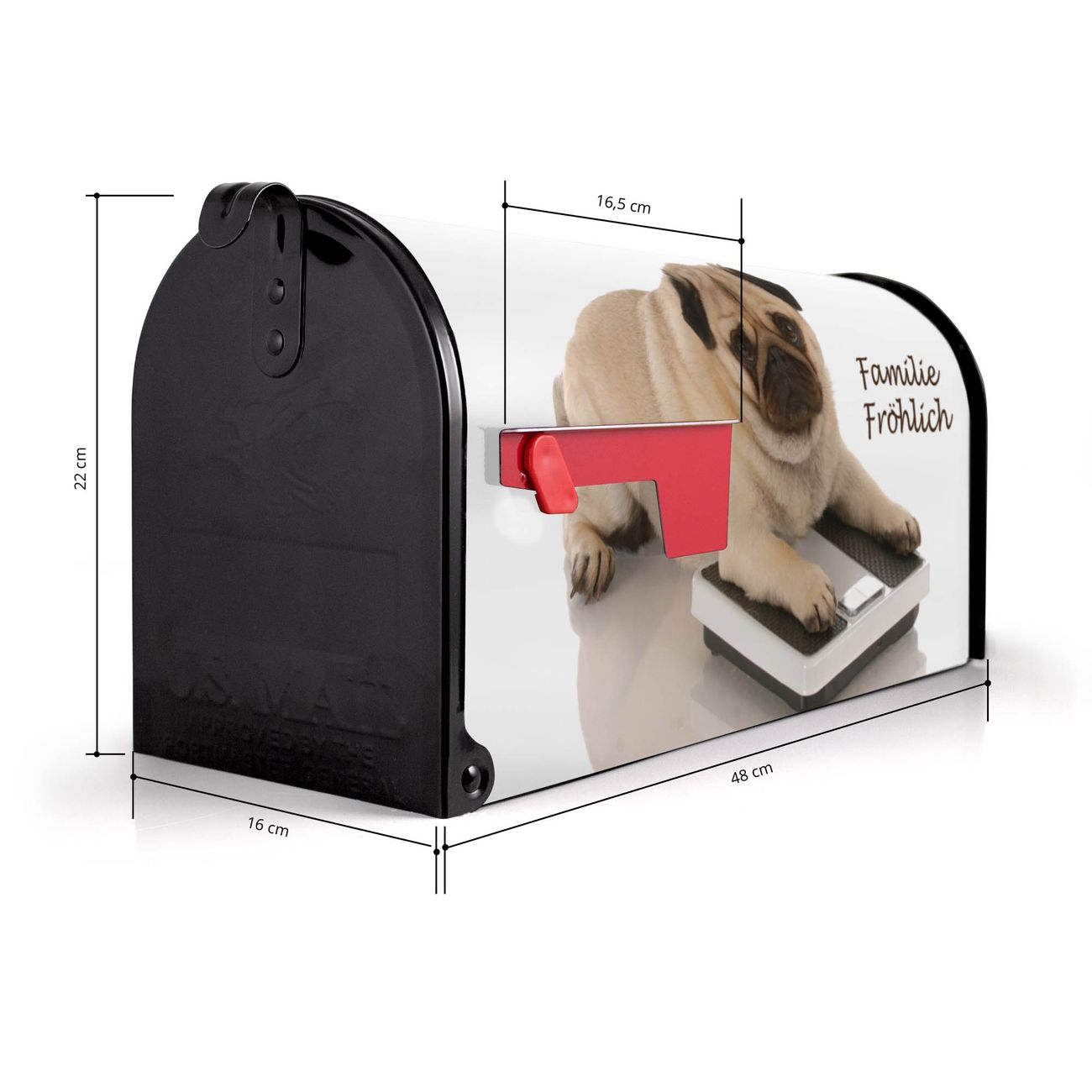 Der amerikanische Briefkasten von banjado mit Mops Motiv bietet Ihnen ausreichend Fassungsvermögen, um große A4 Sendungen und Zeitschriften zu empfangen. Die typisch amerikanische rote Fahne zeigt Ihnen an, wenn Sie Post erhalten haben. Die US-Mailbox besteht aus verzinktem Stahlblech welches lackiert wurde und ist 48 x 22 x 16 CM (BxHxT) groß. Die Folie mit Motiv Mops besteht aus einer wetter- und UV-resistenten Folie, die mit einem Schutzlaminat überzogen ist, sodass die US Mailbox zusätzlich vor Kratzern geschützt ist. An der Unterkante sind 4 Löcher je Seite um die Mailbox, typisch amerikanisch, an einem Holzpfahl oder einem Zaun zu befestigen. Auf Wunsch können Sie bei uns den passenden Standfuß oder die passende Wandhalterung kaufen um die US-Mailbox sicher zu befestigen. Wir bieten Ihnen ebenfalls Namensschilder, bereits beschriftet oder frei zu beschriften, und verschiedene selbst gestaltete Bitte-Keine-Werbung-Aufkleber.