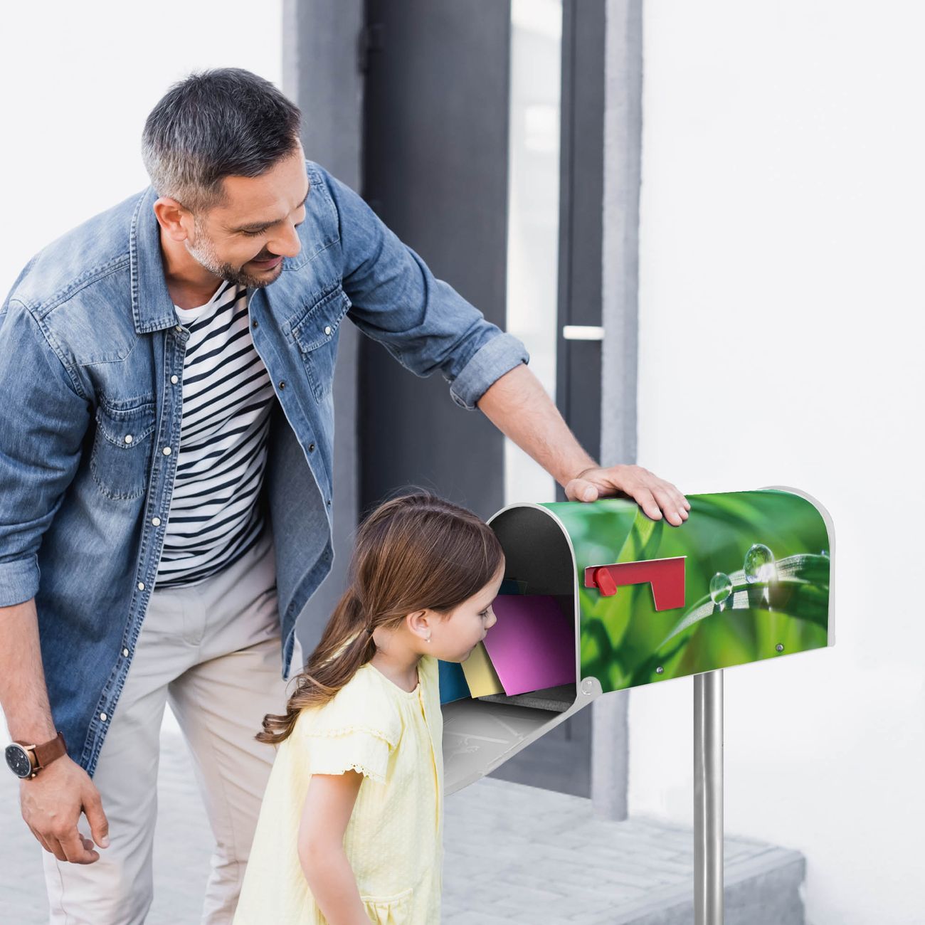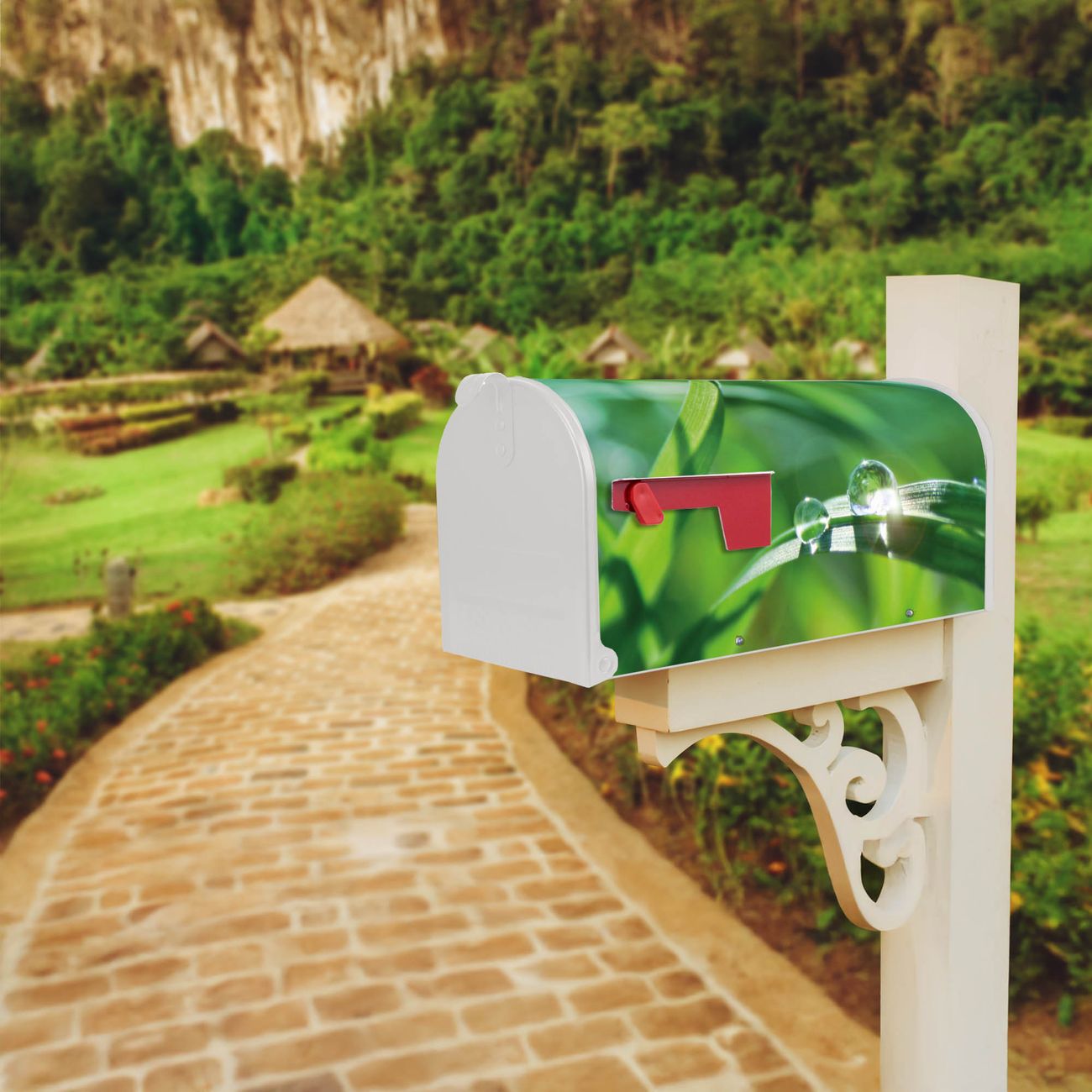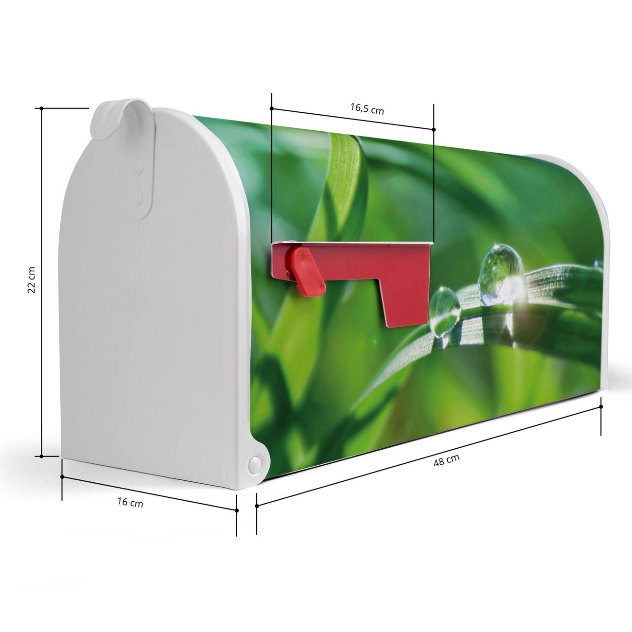 Der amerikanische Briefkasten von banjado mit Morgentau Motiv bietet Ihnen ausreichend Fassungsvermögen, um große A4 Sendungen und Zeitschriften zu empfangen. Die typisch amerikanische rote Fahne zeigt Ihnen an, wenn Sie Post erhalten haben. Die US-Mailbox besteht aus verzinktem Stahlblech welches lackiert wurde und ist 48 x 22 x 16 CM (BxHxT) groß. Die Folie mit Motiv Morgentau besteht aus einer wetter- und UV-resistenten Folie, die mit einem Schutzlaminat überzogen ist, sodass die US Mailbox zusätzlich vor Kratzern geschützt ist. An der Unterkante sind 4 Löcher je Seite um die Mailbox, typisch amerikanisch, an einem Holzpfahl oder einem Zaun zu befestigen. Auf Wunsch können Sie bei uns den passenden Standfuß oder die passende Wandhalterung kaufen um die US-Mailbox sicher zu befestigen. Wir bieten Ihnen ebenfalls Namensschilder, bereits beschriftet oder frei zu beschriften, und verschiedene selbst gestaltete Bitte-Keine-Werbung-Aufkleber.