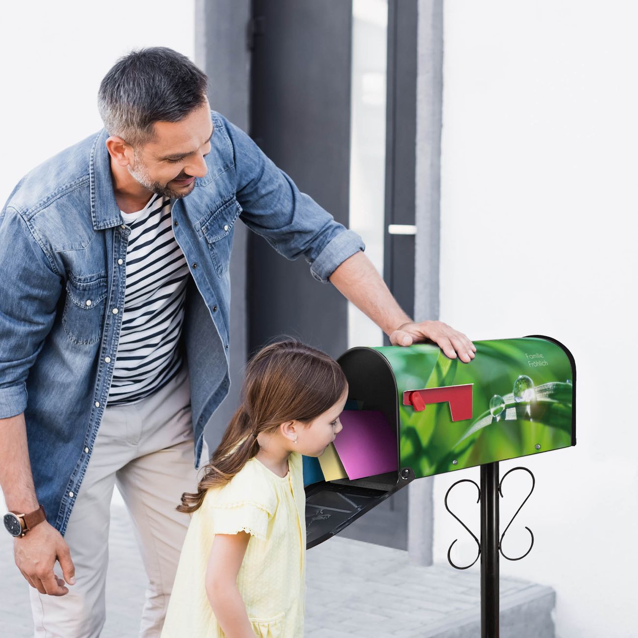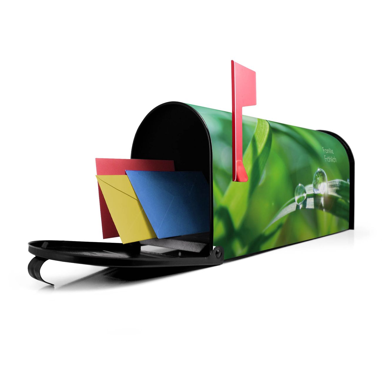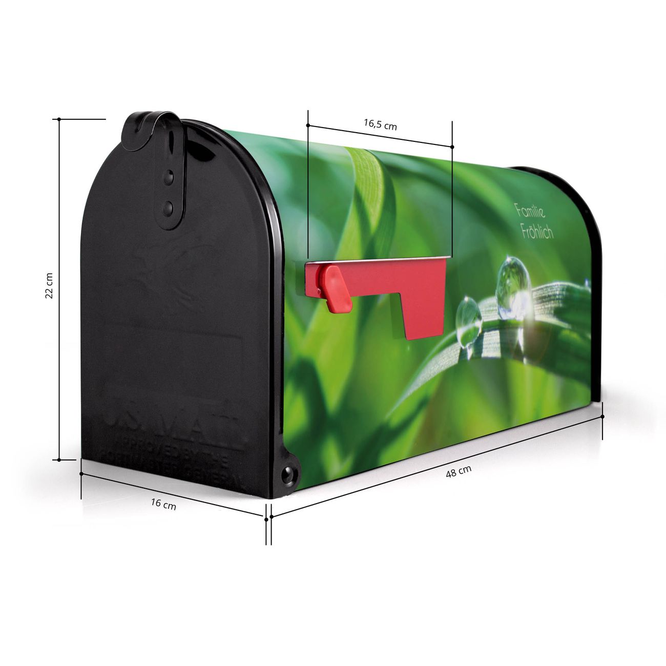 Der amerikanische Briefkasten von banjado mit Morgentau Motiv bietet Ihnen ausreichend Fassungsvermögen, um große A4 Sendungen und Zeitschriften zu empfangen. Die typisch amerikanische rote Fahne zeigt Ihnen an, wenn Sie Post erhalten haben. Die US-Mailbox besteht aus verzinktem Stahlblech welches lackiert wurde und ist 48 x 22 x 16 CM (BxHxT) groß. Die Folie mit Motiv Morgentau besteht aus einer wetter- und UV-resistenten Folie, die mit einem Schutzlaminat überzogen ist, sodass die US Mailbox zusätzlich vor Kratzern geschützt ist. An der Unterkante sind 4 Löcher je Seite um die Mailbox, typisch amerikanisch, an einem Holzpfahl oder einem Zaun zu befestigen. Auf Wunsch können Sie bei uns den passenden Standfuß oder die passende Wandhalterung kaufen um die US-Mailbox sicher zu befestigen. Wir bieten Ihnen ebenfalls Namensschilder, bereits beschriftet oder frei zu beschriften, und verschiedene selbst gestaltete Bitte-Keine-Werbung-Aufkleber.