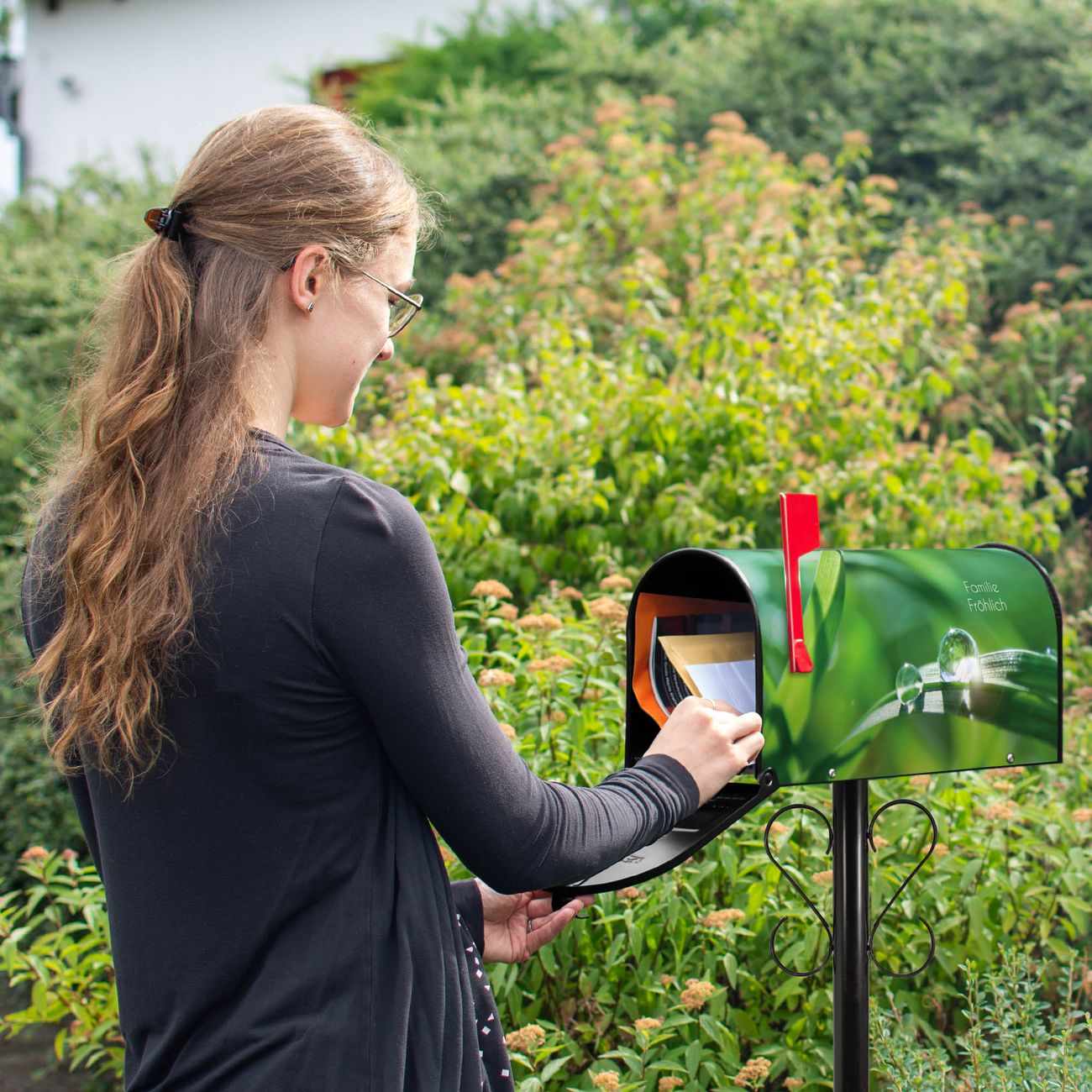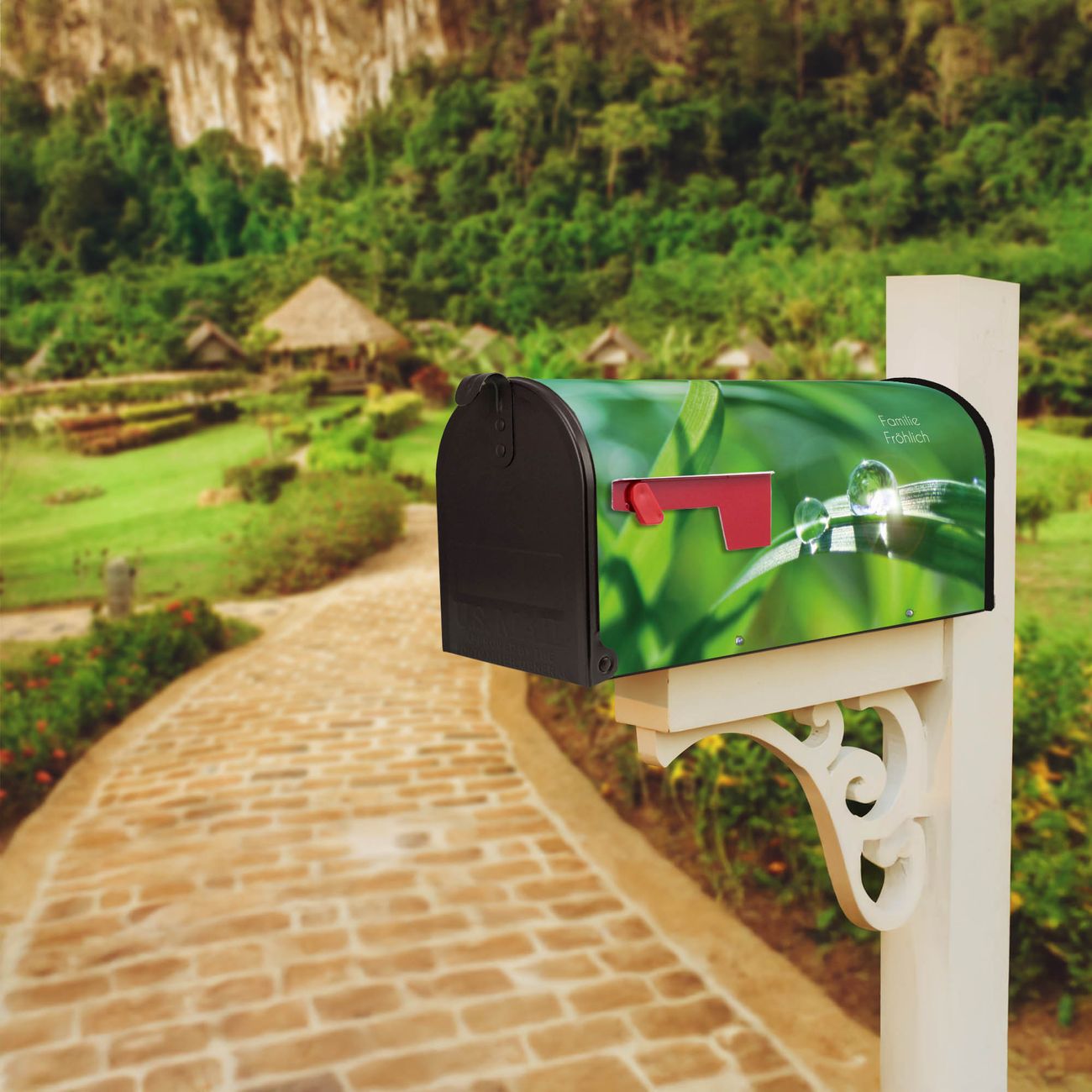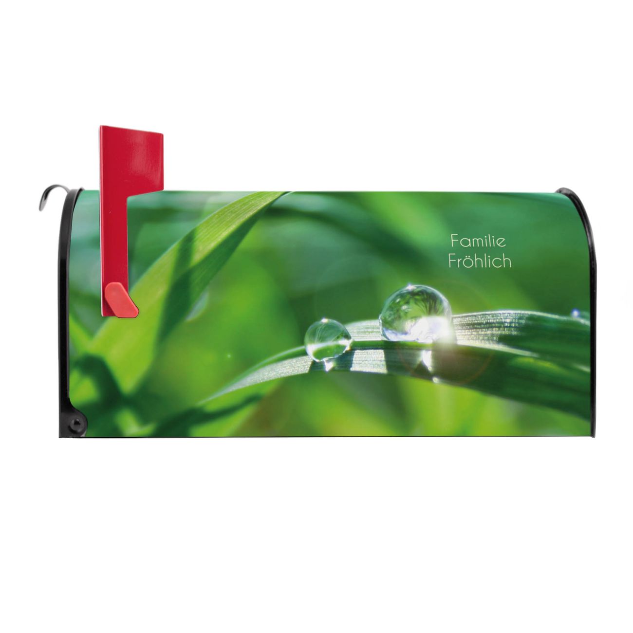 Der amerikanische Briefkasten von banjado mit Morgentau Motiv bietet Ihnen ausreichend Fassungsvermögen, um große A4 Sendungen und Zeitschriften zu empfangen. Die typisch amerikanische rote Fahne zeigt Ihnen an, wenn Sie Post erhalten haben. Die US-Mailbox besteht aus verzinktem Stahlblech welches lackiert wurde und ist 48 x 22 x 16 CM (BxHxT) groß. Die Folie mit Motiv Morgentau besteht aus einer wetter- und UV-resistenten Folie, die mit einem Schutzlaminat überzogen ist, sodass die US Mailbox zusätzlich vor Kratzern geschützt ist. An der Unterkante sind 4 Löcher je Seite um die Mailbox, typisch amerikanisch, an einem Holzpfahl oder einem Zaun zu befestigen. Auf Wunsch können Sie bei uns den passenden Standfuß oder die passende Wandhalterung kaufen um die US-Mailbox sicher zu befestigen. Wir bieten Ihnen ebenfalls Namensschilder, bereits beschriftet oder frei zu beschriften, und verschiedene selbst gestaltete Bitte-Keine-Werbung-Aufkleber.