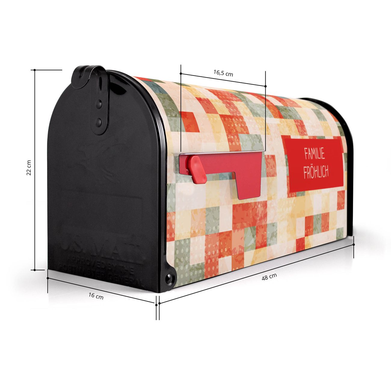 Der amerikanische Briefkasten von banjado mit Mosaik Rot Motiv bietet Ihnen ausreichend Fassungsvermögen, um große A4 Sendungen und Zeitschriften zu empfangen. Die typisch amerikanische rote Fahne zeigt Ihnen an, wenn Sie Post erhalten haben. Die US-Mailbox besteht aus verzinktem Stahlblech welches lackiert wurde und ist 48 x 22 x 16 CM (BxHxT) groß. Die Folie mit Motiv Mosaik Rot besteht aus einer wetter- und UV-resistenten Folie, die mit einem Schutzlaminat überzogen ist, sodass die US Mailbox zusätzlich vor Kratzern geschützt ist. An der Unterkante sind 4 Löcher je Seite um die Mailbox, typisch amerikanisch, an einem Holzpfahl oder einem Zaun zu befestigen. Auf Wunsch können Sie bei uns den passenden Standfuß oder die passende Wandhalterung kaufen um die US-Mailbox sicher zu befestigen. Wir bieten Ihnen ebenfalls Namensschilder, bereits beschriftet oder frei zu beschriften, und verschiedene selbst gestaltete Bitte-Keine-Werbung-Aufkleber.
