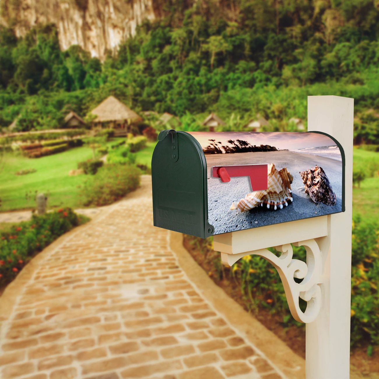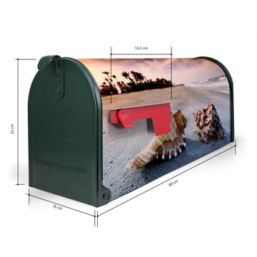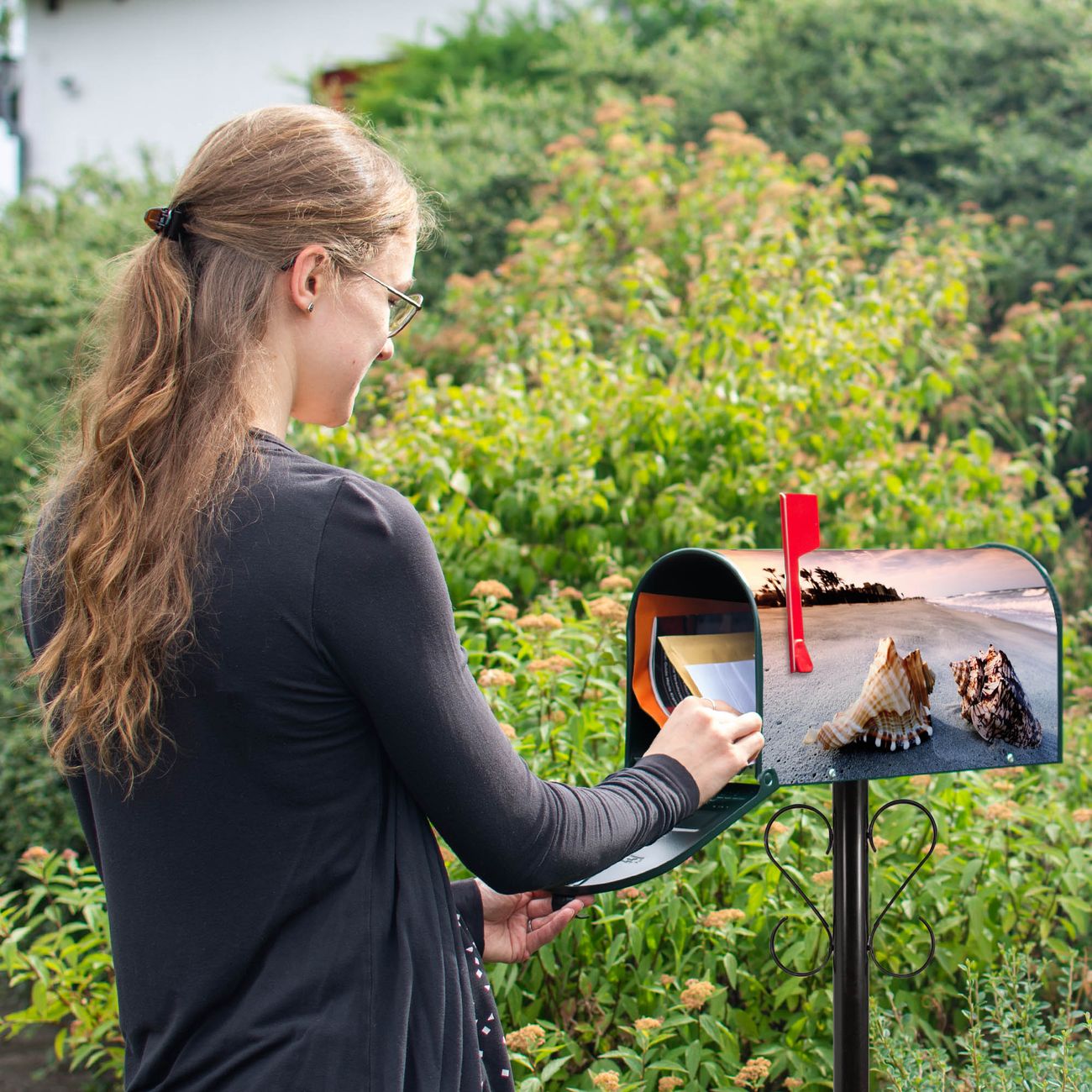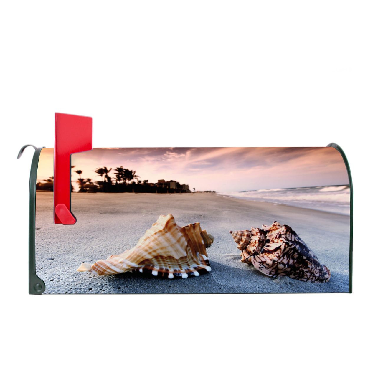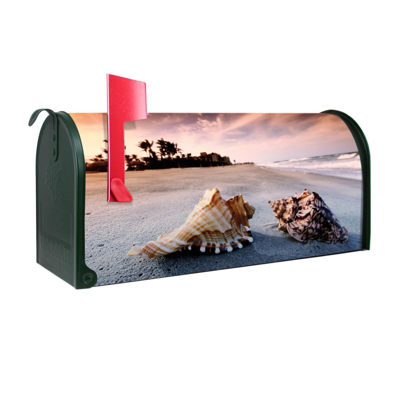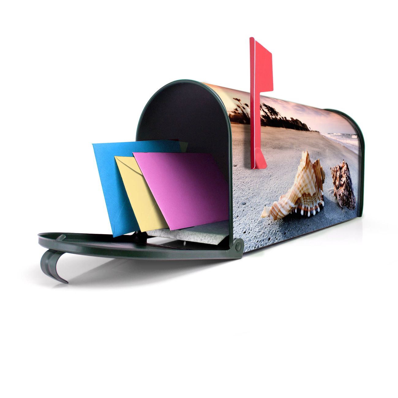 Der amerikanische Briefkasten von banjado mit Muscheln Motiv bietet Ihnen ausreichend Fassungsvermögen, um große A4 Sendungen und Zeitschriften zu empfangen. Die typisch amerikanische rote Fahne zeigt Ihnen an, wenn Sie Post erhalten haben. Die US-Mailbox besteht aus verzinktem Stahlblech welches lackiert wurde und ist 48 x 22 x 16 CM (BxHxT) groß. Die Folie mit Motiv Muscheln besteht aus einer wetter- und UV-resistenten Folie, die mit einem Schutzlaminat überzogen ist, sodass die US Mailbox zusätzlich vor Kratzern geschützt ist. An der Unterkante sind 4 Löcher je Seite um die Mailbox, typisch amerikanisch, an einem Holzpfahl oder einem Zaun zu befestigen. Auf Wunsch können Sie bei uns den passenden Standfuß oder die passende Wandhalterung kaufen um die US-Mailbox sicher zu befestigen. Wir bieten Ihnen ebenfalls Namensschilder, bereits beschriftet oder frei zu beschriften, und verschiedene selbst gestaltete Bitte-Keine-Werbung-Aufkleber.