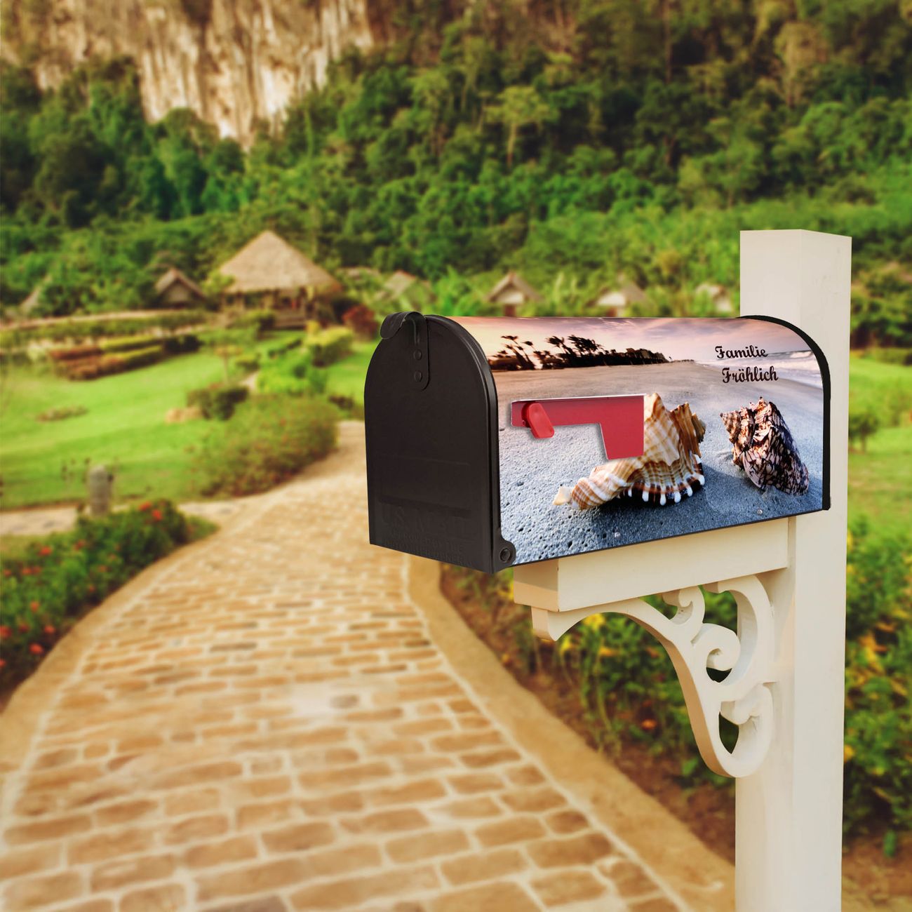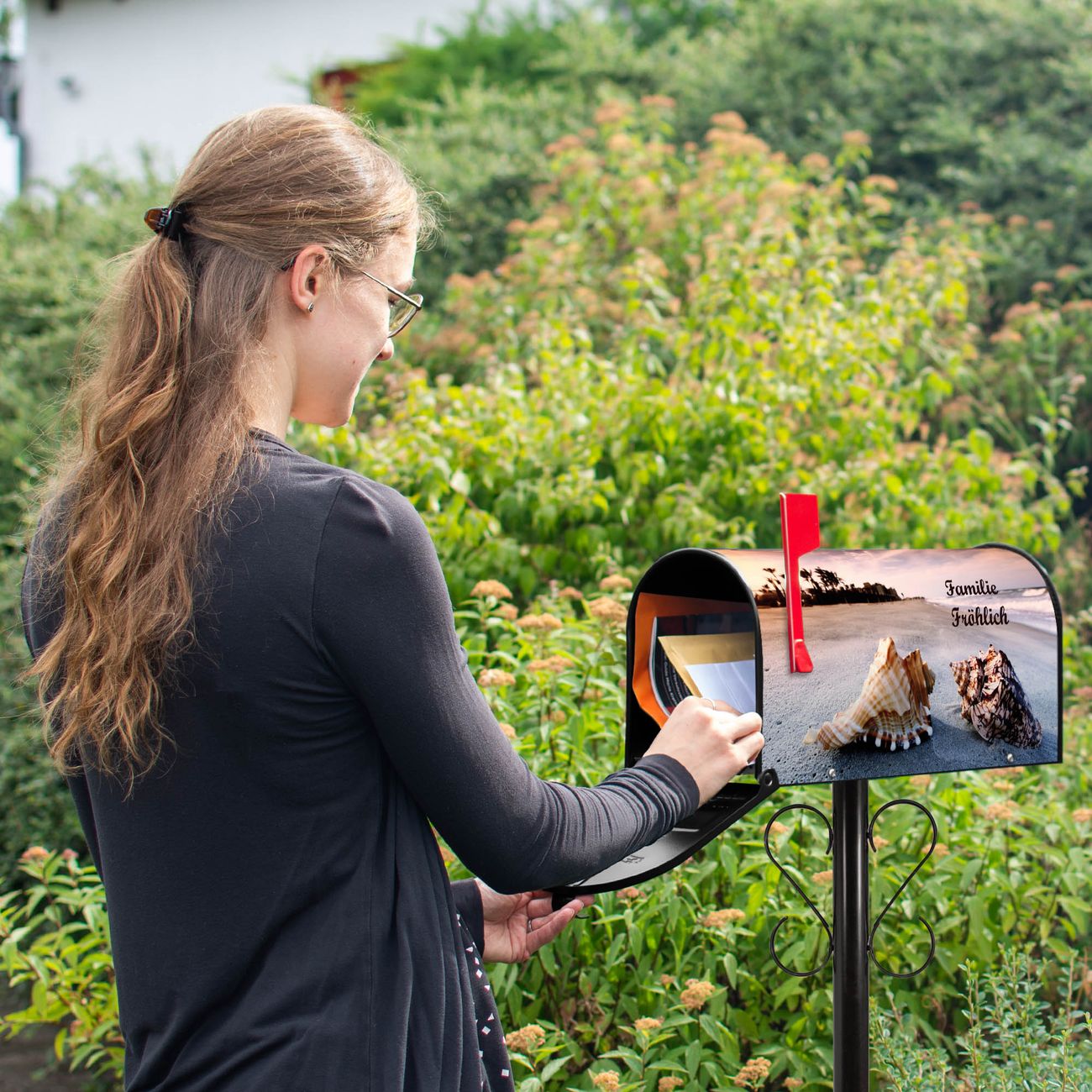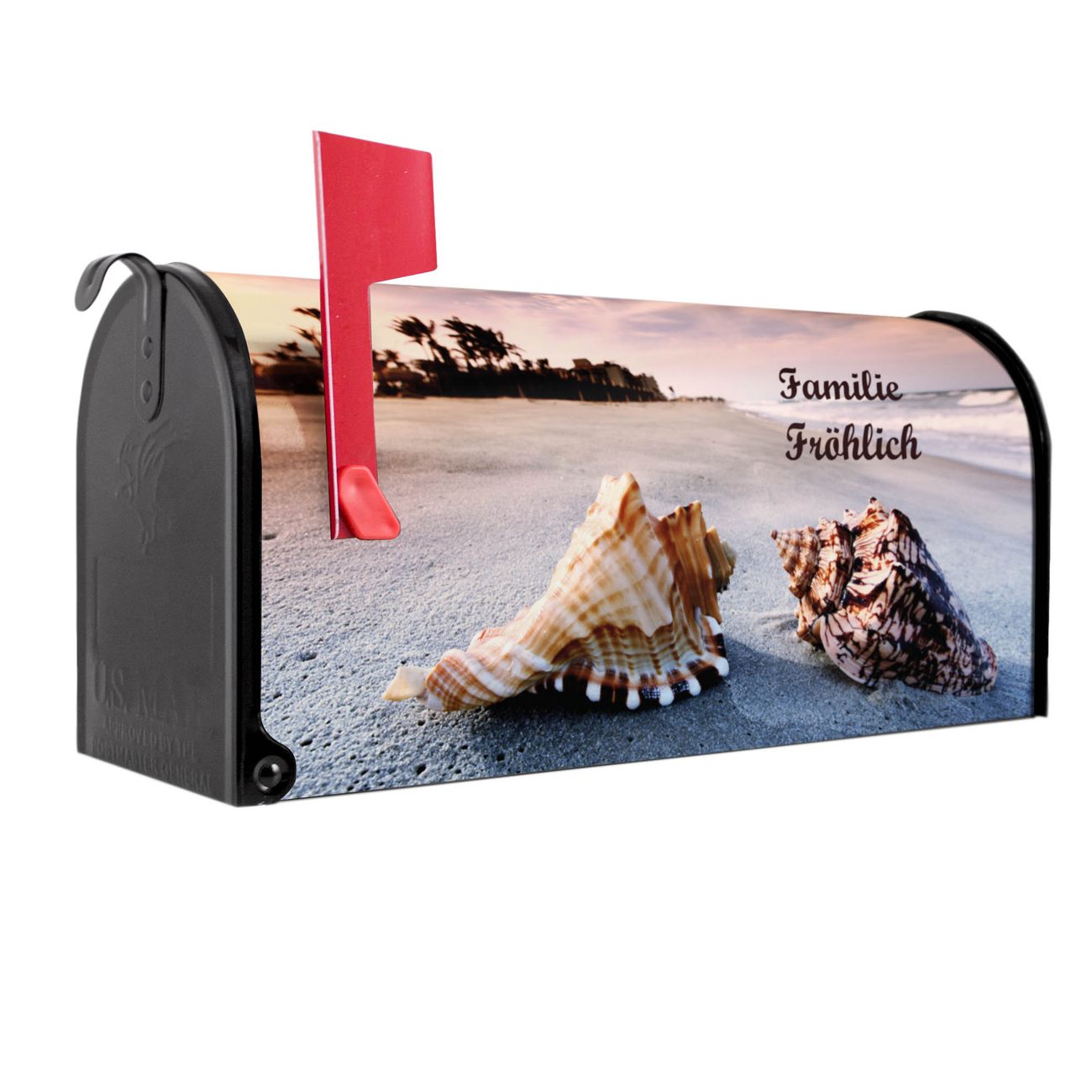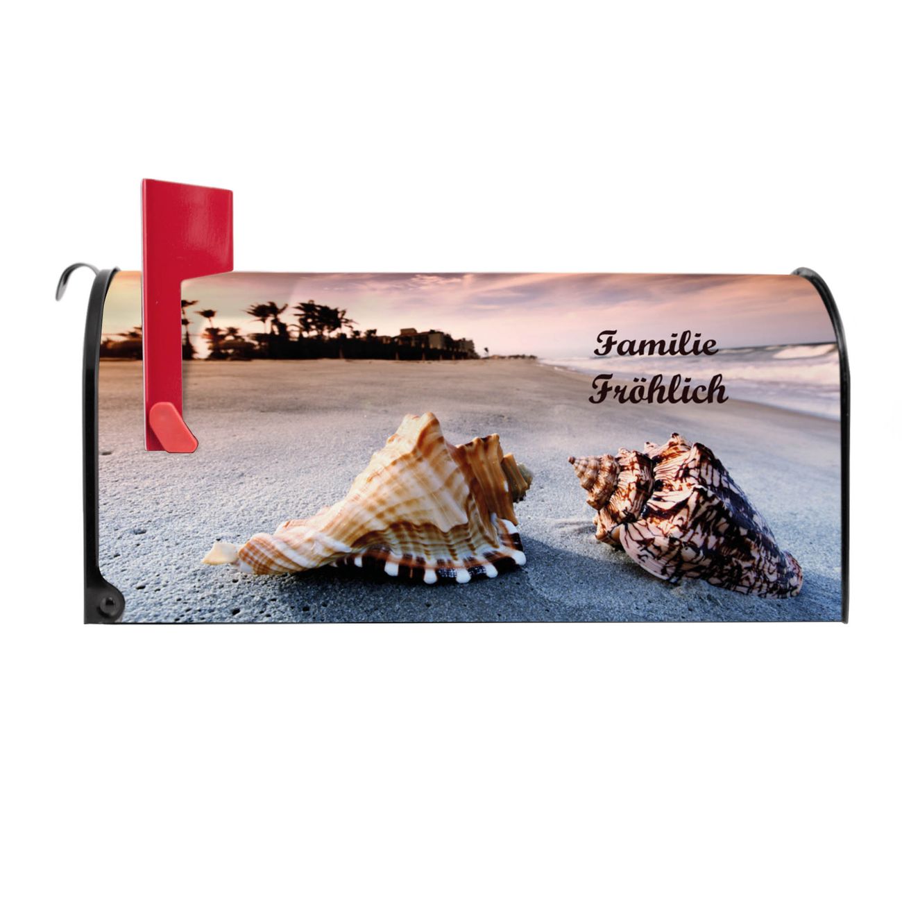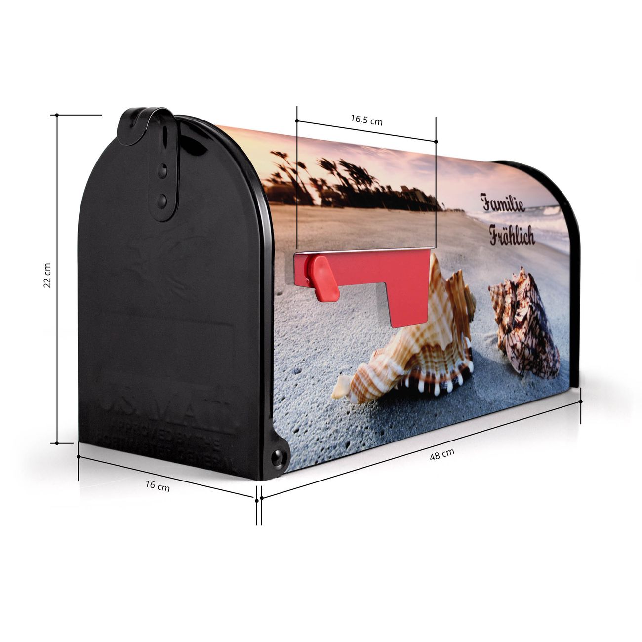 Der amerikanische Briefkasten von banjado mit Muscheln Motiv bietet Ihnen ausreichend Fassungsvermögen, um große A4 Sendungen und Zeitschriften zu empfangen. Die typisch amerikanische rote Fahne zeigt Ihnen an, wenn Sie Post erhalten haben. Die US-Mailbox besteht aus verzinktem Stahlblech welches lackiert wurde und ist 48 x 22 x 16 CM (BxHxT) groß. Die Folie mit Motiv Muscheln besteht aus einer wetter- und UV-resistenten Folie, die mit einem Schutzlaminat überzogen ist, sodass die US Mailbox zusätzlich vor Kratzern geschützt ist. An der Unterkante sind 4 Löcher je Seite um die Mailbox, typisch amerikanisch, an einem Holzpfahl oder einem Zaun zu befestigen. Auf Wunsch können Sie bei uns den passenden Standfuß oder die passende Wandhalterung kaufen um die US-Mailbox sicher zu befestigen. Wir bieten Ihnen ebenfalls Namensschilder, bereits beschriftet oder frei zu beschriften, und verschiedene selbst gestaltete Bitte-Keine-Werbung-Aufkleber.