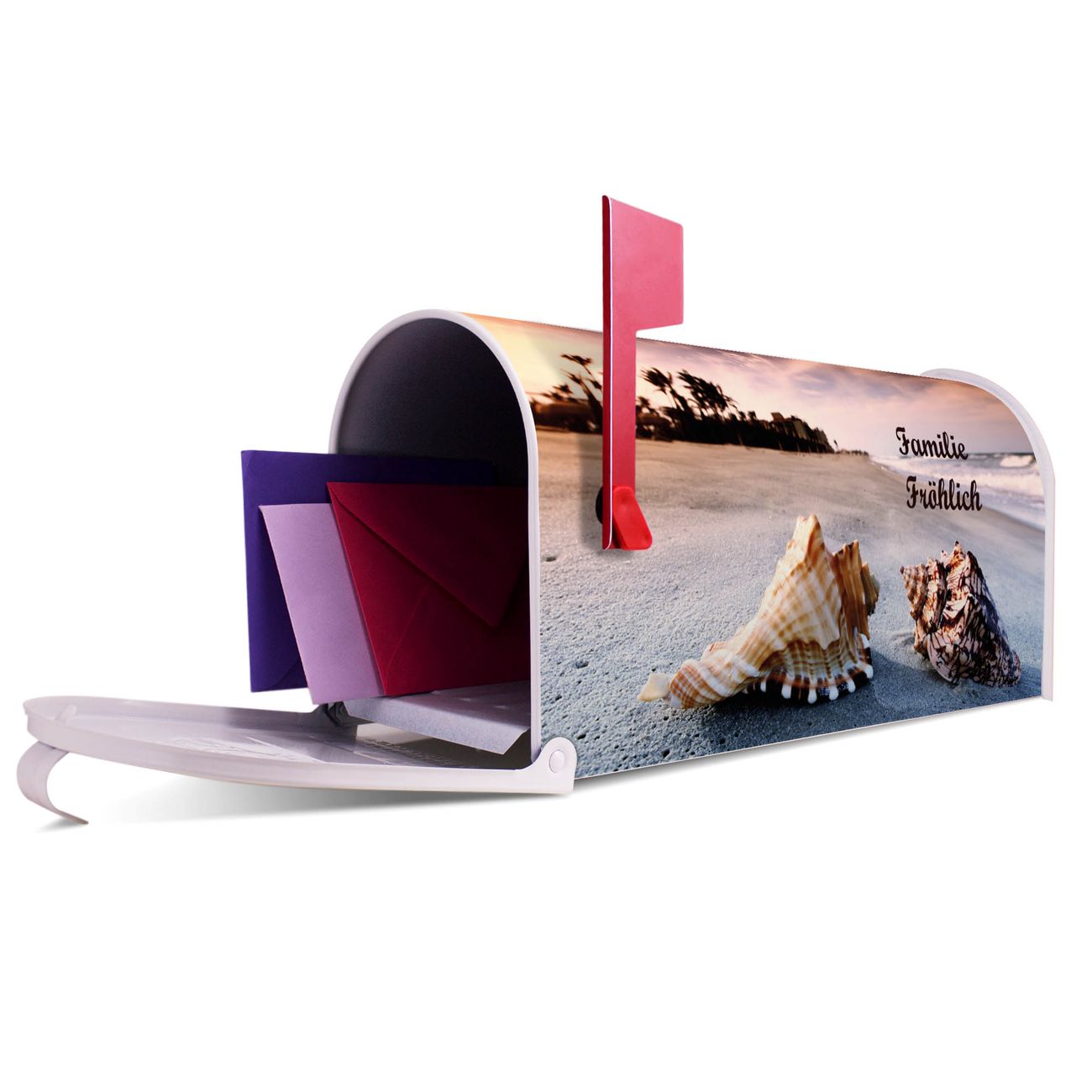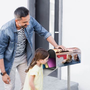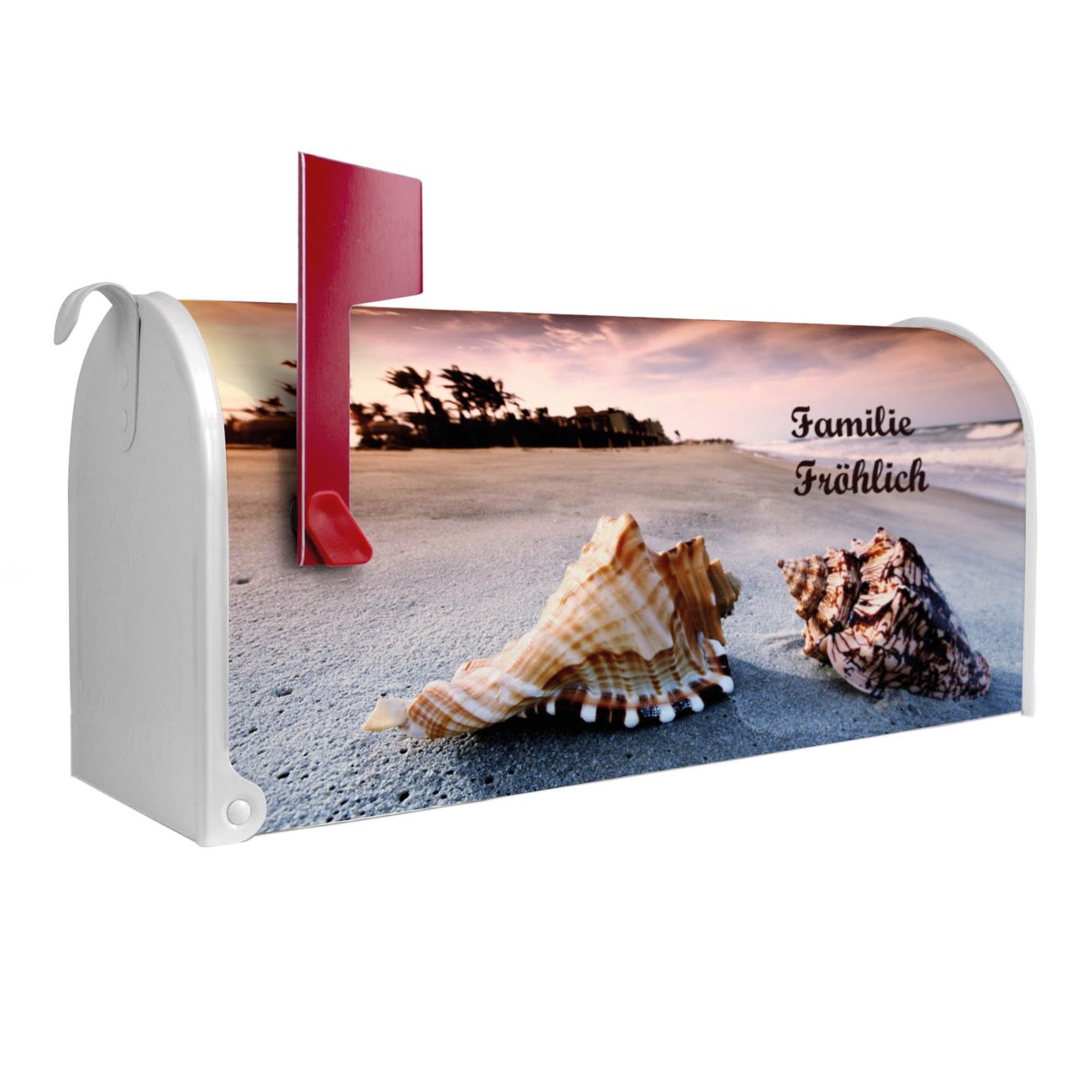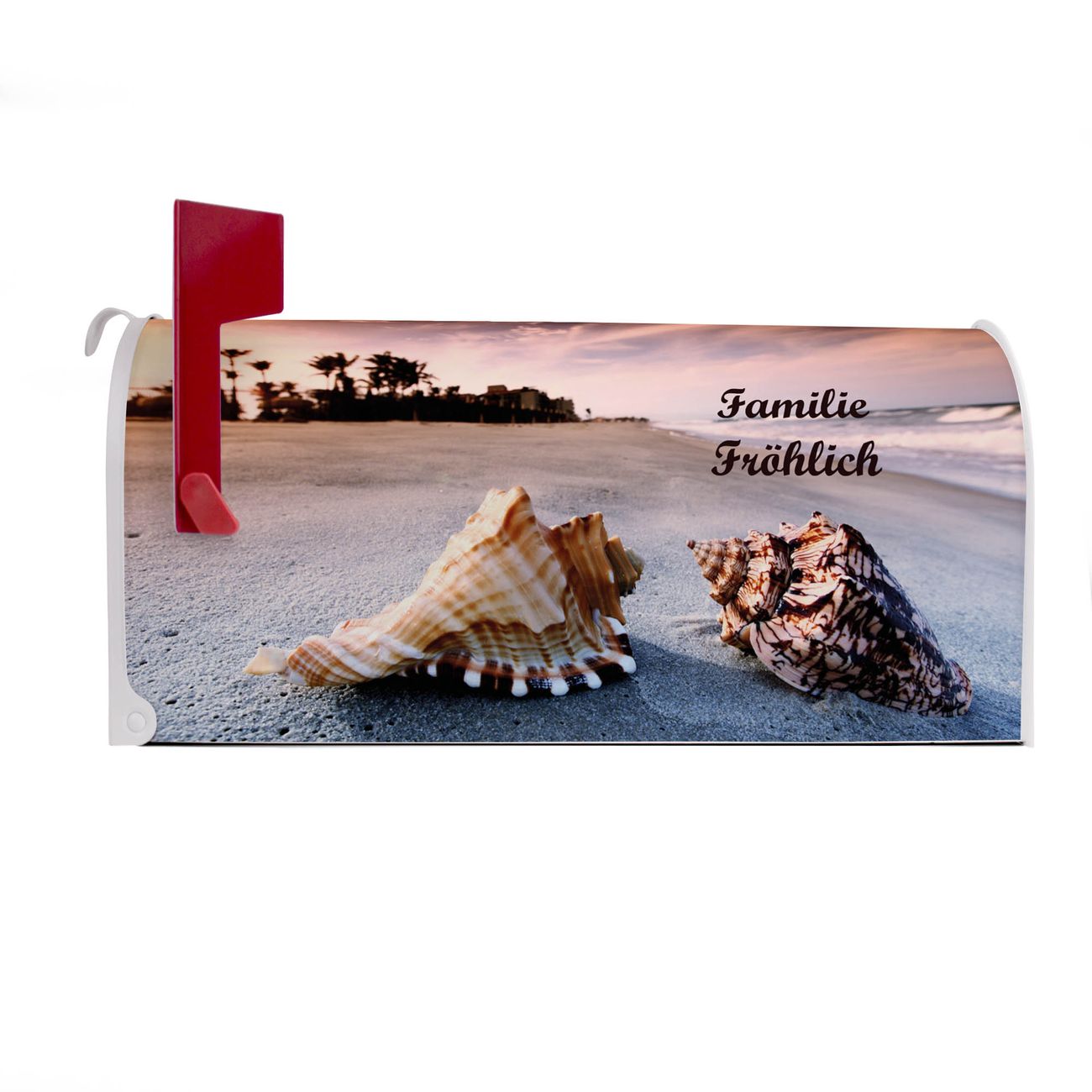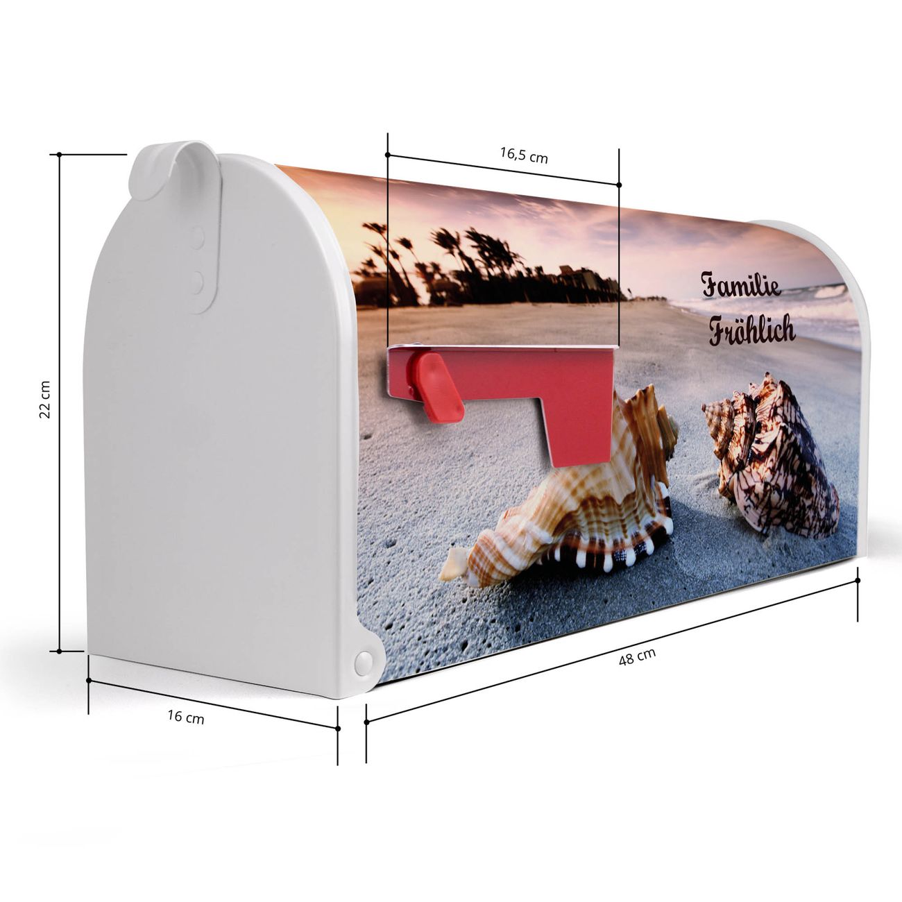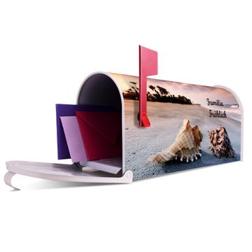 Der amerikanische Briefkasten von banjado mit Muscheln Motiv bietet Ihnen ausreichend Fassungsvermögen, um große A4 Sendungen und Zeitschriften zu empfangen. Die typisch amerikanische rote Fahne zeigt Ihnen an, wenn Sie Post erhalten haben. Die US-Mailbox besteht aus verzinktem Stahlblech welches lackiert wurde und ist 48 x 22 x 16 CM (BxHxT) groß. Die Folie mit Motiv Muscheln besteht aus einer wetter- und UV-resistenten Folie, die mit einem Schutzlaminat überzogen ist, sodass die US Mailbox zusätzlich vor Kratzern geschützt ist. An der Unterkante sind 4 Löcher je Seite um die Mailbox, typisch amerikanisch, an einem Holzpfahl oder einem Zaun zu befestigen. Auf Wunsch können Sie bei uns den passenden Standfuß oder die passende Wandhalterung kaufen um die US-Mailbox sicher zu befestigen. Wir bieten Ihnen ebenfalls Namensschilder, bereits beschriftet oder frei zu beschriften, und verschiedene selbst gestaltete Bitte-Keine-Werbung-Aufkleber.