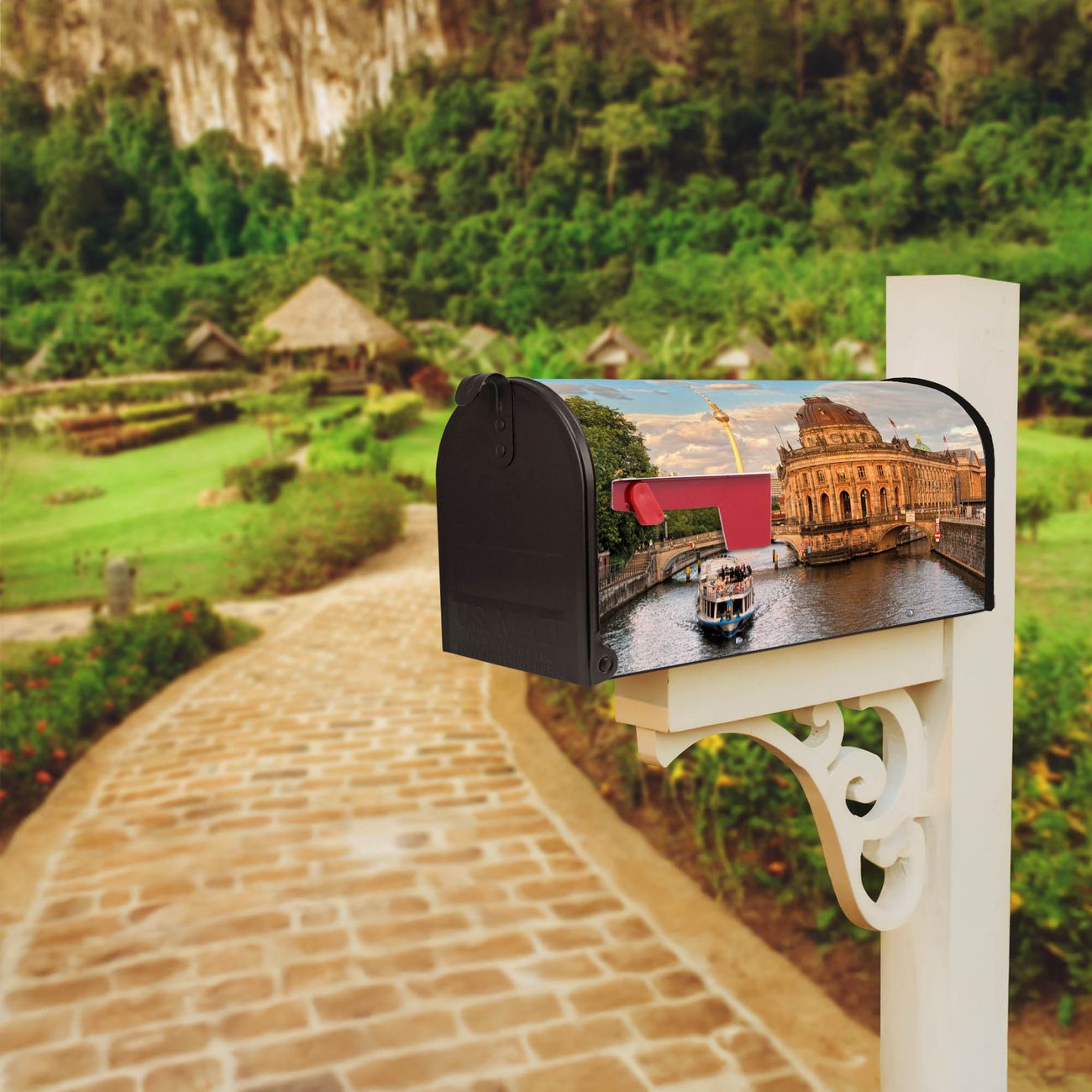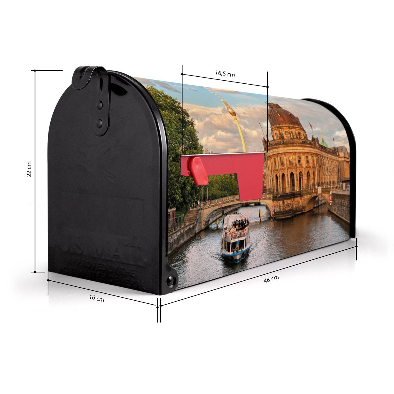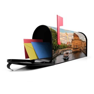 Der amerikanische Briefkasten von banjado mit Museumsinsel Motiv bietet Ihnen ausreichend Fassungsvermögen, um große A4 Sendungen und Zeitschriften zu empfangen. Die typisch amerikanische rote Fahne zeigt Ihnen an, wenn Sie Post erhalten haben. Die US-Mailbox besteht aus verzinktem Stahlblech welches lackiert wurde und ist 48 x 22 x 16 CM (BxHxT) groß. Die Folie mit Motiv Museumsinsel besteht aus einer wetter- und UV-resistenten Folie, die mit einem Schutzlaminat überzogen ist, sodass die US Mailbox zusätzlich vor Kratzern geschützt ist. An der Unterkante sind 4 Löcher je Seite um die Mailbox, typisch amerikanisch, an einem Holzpfahl oder einem Zaun zu befestigen. Auf Wunsch können Sie bei uns den passenden Standfuß oder die passende Wandhalterung kaufen um die US-Mailbox sicher zu befestigen. Wir bieten Ihnen ebenfalls Namensschilder, bereits beschriftet oder frei zu beschriften, und verschiedene selbst gestaltete Bitte-Keine-Werbung-Aufkleber.