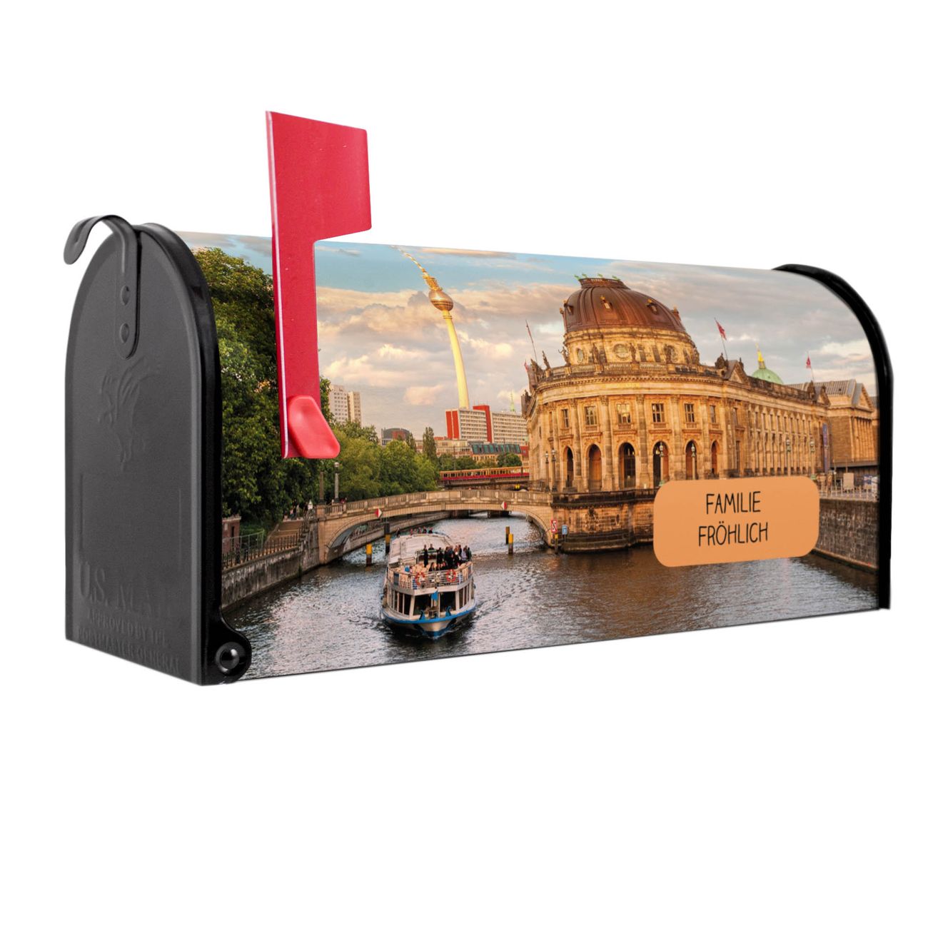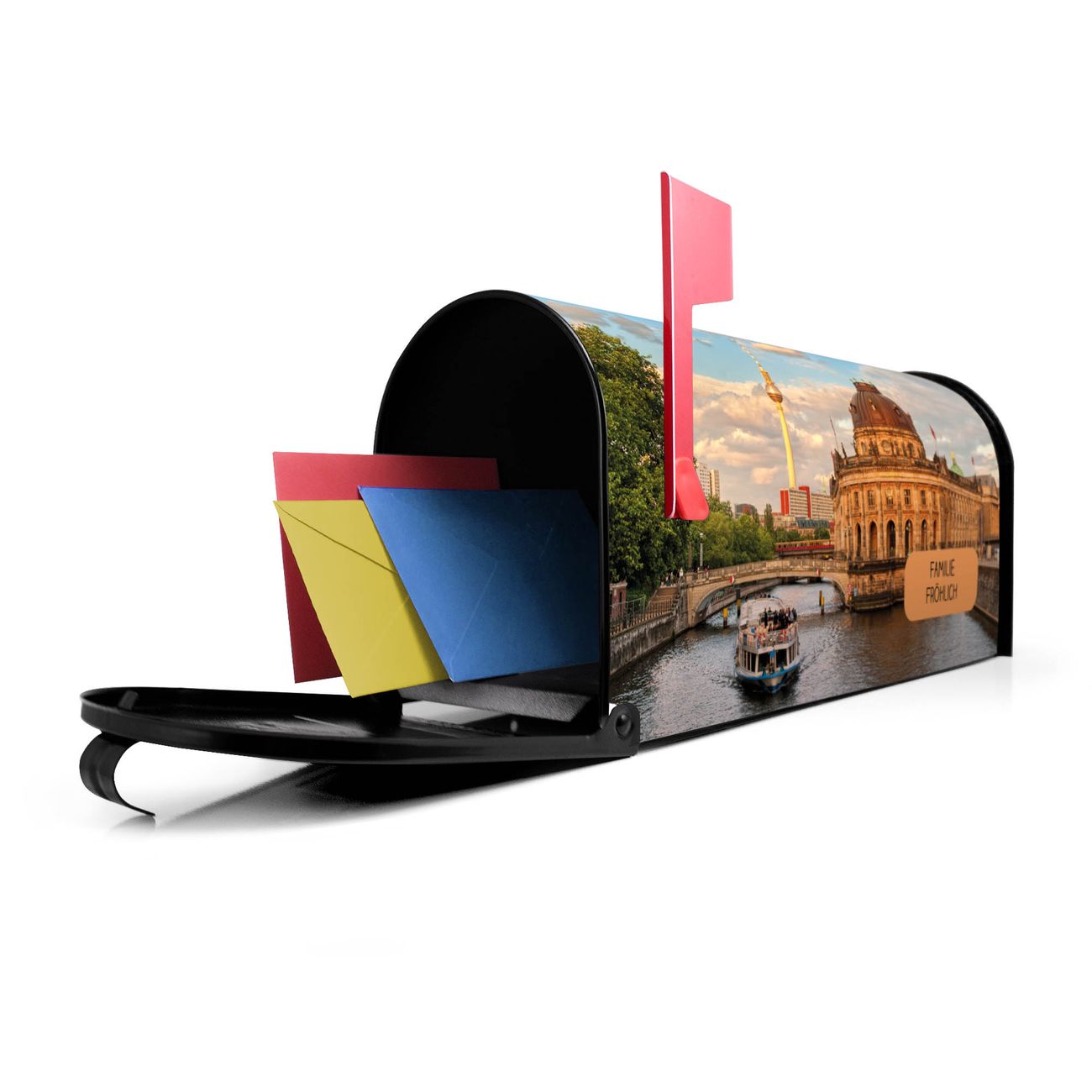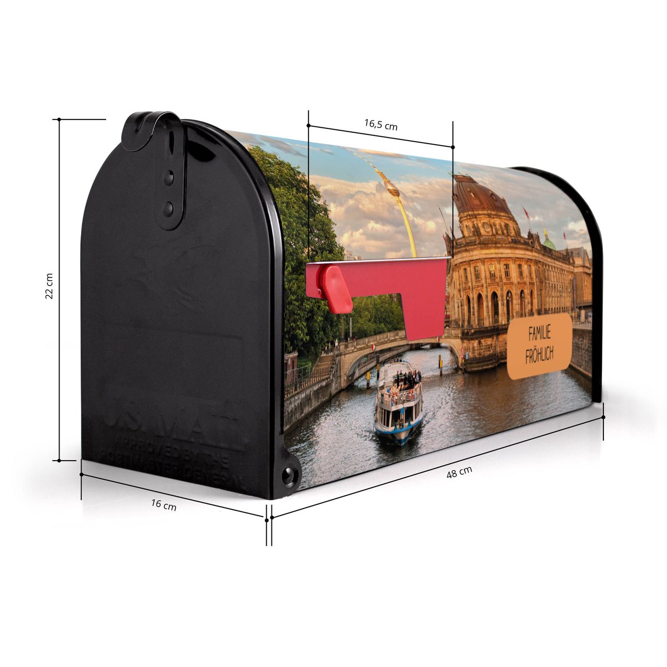 Der amerikanische Briefkasten von banjado mit Museumsinsel Motiv bietet Ihnen ausreichend Fassungsvermögen, um große A4 Sendungen und Zeitschriften zu empfangen. Die typisch amerikanische rote Fahne zeigt Ihnen an, wenn Sie Post erhalten haben. Die US-Mailbox besteht aus verzinktem Stahlblech welches lackiert wurde und ist 48 x 22 x 16 CM (BxHxT) groß. Die Folie mit Motiv Museumsinsel besteht aus einer wetter- und UV-resistenten Folie, die mit einem Schutzlaminat überzogen ist, sodass die US Mailbox zusätzlich vor Kratzern geschützt ist. An der Unterkante sind 4 Löcher je Seite um die Mailbox, typisch amerikanisch, an einem Holzpfahl oder einem Zaun zu befestigen. Auf Wunsch können Sie bei uns den passenden Standfuß oder die passende Wandhalterung kaufen um die US-Mailbox sicher zu befestigen. Wir bieten Ihnen ebenfalls Namensschilder, bereits beschriftet oder frei zu beschriften, und verschiedene selbst gestaltete Bitte-Keine-Werbung-Aufkleber.