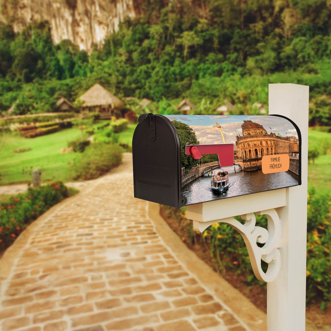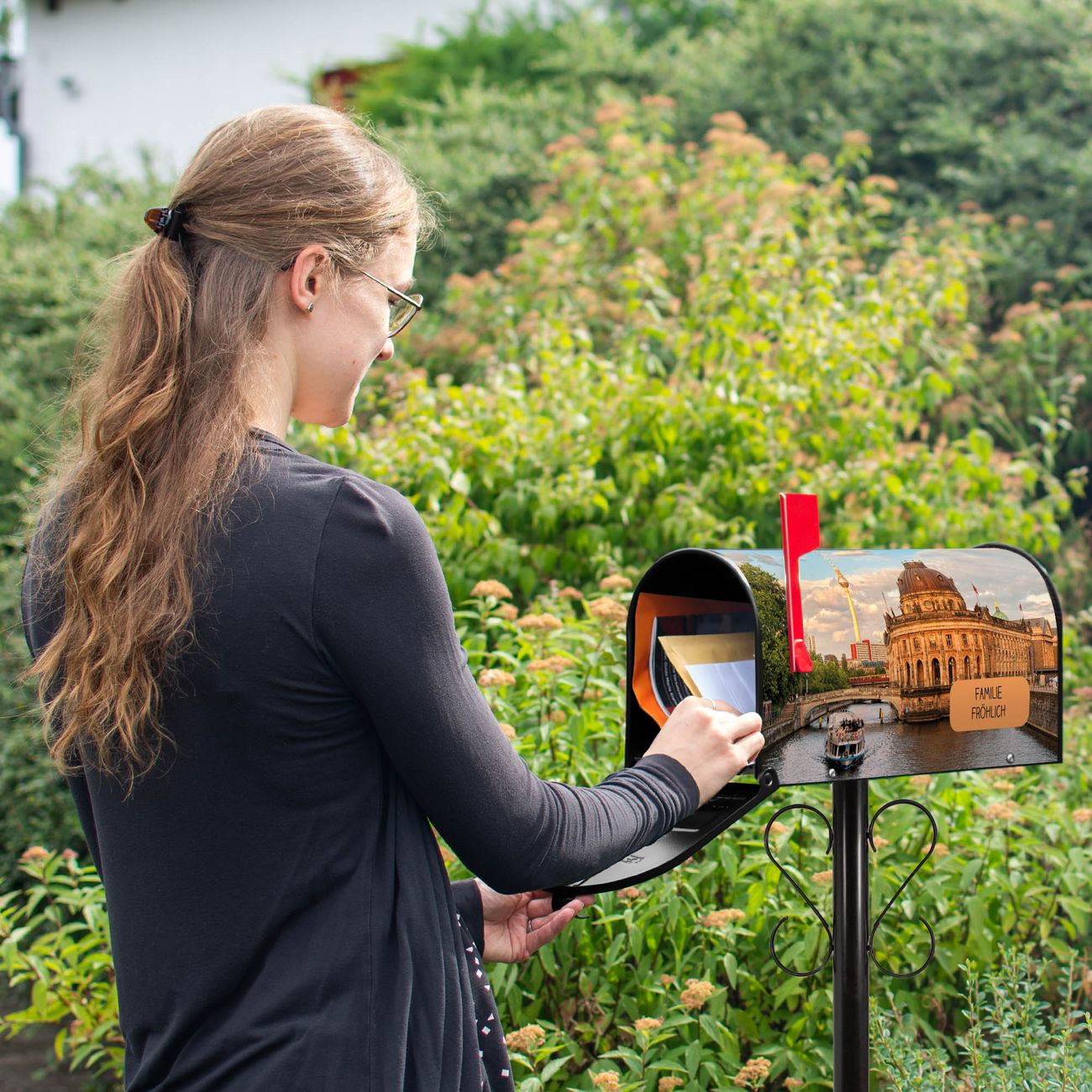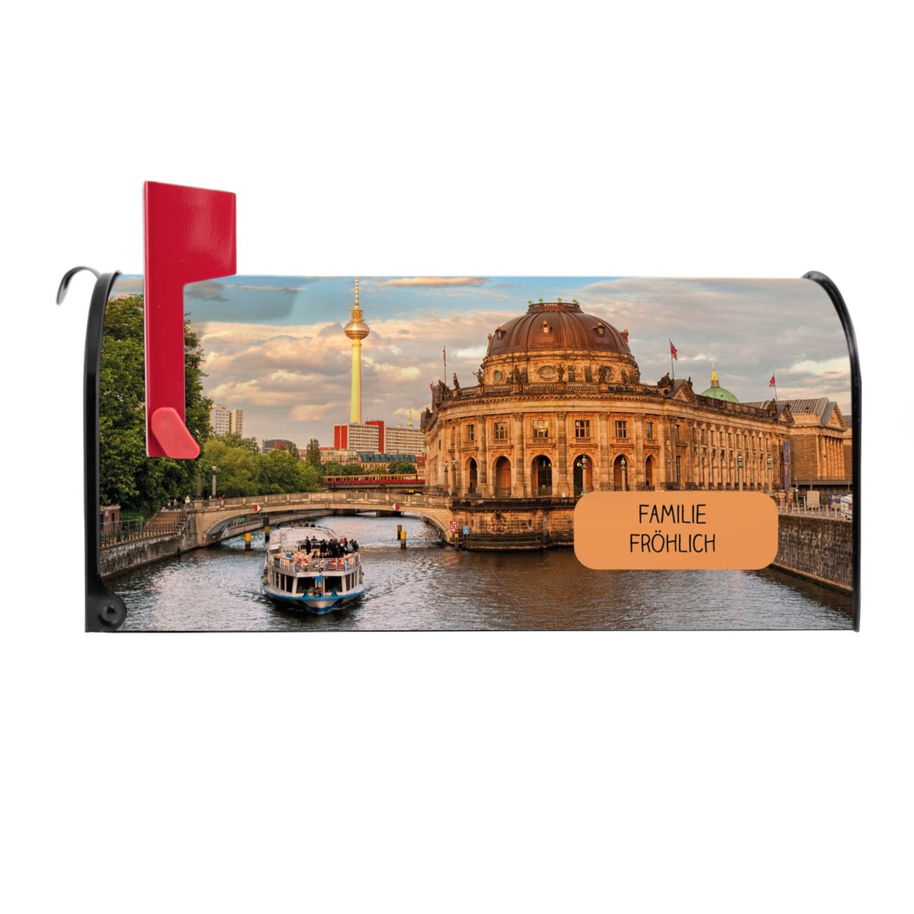 Der amerikanische Briefkasten von banjado mit Museumsinsel Motiv bietet Ihnen ausreichend Fassungsvermögen, um große A4 Sendungen und Zeitschriften zu empfangen. Die typisch amerikanische rote Fahne zeigt Ihnen an, wenn Sie Post erhalten haben. Die US-Mailbox besteht aus verzinktem Stahlblech welches lackiert wurde und ist 48 x 22 x 16 CM (BxHxT) groß. Die Folie mit Motiv Museumsinsel besteht aus einer wetter- und UV-resistenten Folie, die mit einem Schutzlaminat überzogen ist, sodass die US Mailbox zusätzlich vor Kratzern geschützt ist. An der Unterkante sind 4 Löcher je Seite um die Mailbox, typisch amerikanisch, an einem Holzpfahl oder einem Zaun zu befestigen. Auf Wunsch können Sie bei uns den passenden Standfuß oder die passende Wandhalterung kaufen um die US-Mailbox sicher zu befestigen. Wir bieten Ihnen ebenfalls Namensschilder, bereits beschriftet oder frei zu beschriften, und verschiedene selbst gestaltete Bitte-Keine-Werbung-Aufkleber.