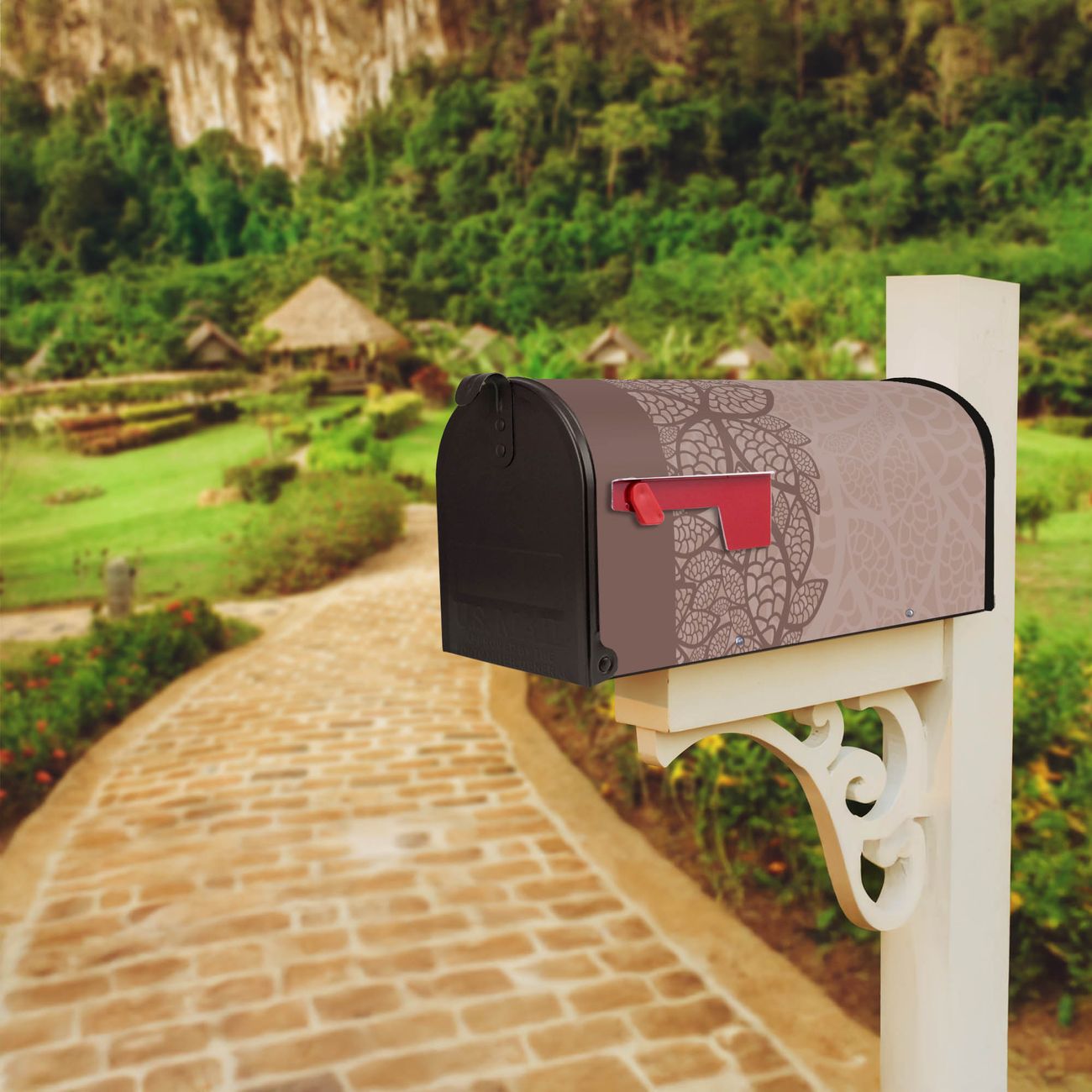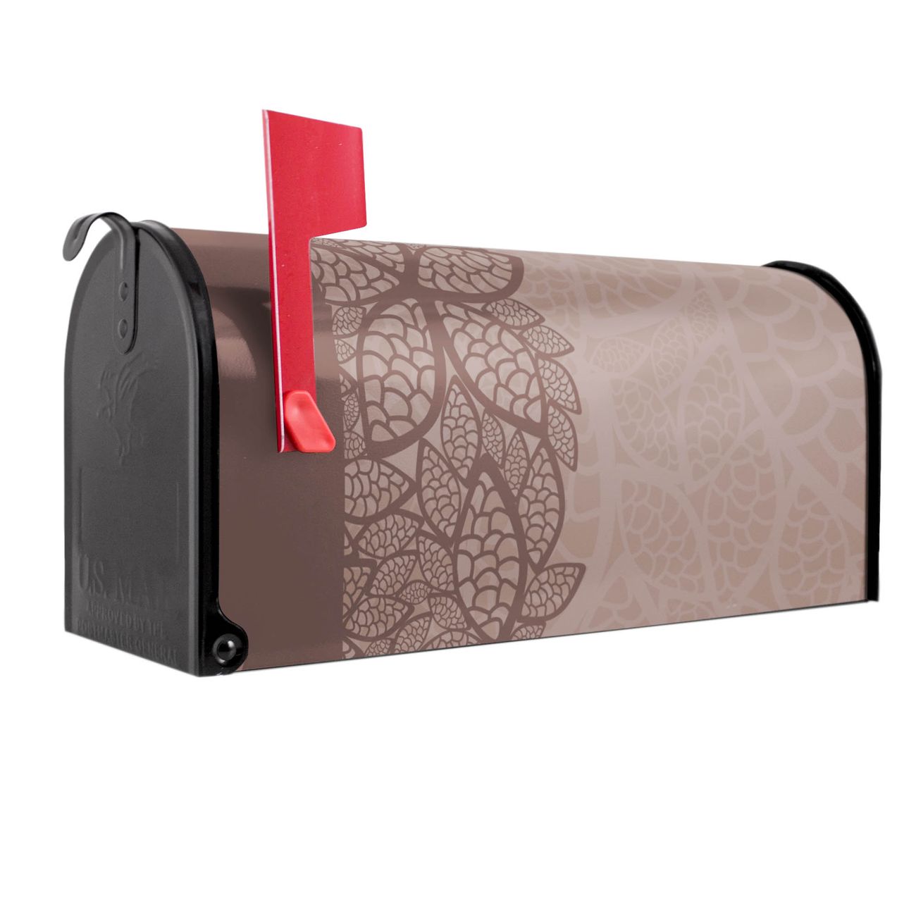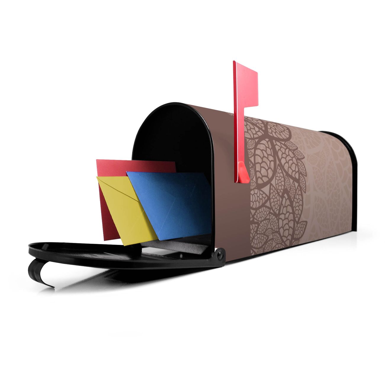 Der amerikanische Briefkasten von banjado mit Muster Blätter Motiv bietet Ihnen ausreichend Fassungsvermögen, um große A4 Sendungen und Zeitschriften zu empfangen. Die typisch amerikanische rote Fahne zeigt Ihnen an, wenn Sie Post erhalten haben. Die US-Mailbox besteht aus verzinktem Stahlblech welches lackiert wurde und ist 48 x 22 x 16 CM (BxHxT) groß. Die Folie mit Motiv Muster Blätter besteht aus einer wetter- und UV-resistenten Folie, die mit einem Schutzlaminat überzogen ist, sodass die US Mailbox zusätzlich vor Kratzern geschützt ist. An der Unterkante sind 4 Löcher je Seite um die Mailbox, typisch amerikanisch, an einem Holzpfahl oder einem Zaun zu befestigen. Auf Wunsch können Sie bei uns den passenden Standfuß oder die passende Wandhalterung kaufen um die US-Mailbox sicher zu befestigen. Wir bieten Ihnen ebenfalls Namensschilder, bereits beschriftet oder frei zu beschriften, und verschiedene selbst gestaltete Bitte-Keine-Werbung-Aufkleber.