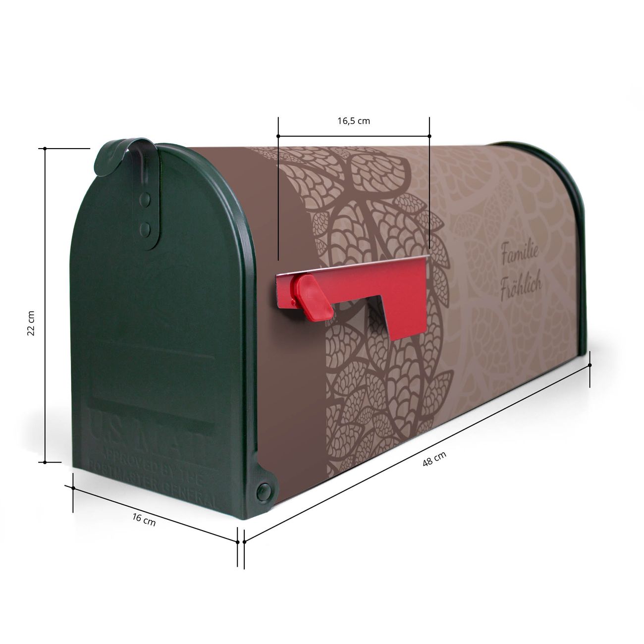 Der amerikanische Briefkasten von banjado mit WT Muster Blätter Motiv bietet Ihnen ausreichend Fassungsvermögen, um große A4 Sendungen und Zeitschriften zu empfangen. Die typisch amerikanische rote Fahne zeigt Ihnen an, wenn Sie Post erhalten haben. Die US-Mailbox besteht aus verzinktem Stahlblech welches lackiert wurde und ist 48 x 22 x 16 CM (BxHxT) groß. Die Folie mit Motiv WT Muster Blätter besteht aus einer wetter- und UV-resistenten Folie, die mit einem Schutzlaminat überzogen ist, sodass die US Mailbox zusätzlich vor Kratzern geschützt ist. An der Unterkante sind 4 Löcher je Seite um die Mailbox, typisch amerikanisch, an einem Holzpfahl oder einem Zaun zu befestigen. Auf Wunsch können Sie bei uns den passenden Standfuß oder die passende Wandhalterung kaufen um die US-Mailbox sicher zu befestigen. Wir bieten Ihnen ebenfalls Namensschilder, bereits beschriftet oder frei zu beschriften, und verschiedene selbst gestaltete Bitte-Keine-Werbung-Aufkleber.