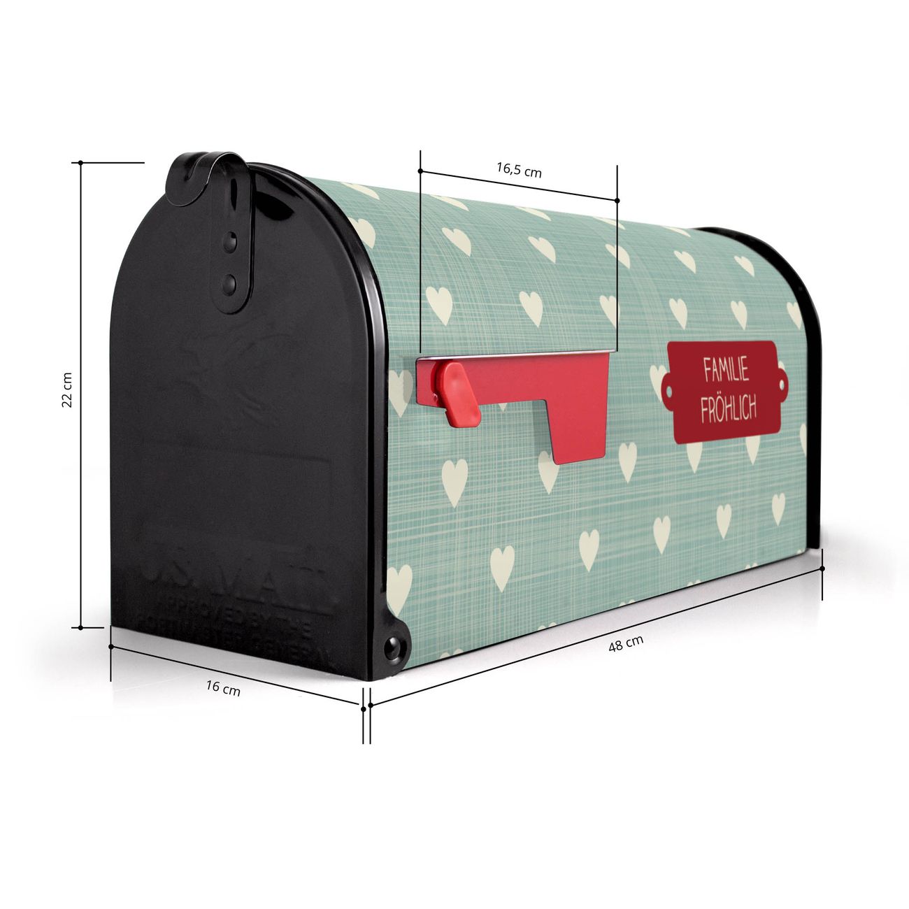Der amerikanische Briefkasten von banjado mit Muster Herzen Motiv bietet Ihnen ausreichend Fassungsvermögen, um große A4 Sendungen und Zeitschriften zu empfangen. Die typisch amerikanische rote Fahne zeigt Ihnen an, wenn Sie Post erhalten haben. Die US-Mailbox besteht aus verzinktem Stahlblech welches lackiert wurde und ist 48 x 22 x 16 CM (BxHxT) groß. Die Folie mit Motiv Muster Herzen besteht aus einer wetter- und UV-resistenten Folie, die mit einem Schutzlaminat überzogen ist, sodass die US Mailbox zusätzlich vor Kratzern geschützt ist. An der Unterkante sind 4 Löcher je Seite um die Mailbox, typisch amerikanisch, an einem Holzpfahl oder einem Zaun zu befestigen. Auf Wunsch können Sie bei uns den passenden Standfuß oder die passende Wandhalterung kaufen um die US-Mailbox sicher zu befestigen. Wir bieten Ihnen ebenfalls Namensschilder, bereits beschriftet oder frei zu beschriften, und verschiedene selbst gestaltete Bitte-Keine-Werbung-Aufkleber.