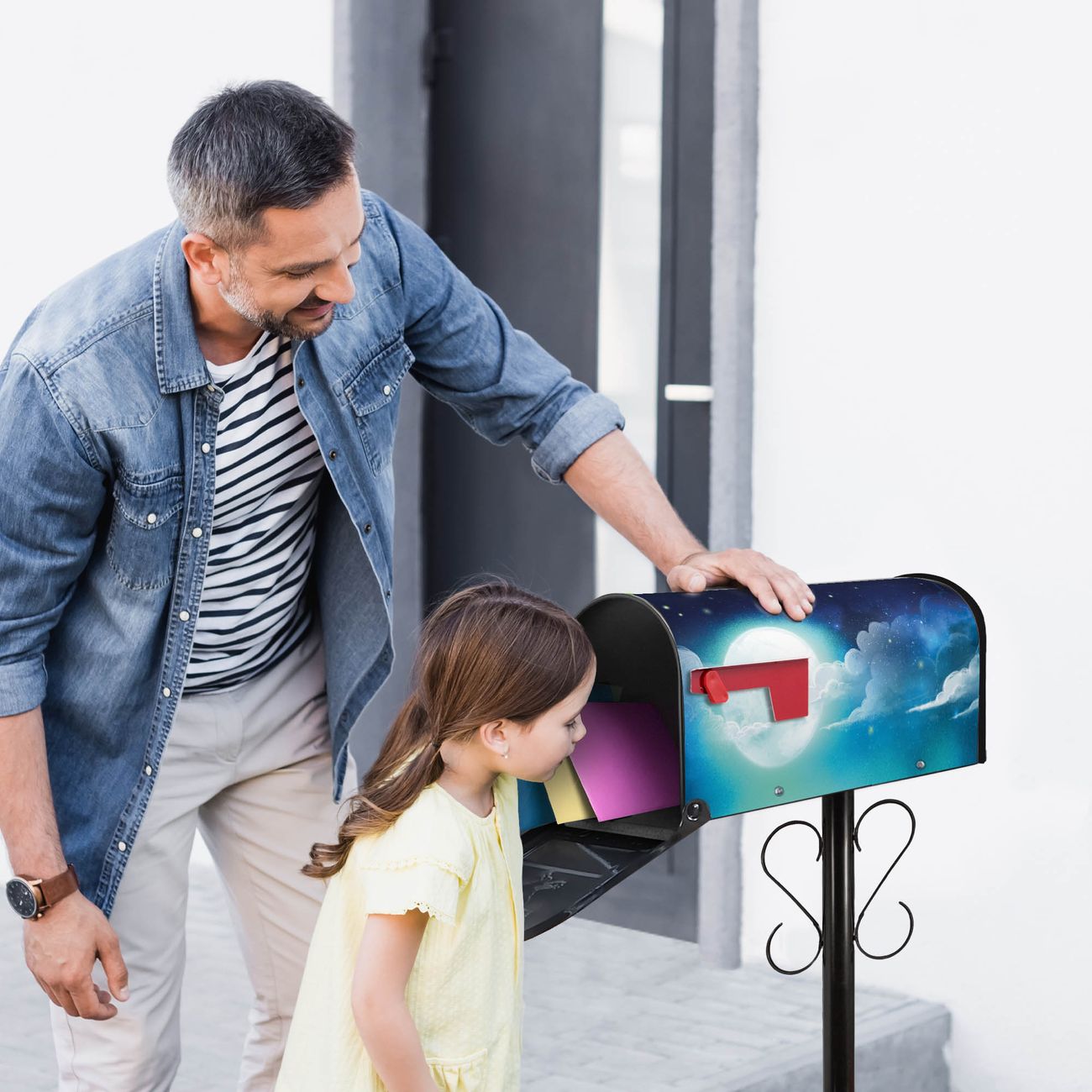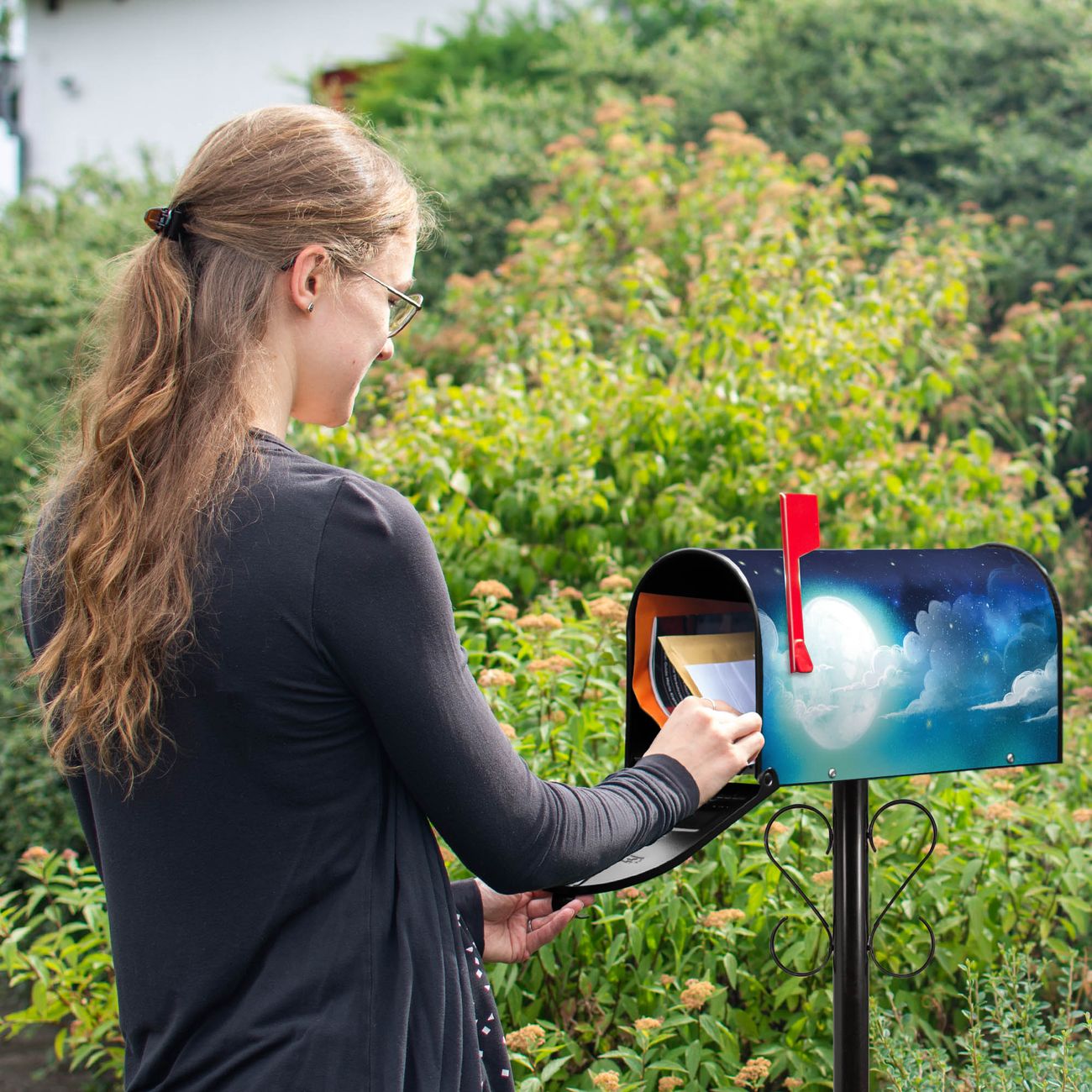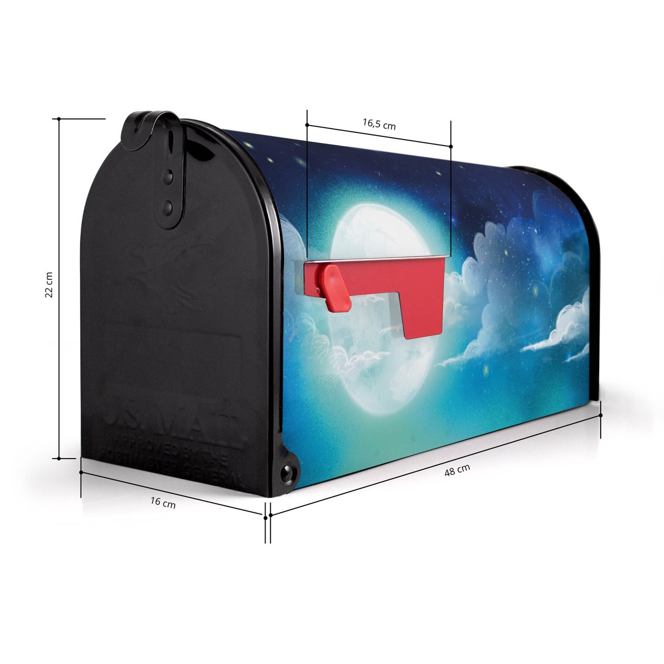 Unser amerikanischer Briefkasten mit dem Motiv Nachthimmel 1 hat ein sehr ansprechendes und ausgefallenes Design, ist in der Grundfarbe weiß, grün oder schwarz erhältlich. Damit entlocken Sie Ihren Nachbarn und dem Postboten immer wieder ein Lächeln. Die Mailbox ist ein Original Import aus Mississippi USA und wird von unserer kleinen Manufaktur in Sachsen von Hand veredelt. Die US-Mailbox bietet ausreichend Platz auch für große Sendungen, eine Fahne die Ihnen Post anzeigt, wetterfestes und äußerst stabiles Material - so macht Post empfangen Freude.