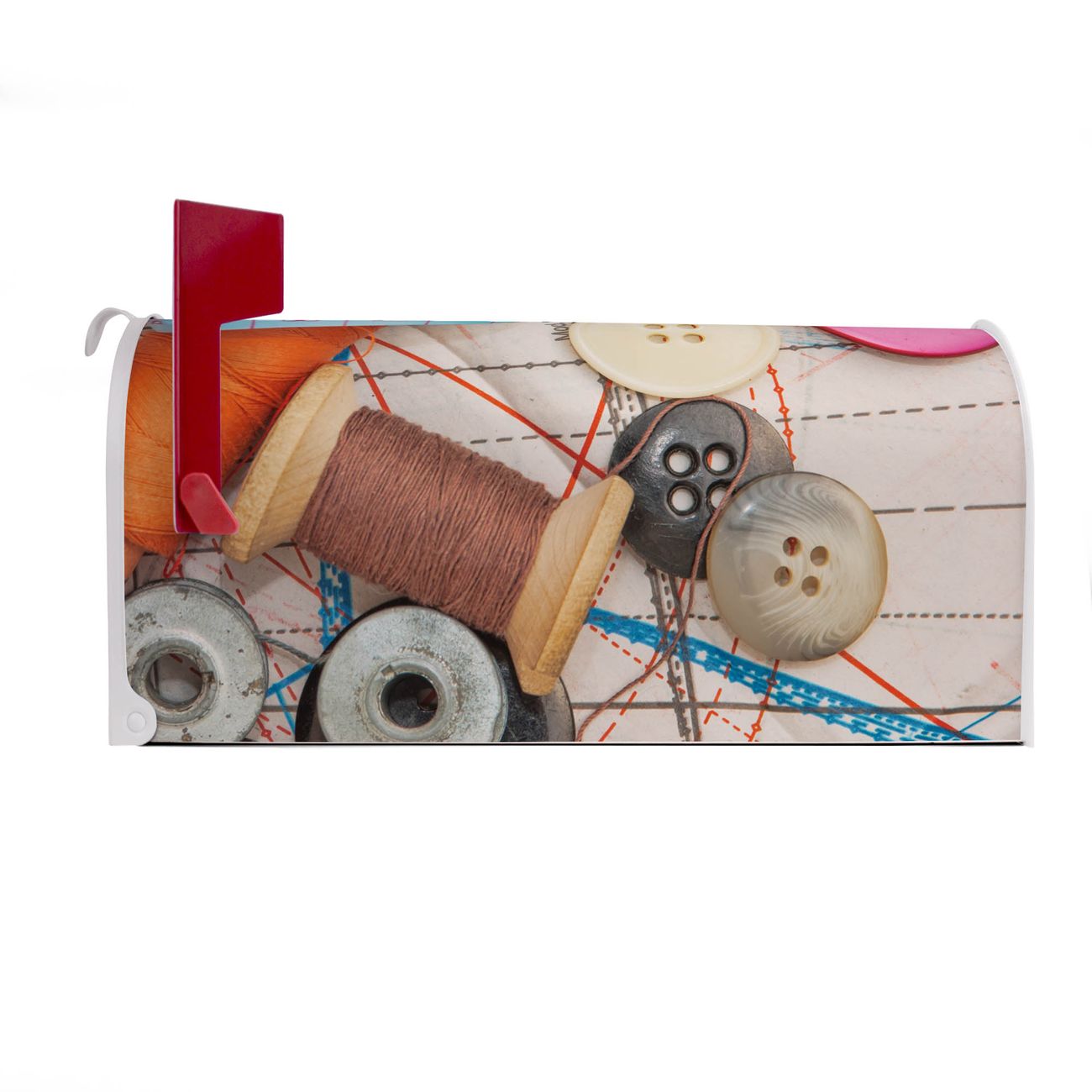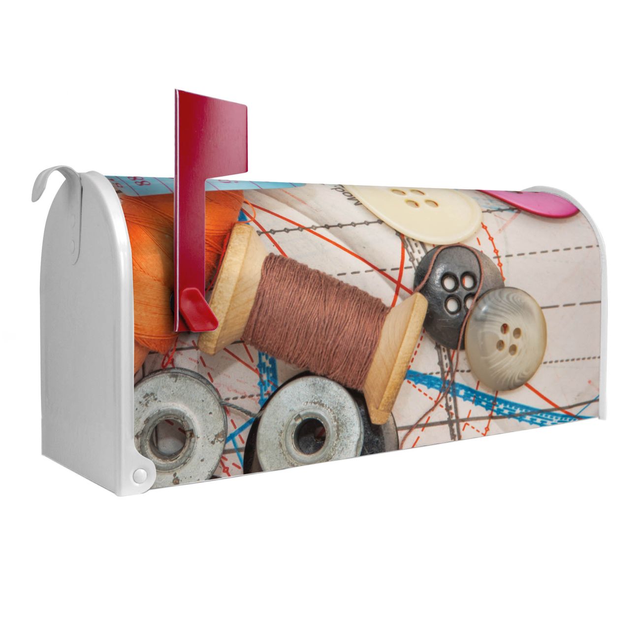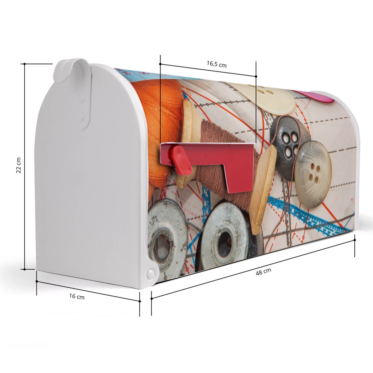 Der amerikanische Briefkasten von banjado mit Nähen Motiv bietet Ihnen ausreichend Fassungsvermögen, um große A4 Sendungen und Zeitschriften zu empfangen. Die typisch amerikanische rote Fahne zeigt Ihnen an, wenn Sie Post erhalten haben. Die US-Mailbox besteht aus verzinktem Stahlblech welches lackiert wurde und ist 48 x 22 x 16 CM (BxHxT) groß. Die Folie mit Motiv Nähen besteht aus einer wetter- und UV-resistenten Folie, die mit einem Schutzlaminat überzogen ist, sodass die US Mailbox zusätzlich vor Kratzern geschützt ist. An der Unterkante sind 4 Löcher je Seite um die Mailbox, typisch amerikanisch, an einem Holzpfahl oder einem Zaun zu befestigen. Auf Wunsch können Sie bei uns den passenden Standfuß oder die passende Wandhalterung kaufen um die US-Mailbox sicher zu befestigen. Wir bieten Ihnen ebenfalls Namensschilder, bereits beschriftet oder frei zu beschriften, und verschiedene selbst gestaltete Bitte-Keine-Werbung-Aufkleber.