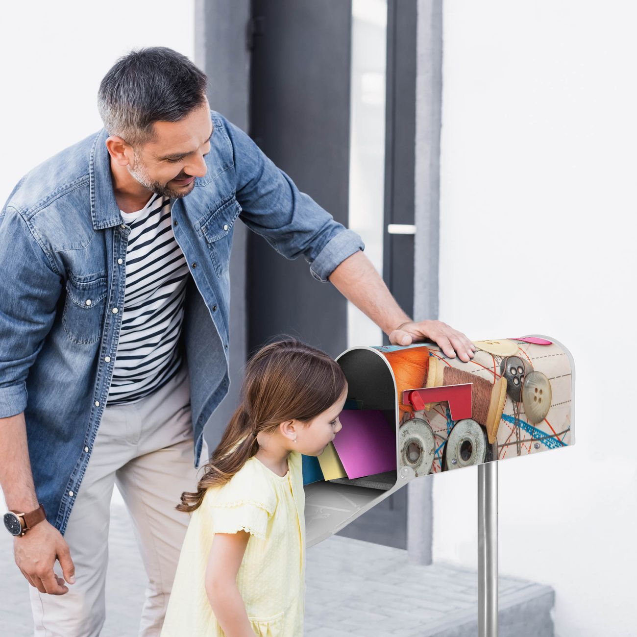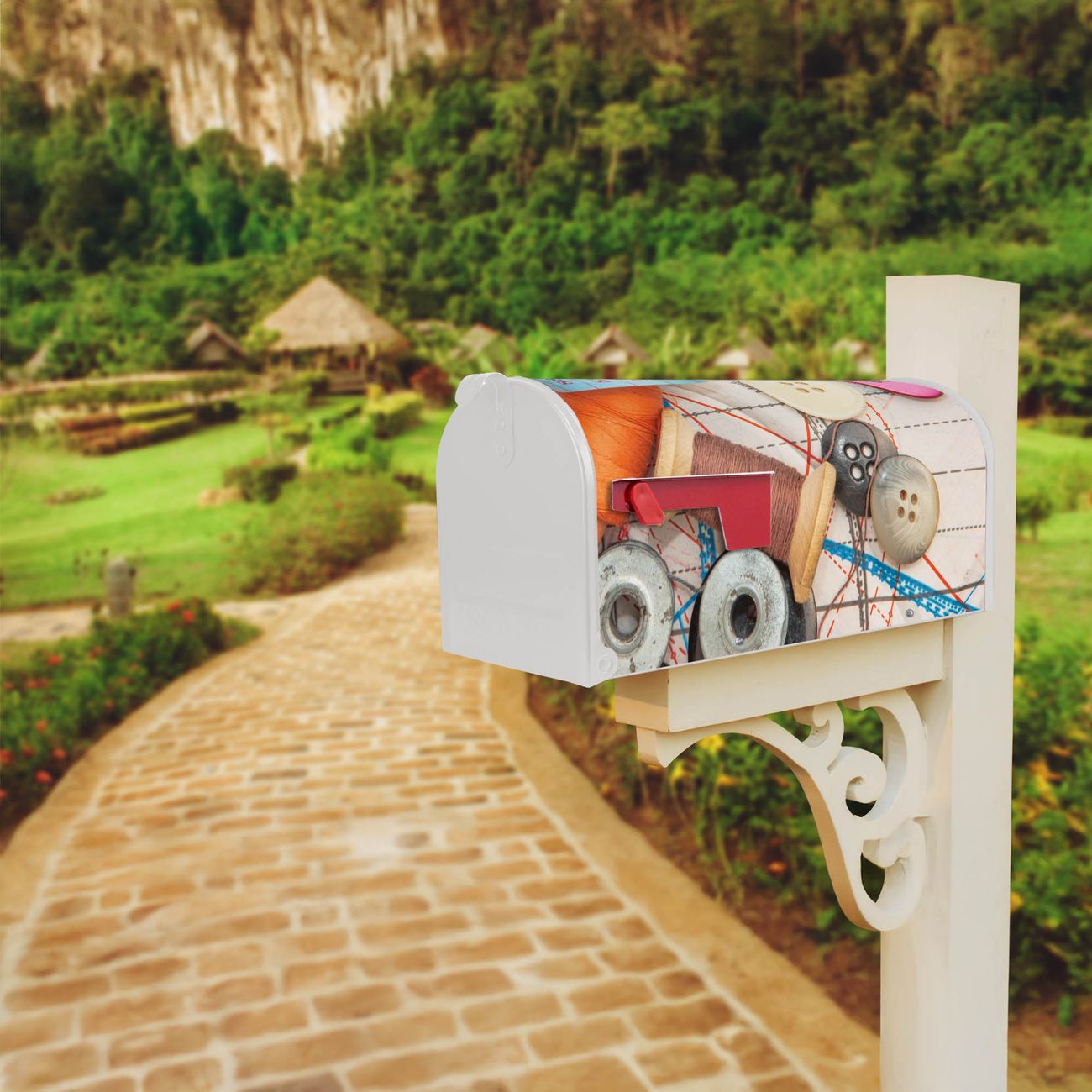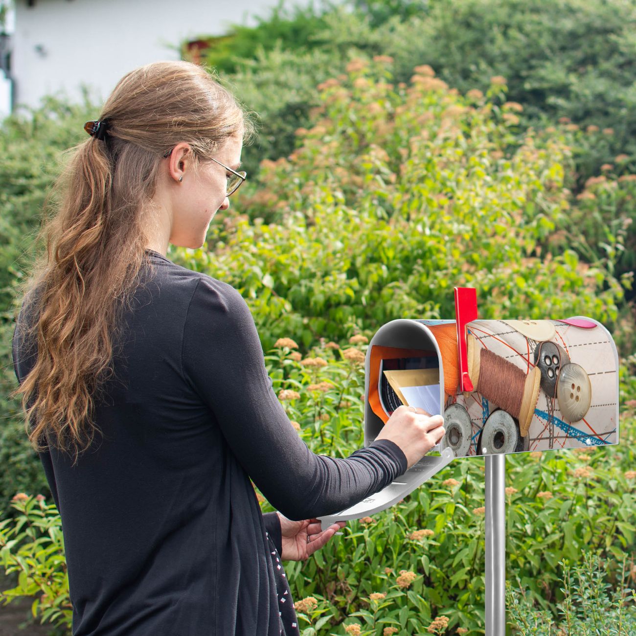 Der amerikanische Briefkasten von banjado mit Nähen Motiv bietet Ihnen ausreichend Fassungsvermögen, um große A4 Sendungen und Zeitschriften zu empfangen. Die typisch amerikanische rote Fahne zeigt Ihnen an, wenn Sie Post erhalten haben. Die US-Mailbox besteht aus verzinktem Stahlblech welches lackiert wurde und ist 48 x 22 x 16 CM (BxHxT) groß. Die Folie mit Motiv Nähen besteht aus einer wetter- und UV-resistenten Folie, die mit einem Schutzlaminat überzogen ist, sodass die US Mailbox zusätzlich vor Kratzern geschützt ist. An der Unterkante sind 4 Löcher je Seite um die Mailbox, typisch amerikanisch, an einem Holzpfahl oder einem Zaun zu befestigen. Auf Wunsch können Sie bei uns den passenden Standfuß oder die passende Wandhalterung kaufen um die US-Mailbox sicher zu befestigen. Wir bieten Ihnen ebenfalls Namensschilder, bereits beschriftet oder frei zu beschriften, und verschiedene selbst gestaltete Bitte-Keine-Werbung-Aufkleber.