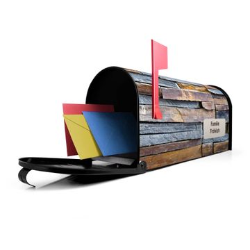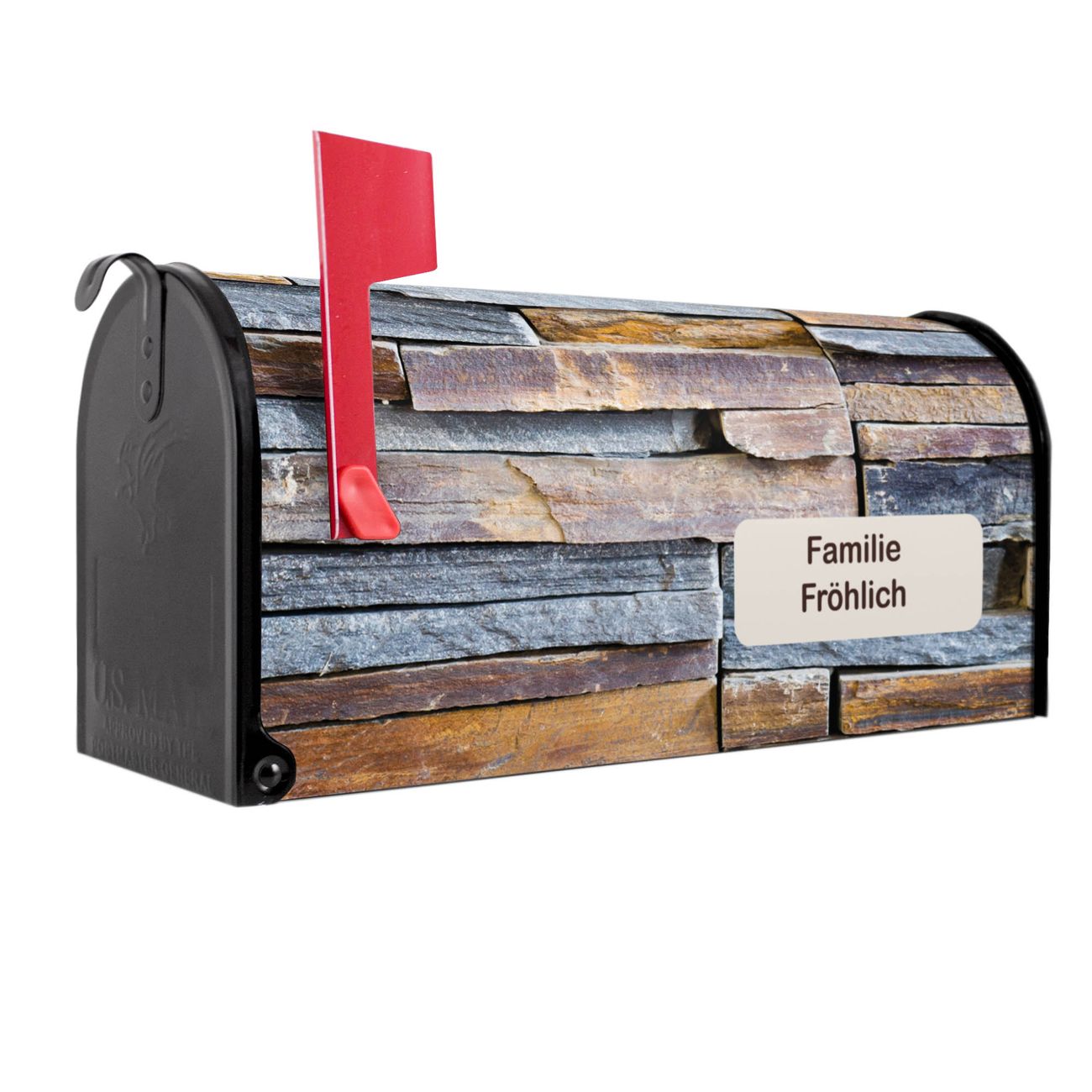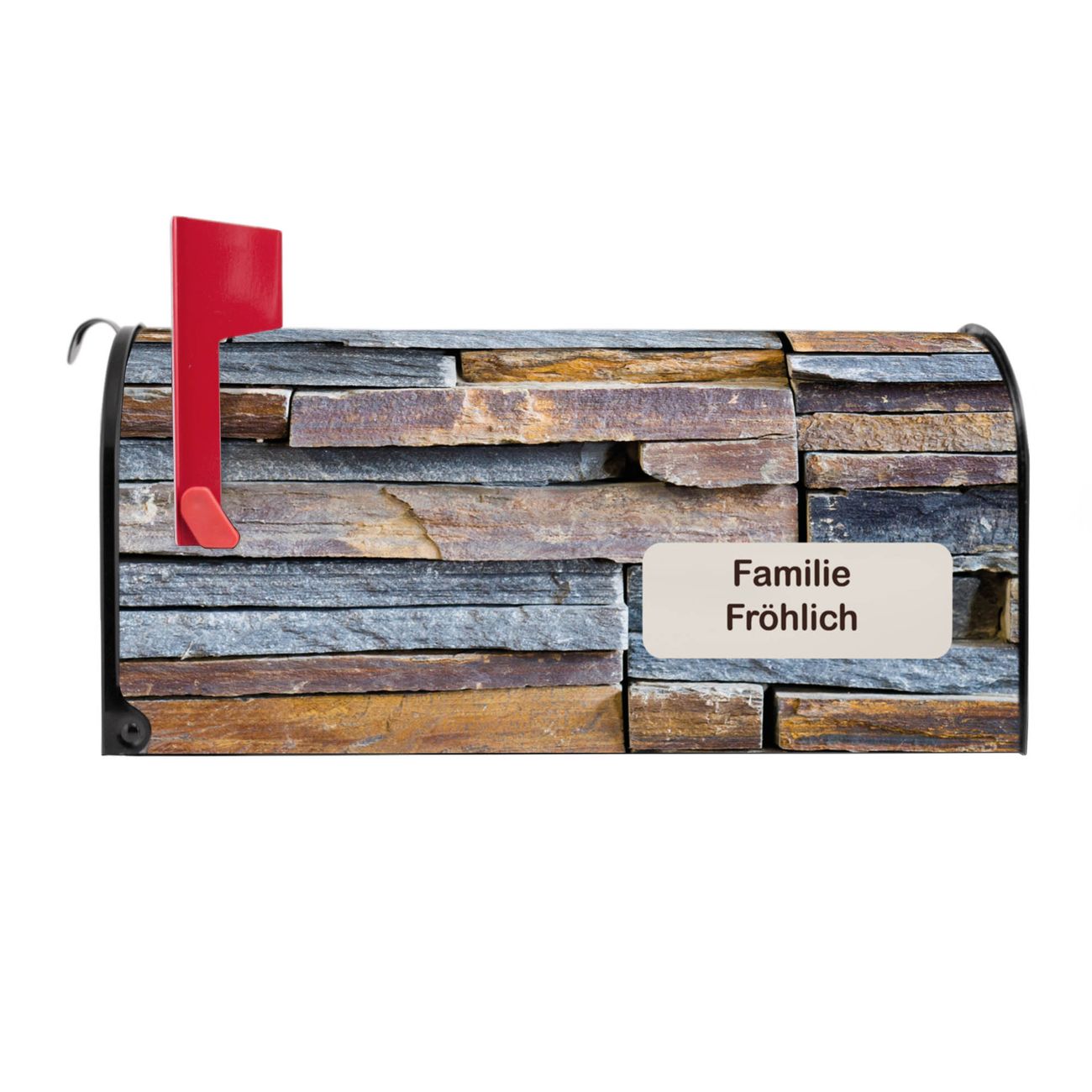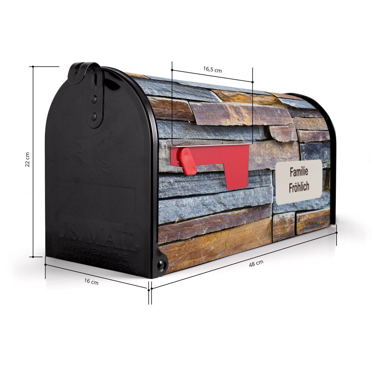 Der amerikanische Briefkasten von banjado mit Naturstein Motiv bietet Ihnen ausreichend Fassungsvermögen, um große A4 Sendungen und Zeitschriften zu empfangen. Die typisch amerikanische rote Fahne zeigt Ihnen an, wenn Sie Post erhalten haben. Die US-Mailbox besteht aus verzinktem Stahlblech welches lackiert wurde und ist 48 x 22 x 16 CM (BxHxT) groß. Die Folie mit Motiv Naturstein besteht aus einer wetter- und UV-resistenten Folie, die mit einem Schutzlaminat überzogen ist, sodass die US Mailbox zusätzlich vor Kratzern geschützt ist. An der Unterkante sind 4 Löcher je Seite um die Mailbox, typisch amerikanisch, an einem Holzpfahl oder einem Zaun zu befestigen. Auf Wunsch können Sie bei uns den passenden Standfuß oder die passende Wandhalterung kaufen um die US-Mailbox sicher zu befestigen. Wir bieten Ihnen ebenfalls Namensschilder, bereits beschriftet oder frei zu beschriften, und verschiedene selbst gestaltete Bitte-Keine-Werbung-Aufkleber.