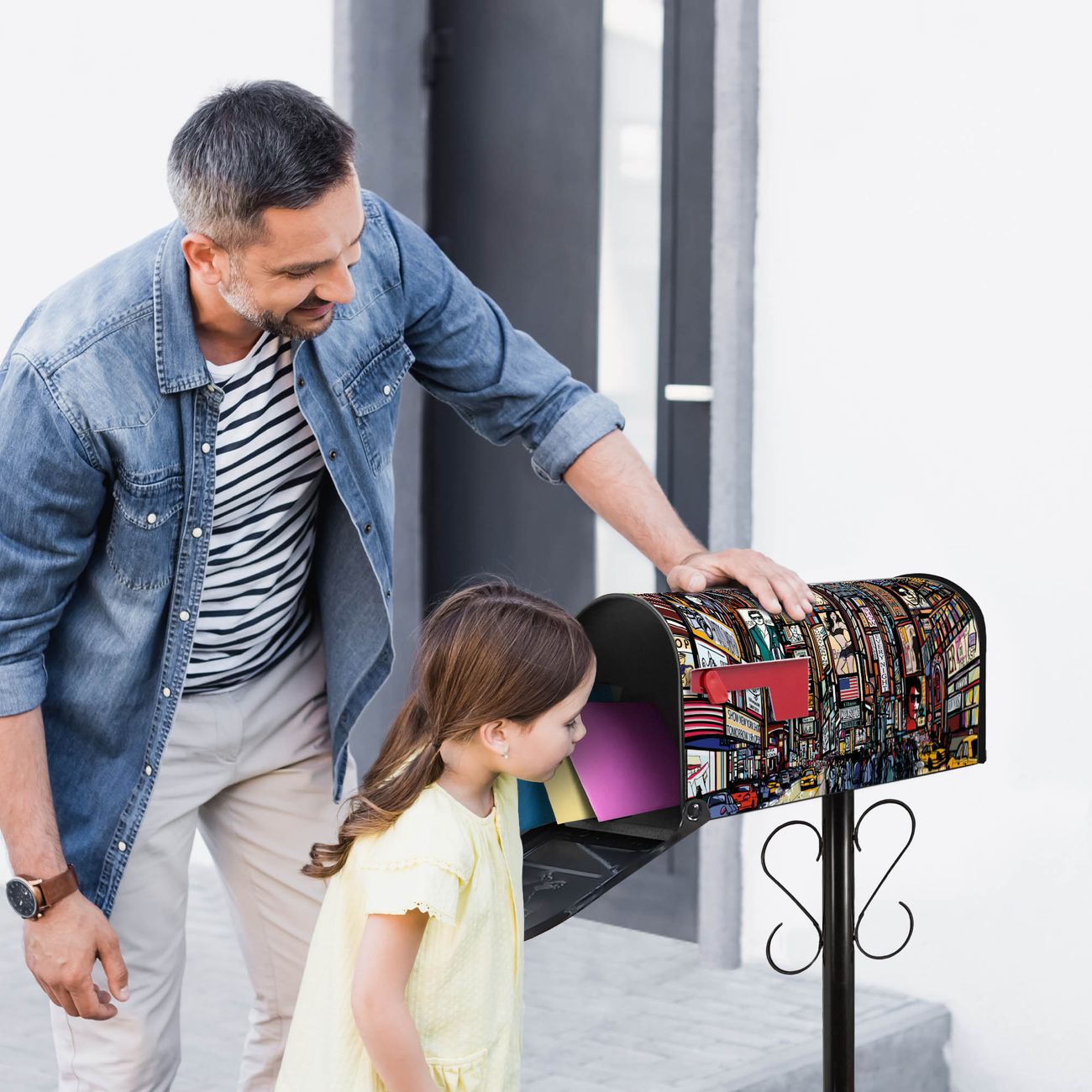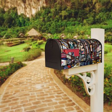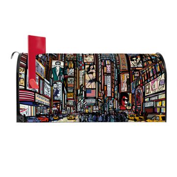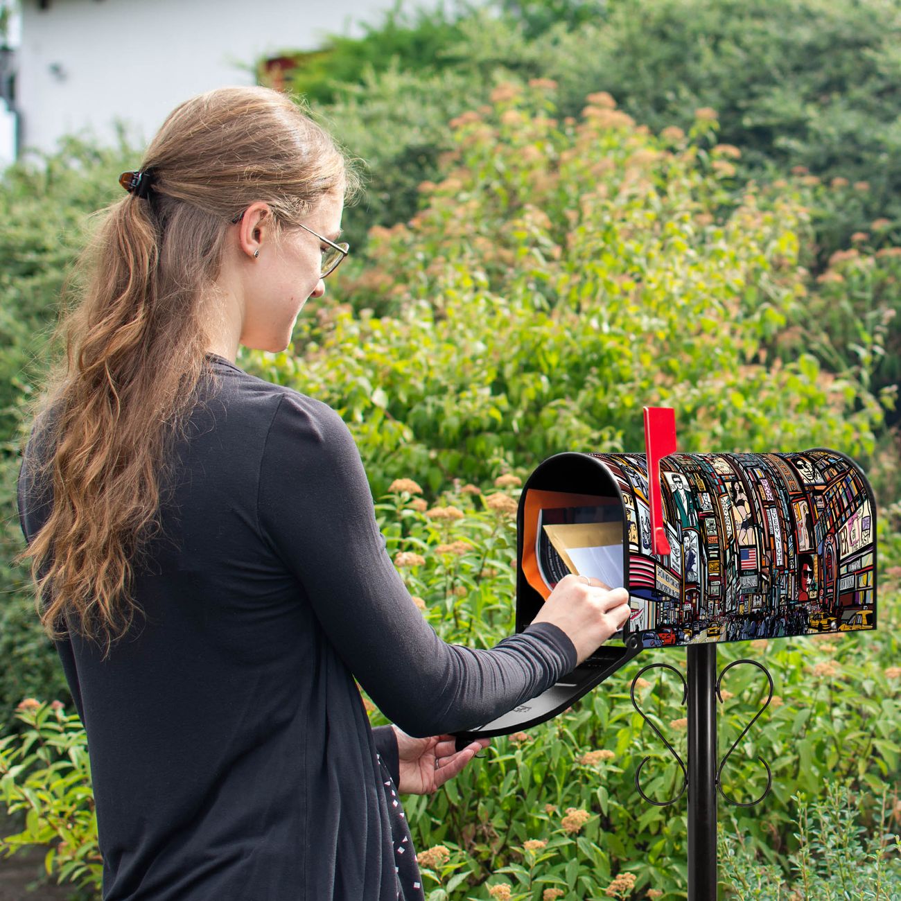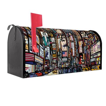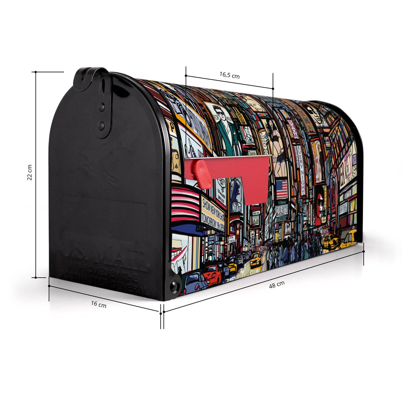 Der amerikanische Briefkasten von banjado mit New York Show Motiv bietet Ihnen ausreichend Fassungsvermögen, um große A4 Sendungen und Zeitschriften zu empfangen. Die typisch amerikanische rote Fahne zeigt Ihnen an, wenn Sie Post erhalten haben. Die US-Mailbox besteht aus verzinktem Stahlblech welches lackiert wurde und ist 48 x 22 x 16 CM (BxHxT) groß. Die Folie mit Motiv New York Show besteht aus einer wetter- und UV-resistenten Folie, die mit einem Schutzlaminat überzogen ist, sodass die US Mailbox zusätzlich vor Kratzern geschützt ist. An der Unterkante sind 4 Löcher je Seite um die Mailbox, typisch amerikanisch, an einem Holzpfahl oder einem Zaun zu befestigen. Auf Wunsch können Sie bei uns den passenden Standfuß oder die passende Wandhalterung kaufen um die US-Mailbox sicher zu befestigen. Wir bieten Ihnen ebenfalls Namensschilder, bereits beschriftet oder frei zu beschriften, und verschiedene selbst gestaltete Bitte-Keine-Werbung-Aufkleber.