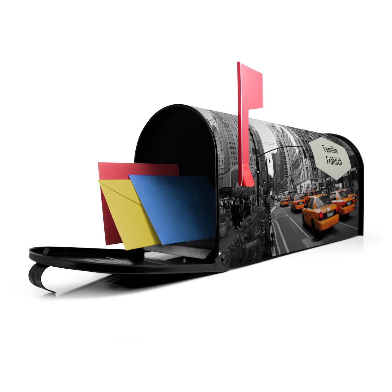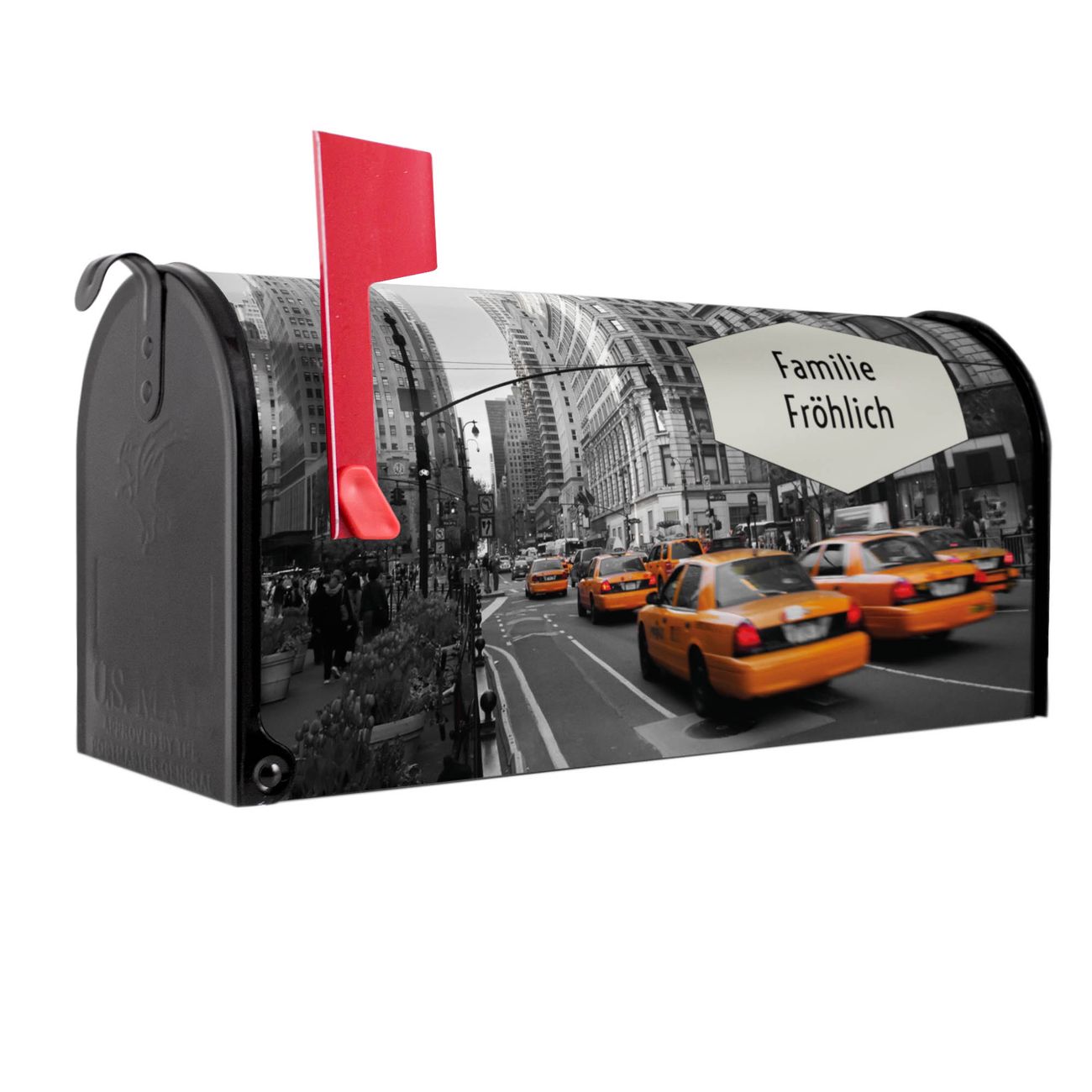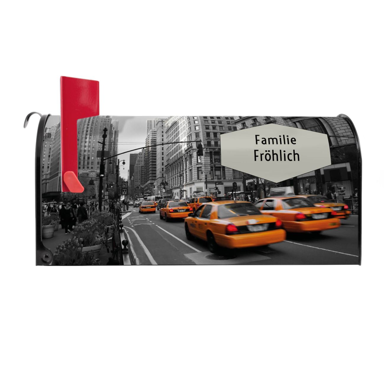 Der amerikanische Briefkasten von banjado mit New York Taxi Motiv bietet Ihnen ausreichend Fassungsvermögen, um große A4 Sendungen und Zeitschriften zu empfangen. Die typisch amerikanische rote Fahne zeigt Ihnen an, wenn Sie Post erhalten haben. Die US-Mailbox besteht aus verzinktem Stahlblech welches lackiert wurde und ist 48 x 22 x 16 CM (BxHxT) groß. Die Folie mit Motiv New York Taxi besteht aus einer wetter- und UV-resistenten Folie, die mit einem Schutzlaminat überzogen ist, sodass die US Mailbox zusätzlich vor Kratzern geschützt ist. An der Unterkante sind 4 Löcher je Seite um die Mailbox, typisch amerikanisch, an einem Holzpfahl oder einem Zaun zu befestigen. Auf Wunsch können Sie bei uns den passenden Standfuß oder die passende Wandhalterung kaufen um die US-Mailbox sicher zu befestigen. Wir bieten Ihnen ebenfalls Namensschilder, bereits beschriftet oder frei zu beschriften, und verschiedene selbst gestaltete Bitte-Keine-Werbung-Aufkleber.
