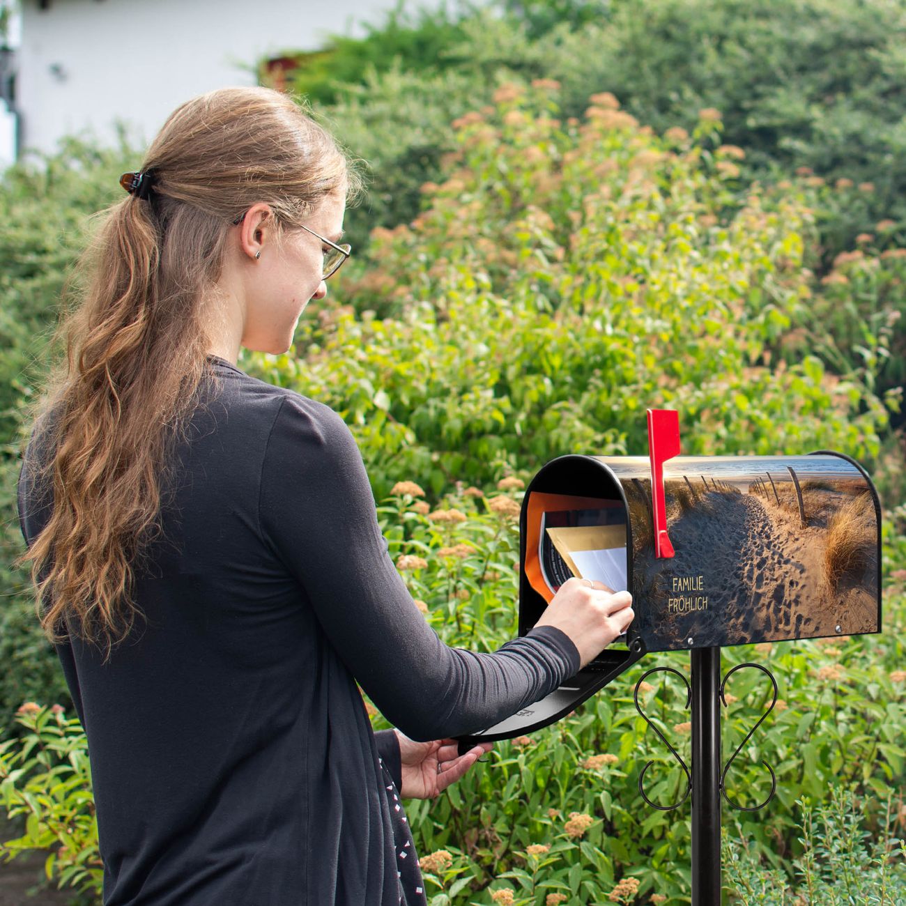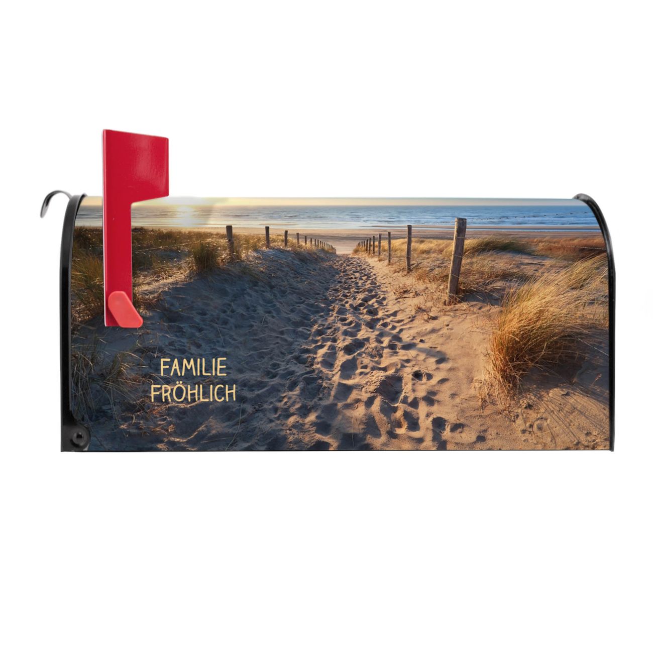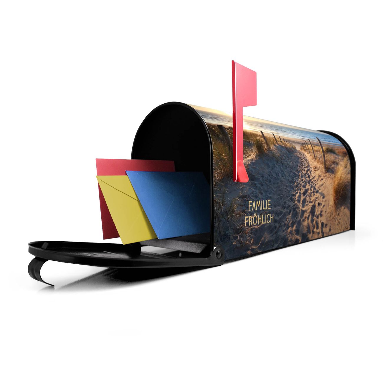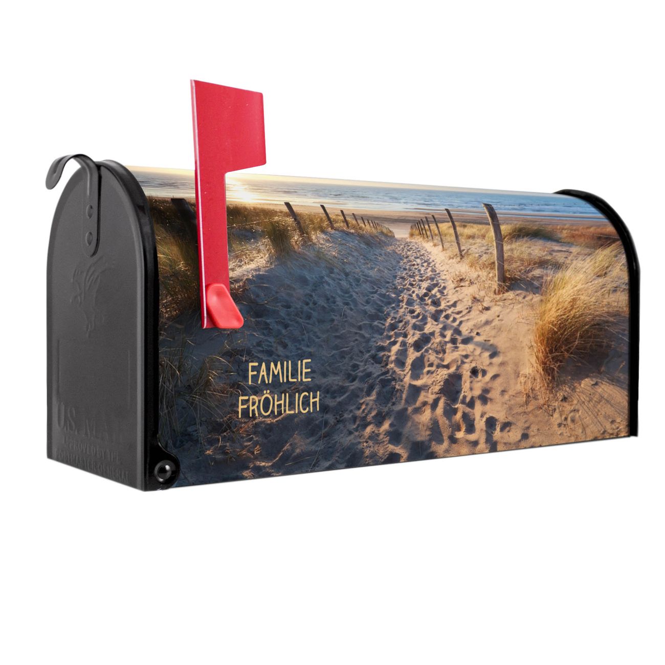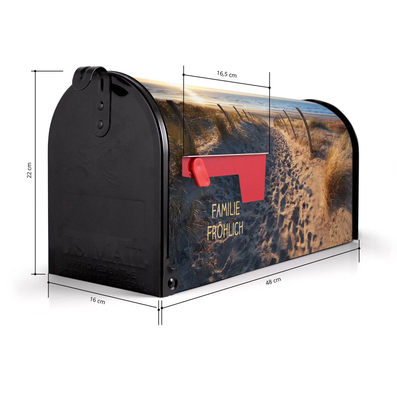 Der amerikanische Briefkasten von banjado mit Nordseestrand Motiv bietet Ihnen ausreichend Fassungsvermögen, um große A4 Sendungen und Zeitschriften zu empfangen. Die typisch amerikanische rote Fahne zeigt Ihnen an, wenn Sie Post erhalten haben. Die US-Mailbox besteht aus verzinktem Stahlblech welches lackiert wurde und ist 48 x 22 x 16 CM (BxHxT) groß. Die Folie mit Motiv Nordseestrand besteht aus einer wetter- und UV-resistenten Folie, die mit einem Schutzlaminat überzogen ist, sodass die US Mailbox zusätzlich vor Kratzern geschützt ist. An der Unterkante sind 4 Löcher je Seite um die Mailbox, typisch amerikanisch, an einem Holzpfahl oder einem Zaun zu befestigen. Auf Wunsch können Sie bei uns den passenden Standfuß oder die passende Wandhalterung kaufen um die US-Mailbox sicher zu befestigen. Wir bieten Ihnen ebenfalls Namensschilder, bereits beschriftet oder frei zu beschriften, und verschiedene selbst gestaltete Bitte-Keine-Werbung-Aufkleber.