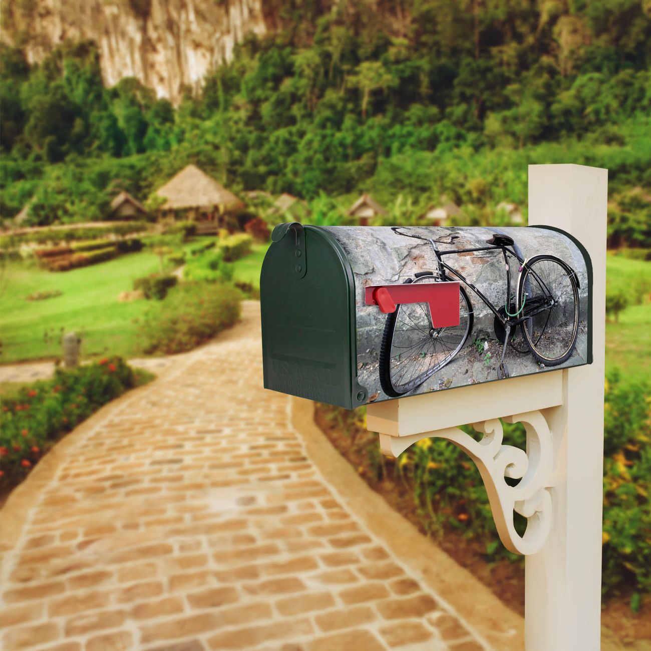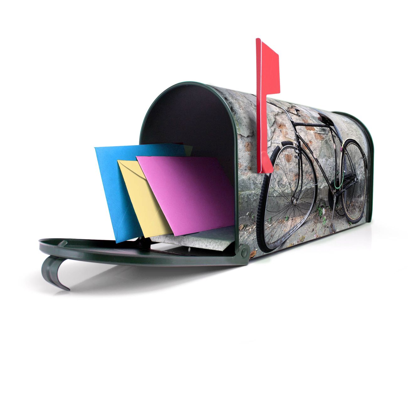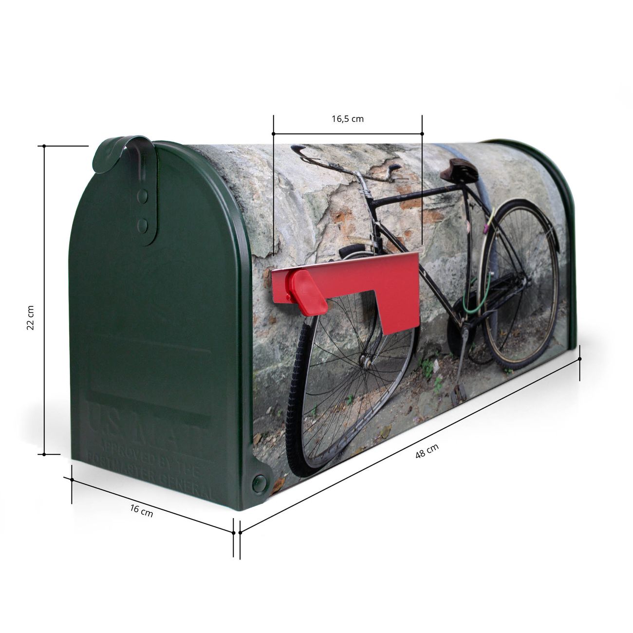 Der amerikanische Briefkasten von banjado mit Nostalgie Rad Motiv bietet Ihnen ausreichend Fassungsvermögen, um große A4 Sendungen und Zeitschriften zu empfangen. Die typisch amerikanische rote Fahne zeigt Ihnen an, wenn Sie Post erhalten haben. Die US-Mailbox besteht aus verzinktem Stahlblech welches lackiert wurde und ist 48 x 22 x 16 CM (BxHxT) groß. Die Folie mit Motiv Nostalgie Rad besteht aus einer wetter- und UV-resistenten Folie, die mit einem Schutzlaminat überzogen ist, sodass die US Mailbox zusätzlich vor Kratzern geschützt ist. An der Unterkante sind 4 Löcher je Seite um die Mailbox, typisch amerikanisch, an einem Holzpfahl oder einem Zaun zu befestigen. Auf Wunsch können Sie bei uns den passenden Standfuß oder die passende Wandhalterung kaufen um die US-Mailbox sicher zu befestigen. Wir bieten Ihnen ebenfalls Namensschilder, bereits beschriftet oder frei zu beschriften, und verschiedene selbst gestaltete Bitte-Keine-Werbung-Aufkleber.