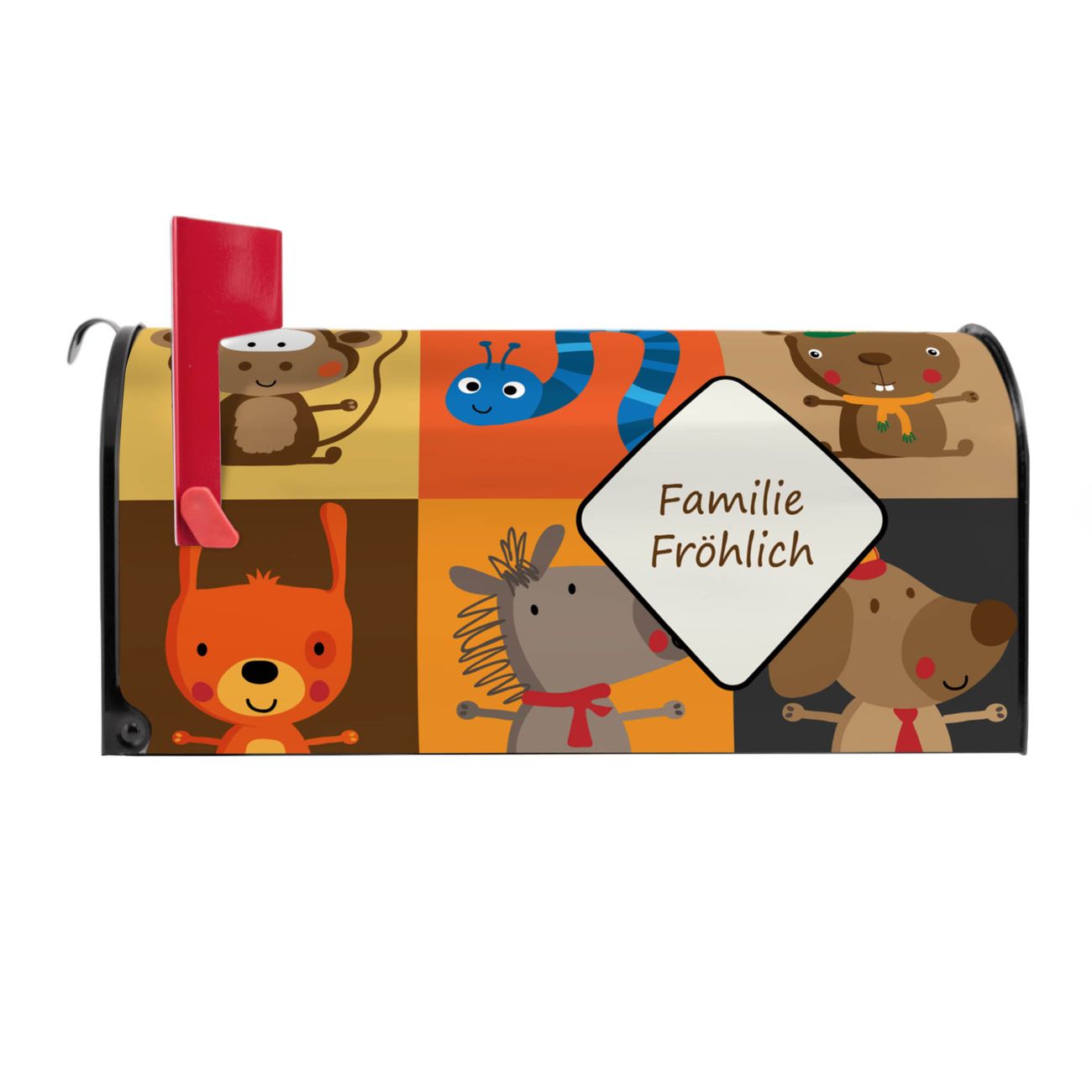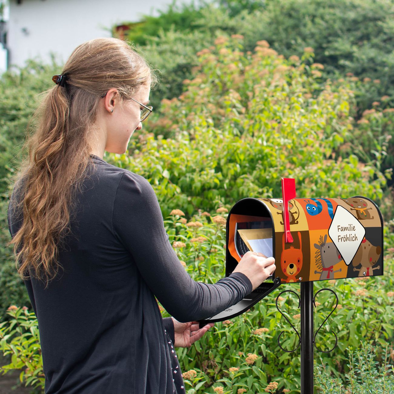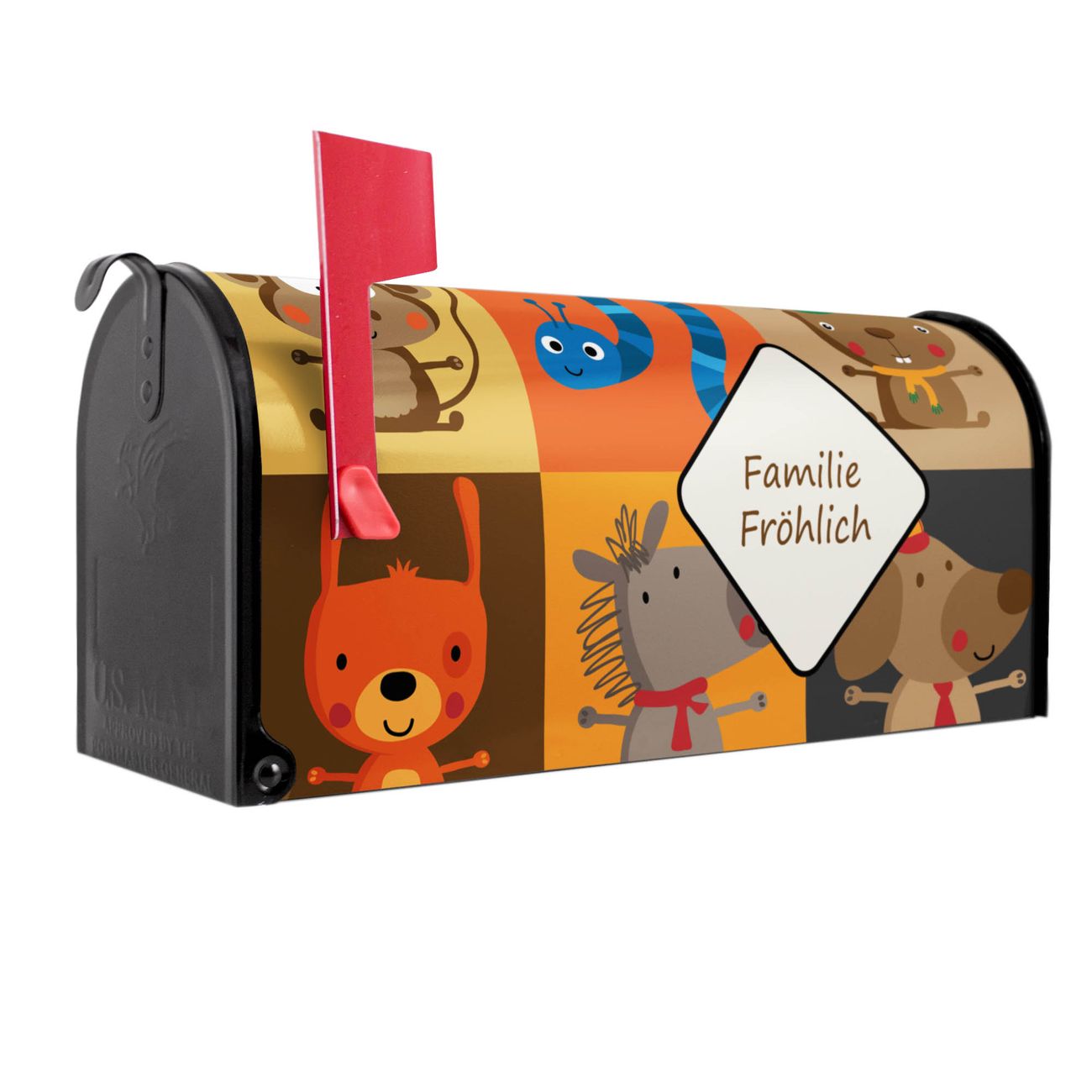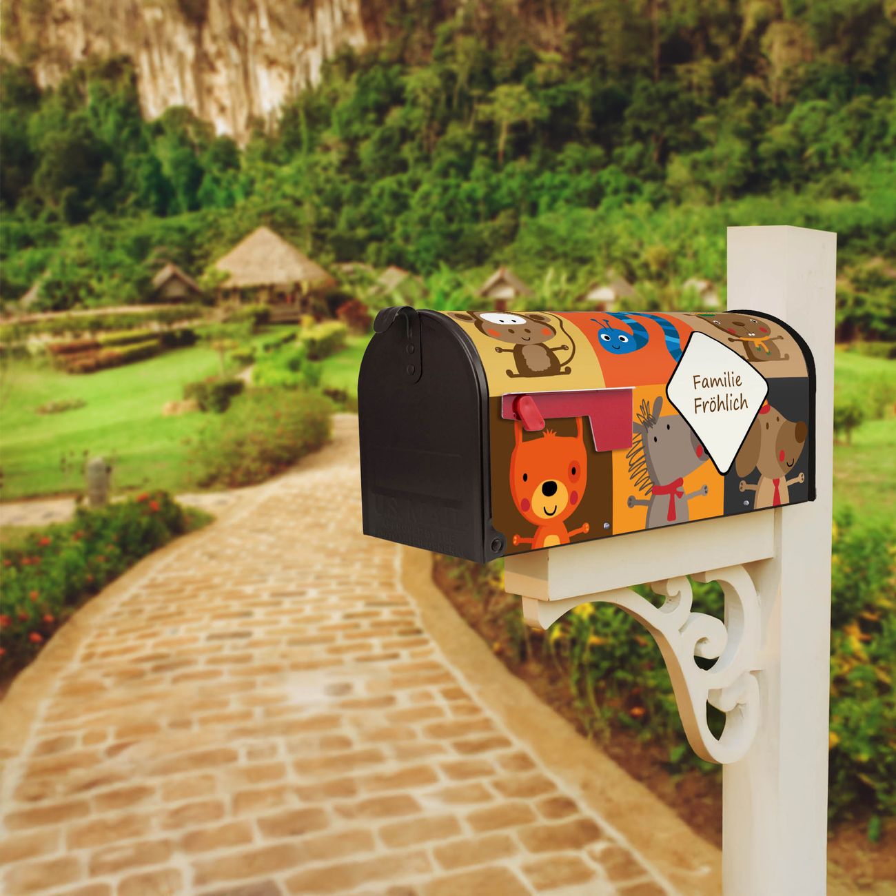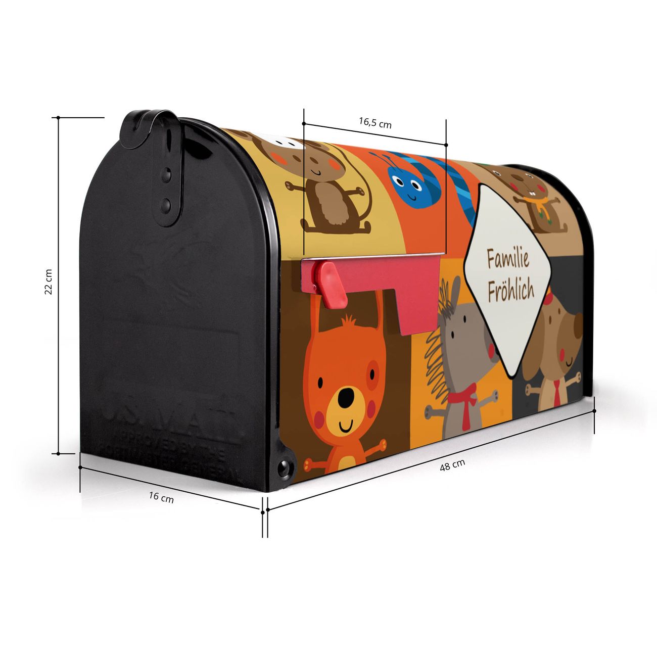 Der amerikanische Briefkasten von banjado mit Offene Arme Motiv bietet Ihnen ausreichend Fassungsvermögen, um große A4 Sendungen und Zeitschriften zu empfangen. Die typisch amerikanische rote Fahne zeigt Ihnen an, wenn Sie Post erhalten haben. Die US-Mailbox besteht aus verzinktem Stahlblech welches lackiert wurde und ist 48 x 22 x 16 CM (BxHxT) groß. Die Folie mit Motiv Offene Arme besteht aus einer wetter- und UV-resistenten Folie, die mit einem Schutzlaminat überzogen ist, sodass die US Mailbox zusätzlich vor Kratzern geschützt ist. An der Unterkante sind 4 Löcher je Seite um die Mailbox, typisch amerikanisch, an einem Holzpfahl oder einem Zaun zu befestigen. Auf Wunsch können Sie bei uns den passenden Standfuß oder die passende Wandhalterung kaufen um die US-Mailbox sicher zu befestigen. Wir bieten Ihnen ebenfalls Namensschilder, bereits beschriftet oder frei zu beschriften, und verschiedene selbst gestaltete Bitte-Keine-Werbung-Aufkleber.