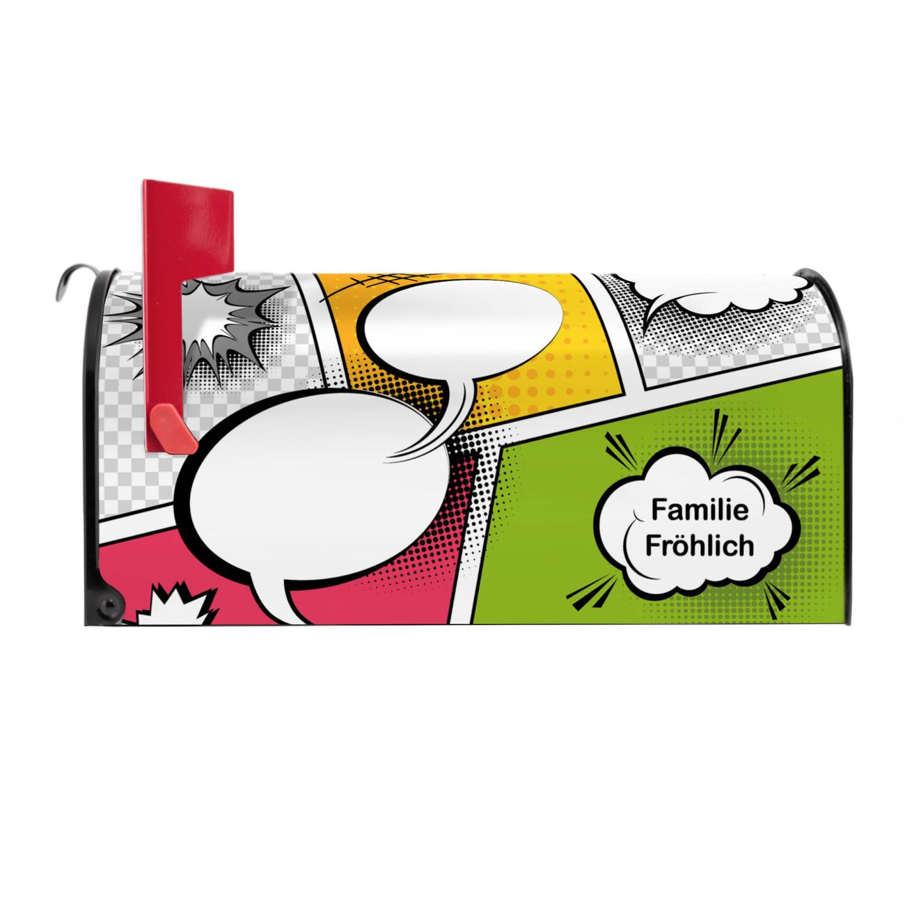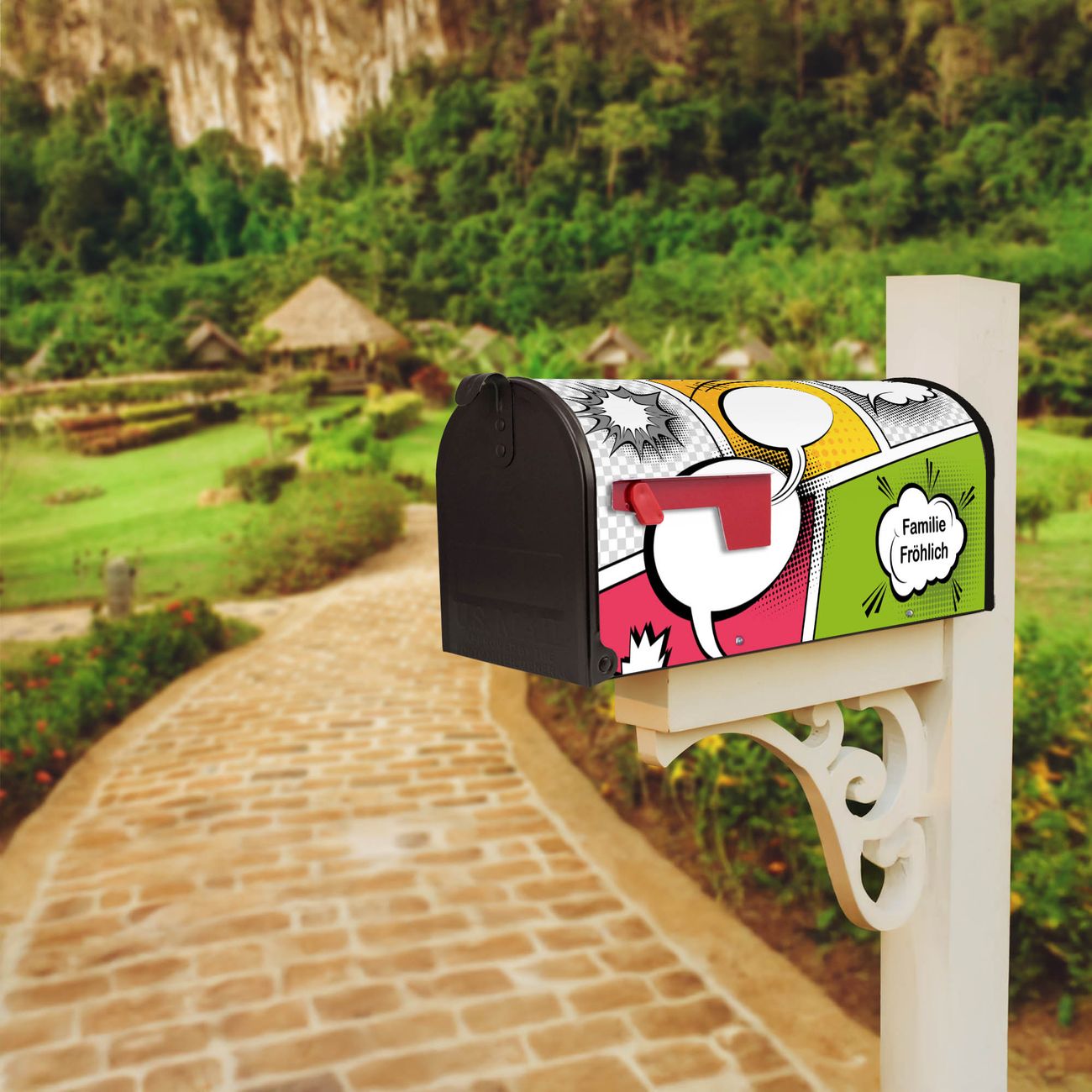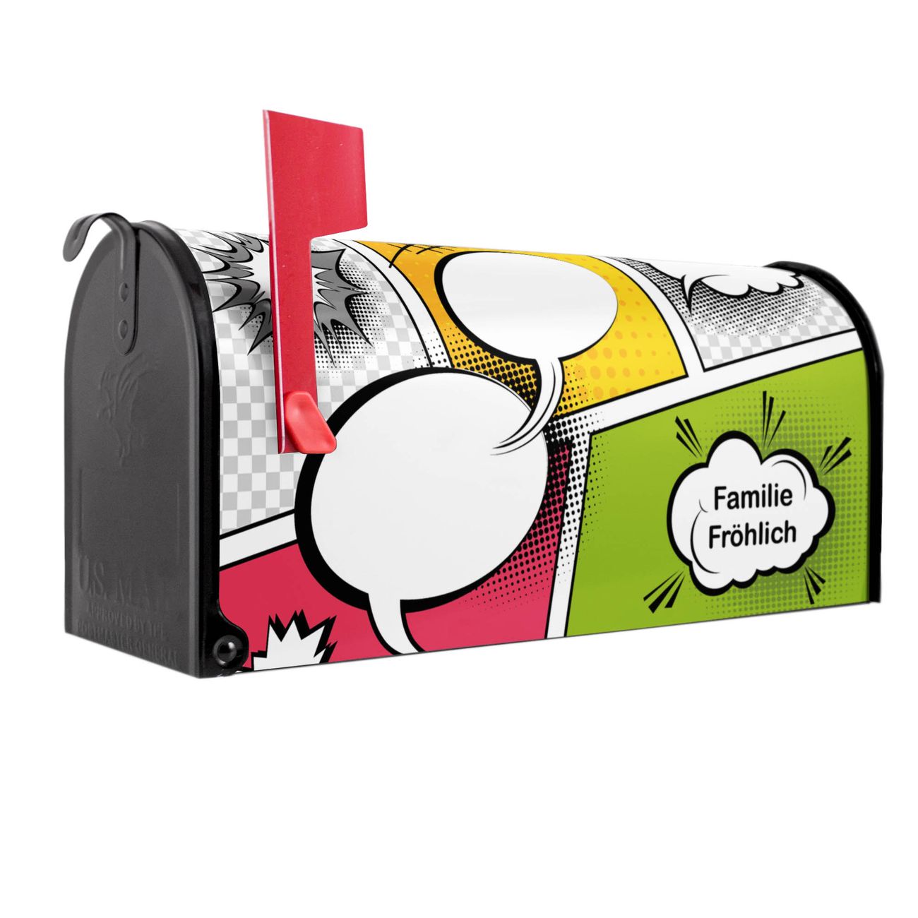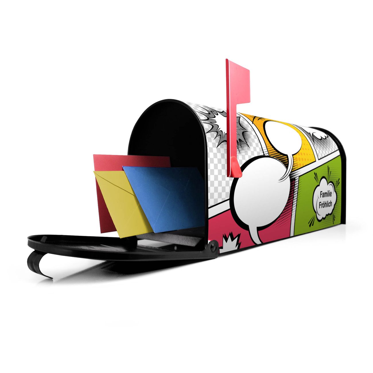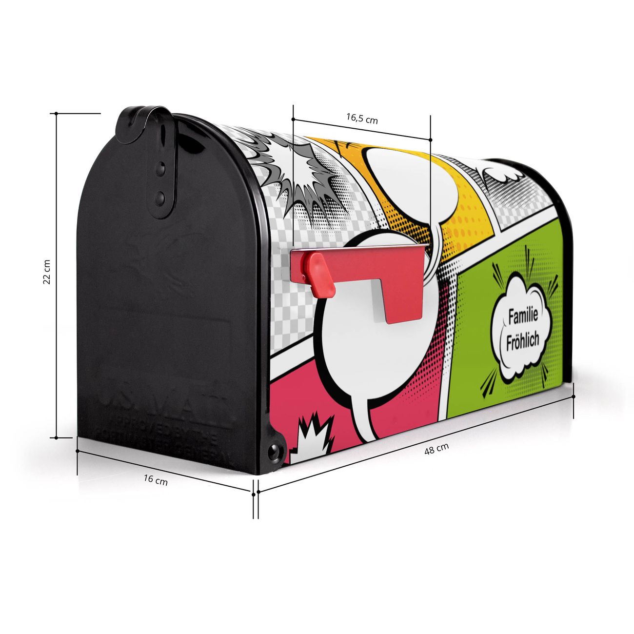 Der amerikanische Briefkasten von banjado mit Ohne Worte Motiv bietet Ihnen ausreichend Fassungsvermögen, um große A4 Sendungen und Zeitschriften zu empfangen. Die typisch amerikanische rote Fahne zeigt Ihnen an, wenn Sie Post erhalten haben. Die US-Mailbox besteht aus verzinktem Stahlblech welches lackiert wurde und ist 48 x 22 x 16 CM (BxHxT) groß. Die Folie mit Motiv Ohne Worte besteht aus einer wetter- und UV-resistenten Folie, die mit einem Schutzlaminat überzogen ist, sodass die US Mailbox zusätzlich vor Kratzern geschützt ist. An der Unterkante sind 4 Löcher je Seite um die Mailbox, typisch amerikanisch, an einem Holzpfahl oder einem Zaun zu befestigen. Auf Wunsch können Sie bei uns den passenden Standfuß oder die passende Wandhalterung kaufen um die US-Mailbox sicher zu befestigen. Wir bieten Ihnen ebenfalls Namensschilder, bereits beschriftet oder frei zu beschriften, und verschiedene selbst gestaltete Bitte-Keine-Werbung-Aufkleber.