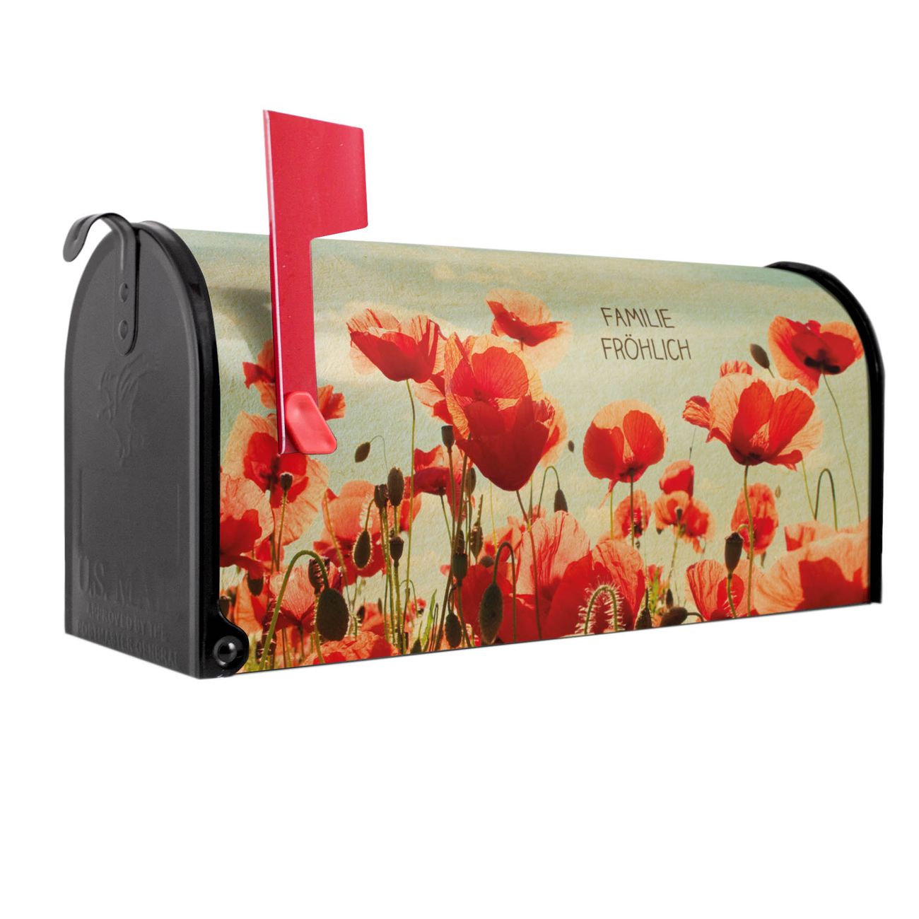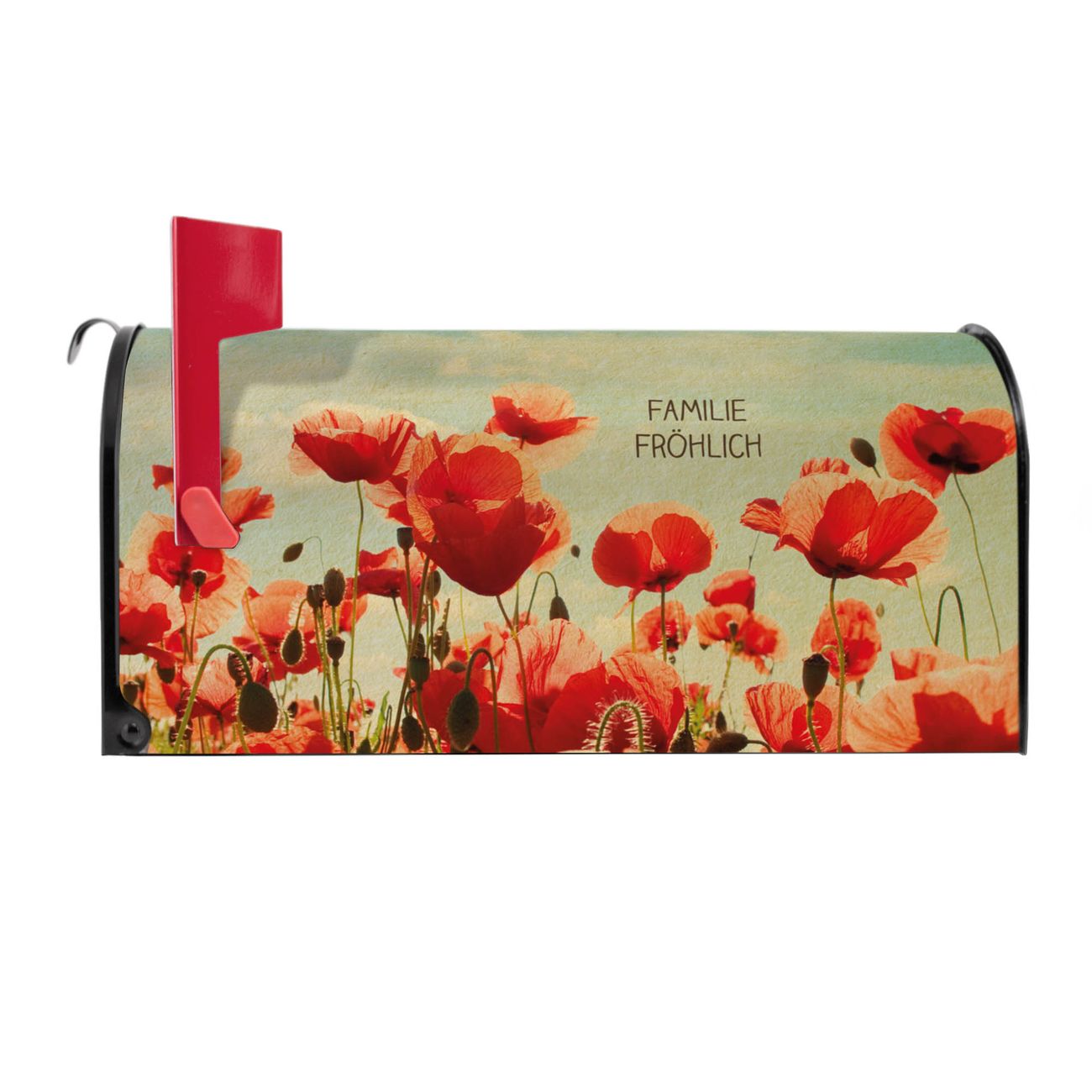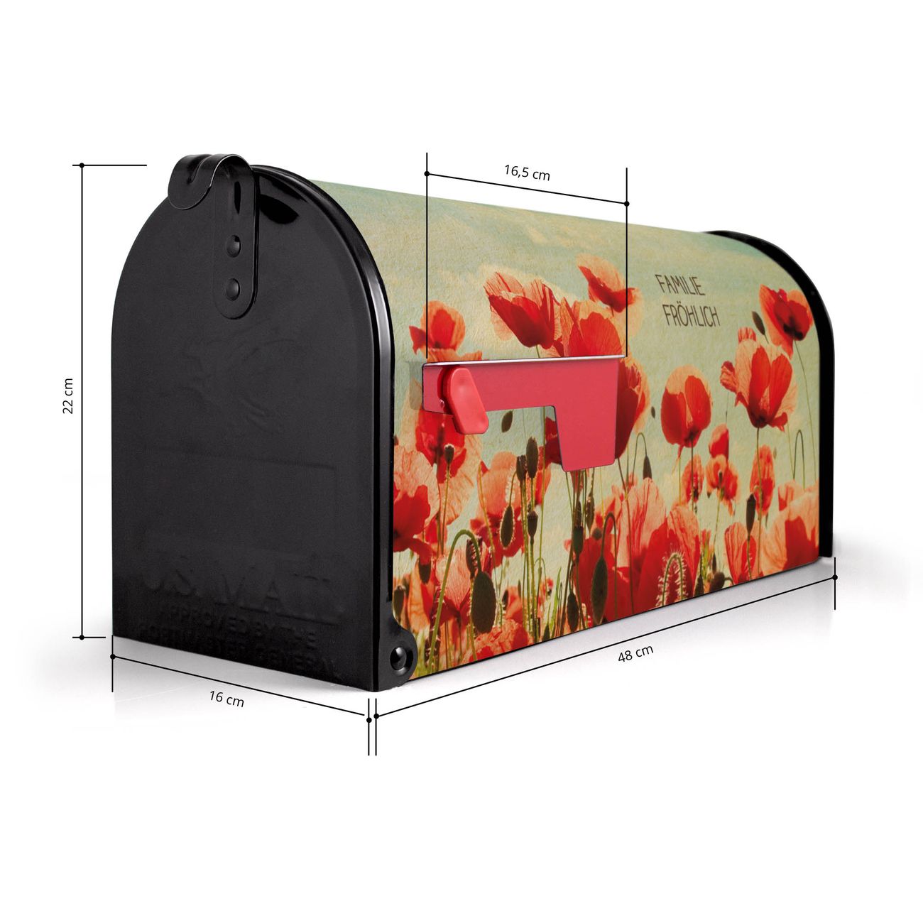Der amerikanische Briefkasten von banjado mit Oktobermohn Motiv bietet Ihnen ausreichend Fassungsvermögen, um große A4 Sendungen und Zeitschriften zu empfangen. Die typisch amerikanische rote Fahne zeigt Ihnen an, wenn Sie Post erhalten haben. Die US-Mailbox besteht aus verzinktem Stahlblech welches lackiert wurde und ist 48 x 22 x 16 CM (BxHxT) groß. Die Folie mit Motiv Oktobermohn besteht aus einer wetter- und UV-resistenten Folie, die mit einem Schutzlaminat überzogen ist, sodass die US Mailbox zusätzlich vor Kratzern geschützt ist. An der Unterkante sind 4 Löcher je Seite um die Mailbox, typisch amerikanisch, an einem Holzpfahl oder einem Zaun zu befestigen. Auf Wunsch können Sie bei uns den passenden Standfuß oder die passende Wandhalterung kaufen um die US-Mailbox sicher zu befestigen. Wir bieten Ihnen ebenfalls Namensschilder, bereits beschriftet oder frei zu beschriften, und verschiedene selbst gestaltete Bitte-Keine-Werbung-Aufkleber.