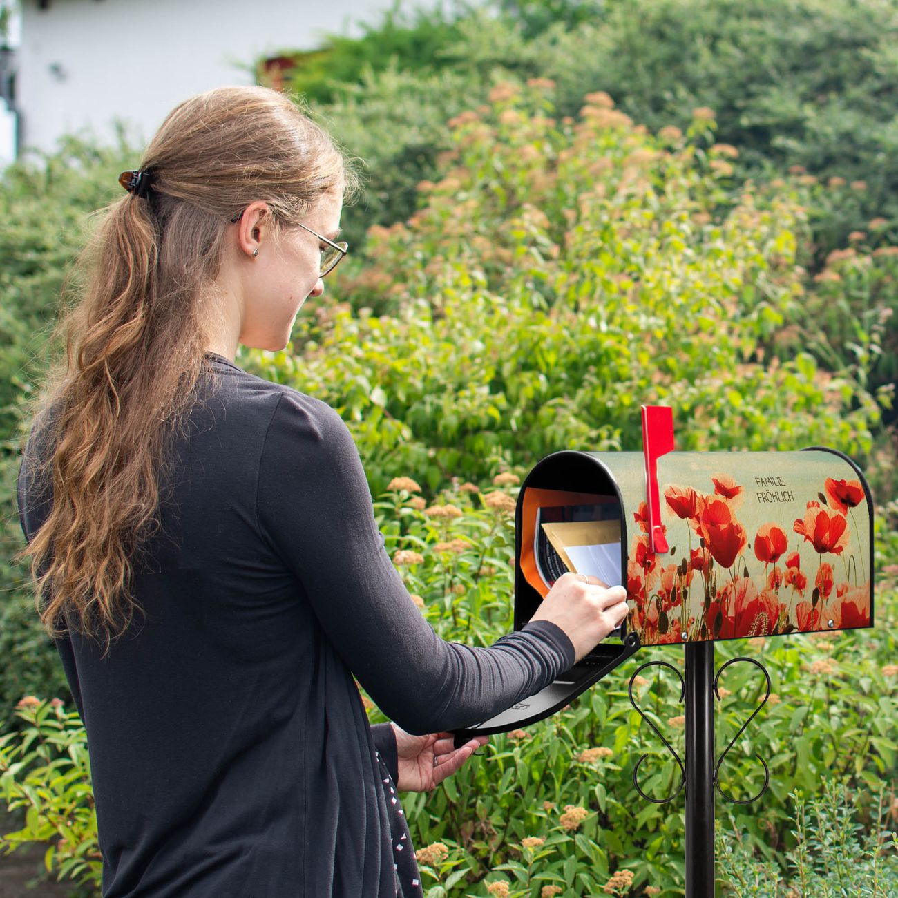 Unser amerikanischer Briefkasten mit dem Motiv Oktobermohn hat ein sehr ansprechendes und ausgefallenes Design, ist in der Grundfarbe weiß, grün oder schwarz erhältlich. Damit entlocken Sie Ihren Nachbarn und dem Postboten immer wieder ein Lächeln. Die Mailbox ist ein Original Import aus Mississippi USA und wird von unserer kleinen Manufaktur in Sachsen von Hand veredelt. Die US-Mailbox bietet ausreichend Platz auch für große Sendungen, eine Fahne die Ihnen Post anzeigt, wetterfestes und äußerst stabiles Material - so macht Post empfangen Freude.