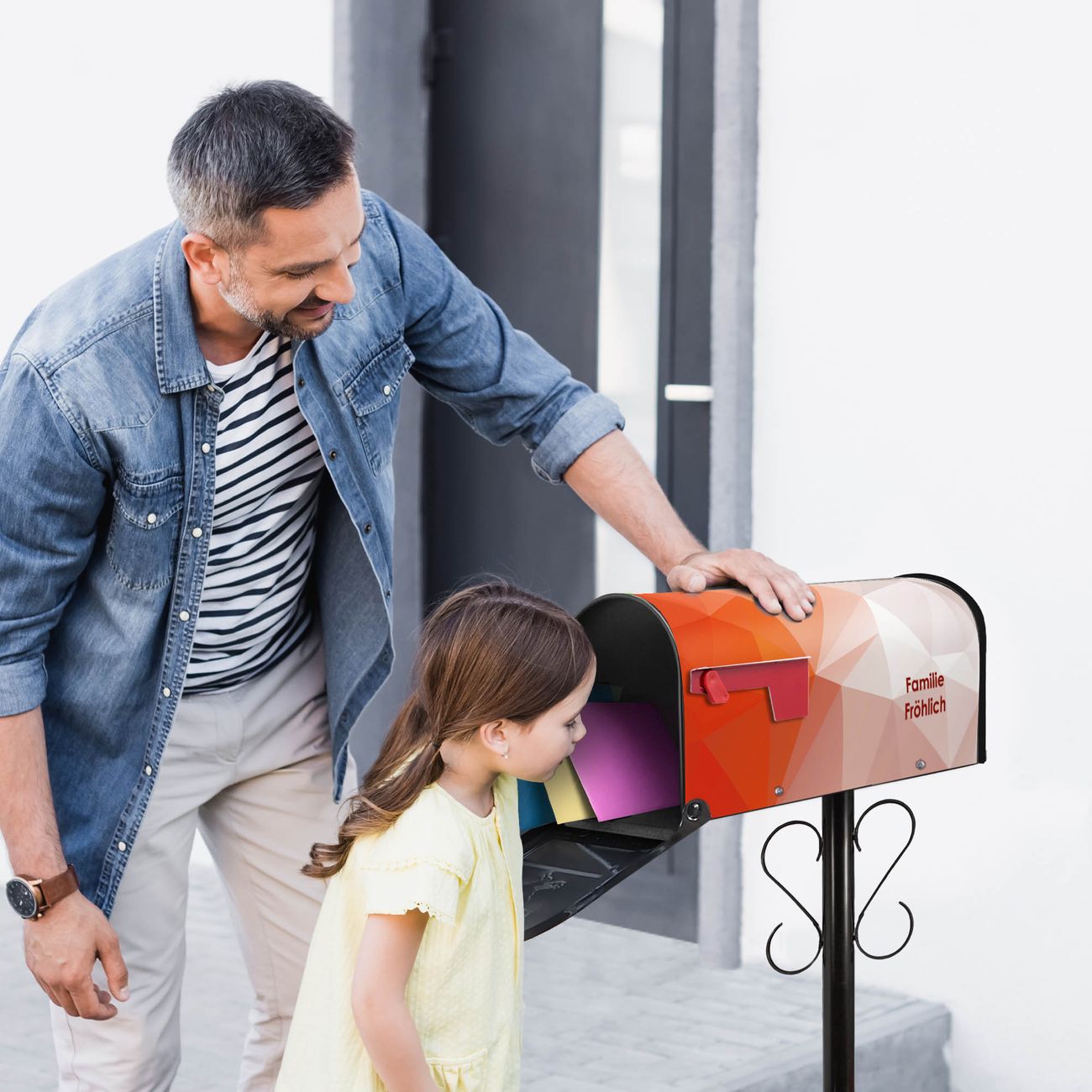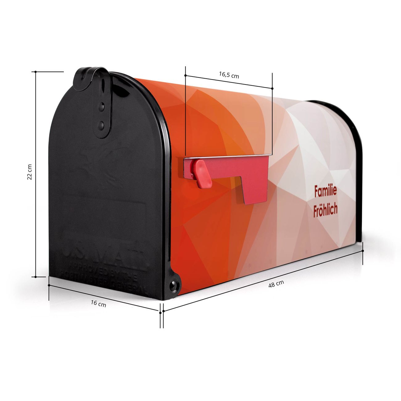 Der amerikanische Briefkasten von banjado mit Orange Polygon Motiv bietet Ihnen ausreichend Fassungsvermögen, um große A4 Sendungen und Zeitschriften zu empfangen. Die typisch amerikanische rote Fahne zeigt Ihnen an, wenn Sie Post erhalten haben. Die US-Mailbox besteht aus verzinktem Stahlblech welches lackiert wurde und ist 48 x 22 x 16 CM (BxHxT) groß. Die Folie mit Motiv Orange Polygon besteht aus einer wetter- und UV-resistenten Folie, die mit einem Schutzlaminat überzogen ist, sodass die US Mailbox zusätzlich vor Kratzern geschützt ist. An der Unterkante sind 4 Löcher je Seite um die Mailbox, typisch amerikanisch, an einem Holzpfahl oder einem Zaun zu befestigen. Auf Wunsch können Sie bei uns den passenden Standfuß oder die passende Wandhalterung kaufen um die US-Mailbox sicher zu befestigen. Wir bieten Ihnen ebenfalls Namensschilder, bereits beschriftet oder frei zu beschriften, und verschiedene selbst gestaltete Bitte-Keine-Werbung-Aufkleber.