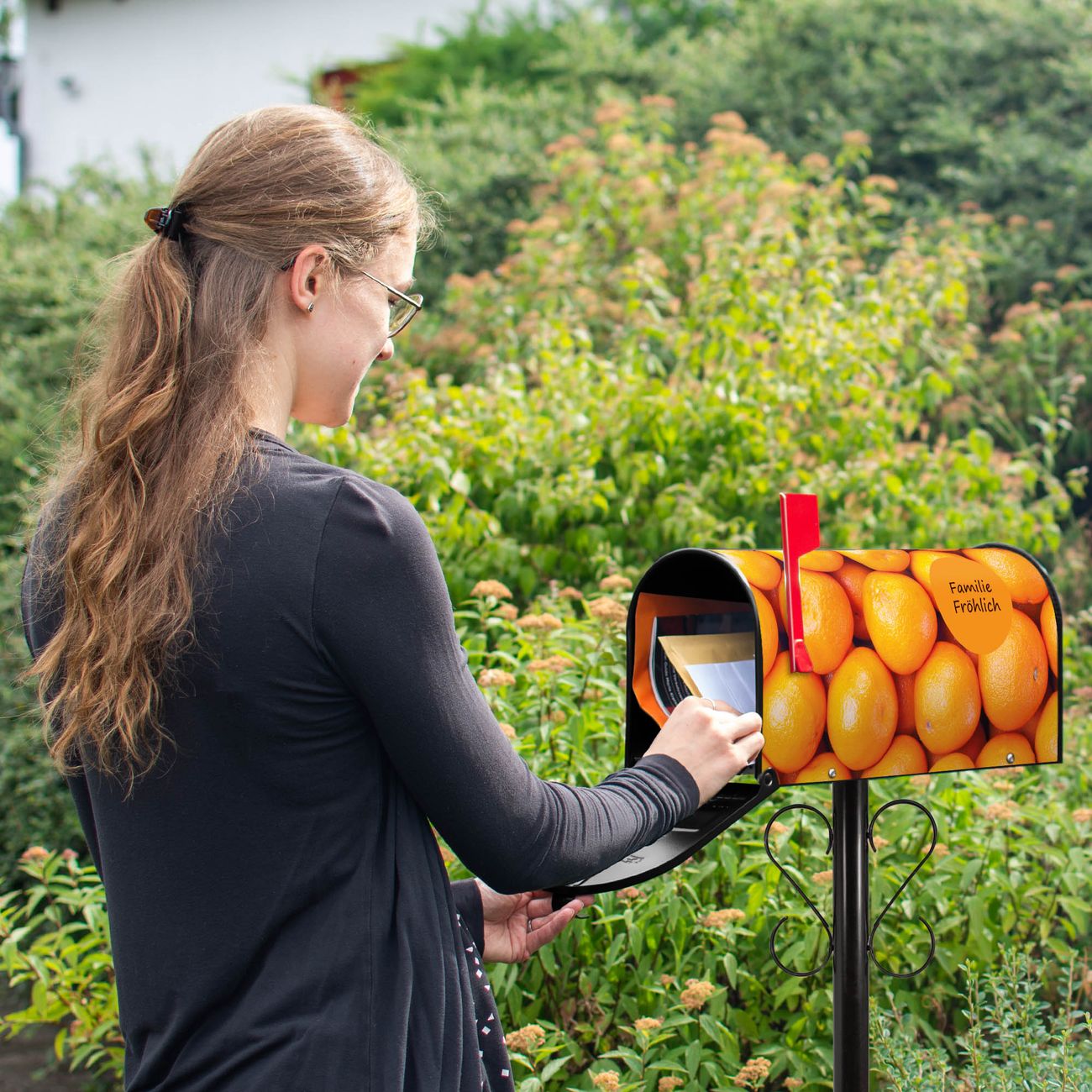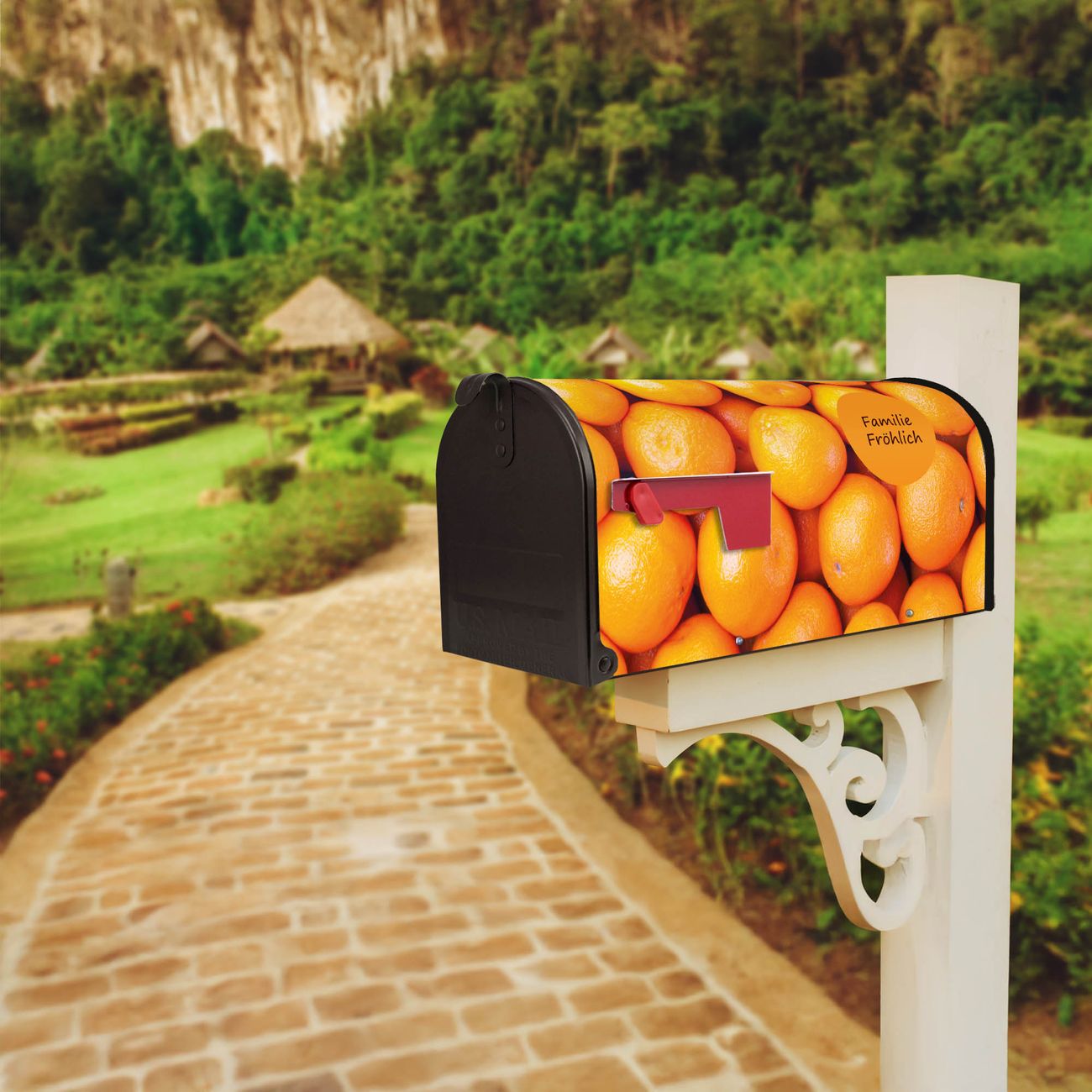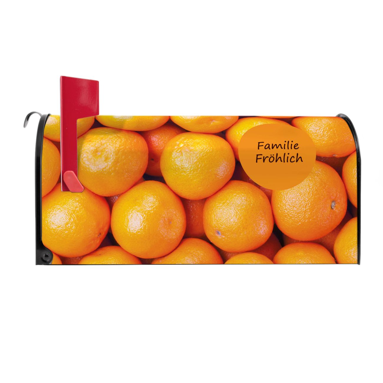Der amerikanische Briefkasten von banjado mit Orangen Motiv bietet Ihnen ausreichend Fassungsvermögen, um große A4 Sendungen und Zeitschriften zu empfangen. Die typisch amerikanische rote Fahne zeigt Ihnen an, wenn Sie Post erhalten haben. Die US-Mailbox besteht aus verzinktem Stahlblech welches lackiert wurde und ist 48 x 22 x 16 CM (BxHxT) groß. Die Folie mit Motiv Orangen besteht aus einer wetter- und UV-resistenten Folie, die mit einem Schutzlaminat überzogen ist, sodass die US Mailbox zusätzlich vor Kratzern geschützt ist. An der Unterkante sind 4 Löcher je Seite um die Mailbox, typisch amerikanisch, an einem Holzpfahl oder einem Zaun zu befestigen. Auf Wunsch können Sie bei uns den passenden Standfuß oder die passende Wandhalterung kaufen um die US-Mailbox sicher zu befestigen. Wir bieten Ihnen ebenfalls Namensschilder, bereits beschriftet oder frei zu beschriften, und verschiedene selbst gestaltete Bitte-Keine-Werbung-Aufkleber.