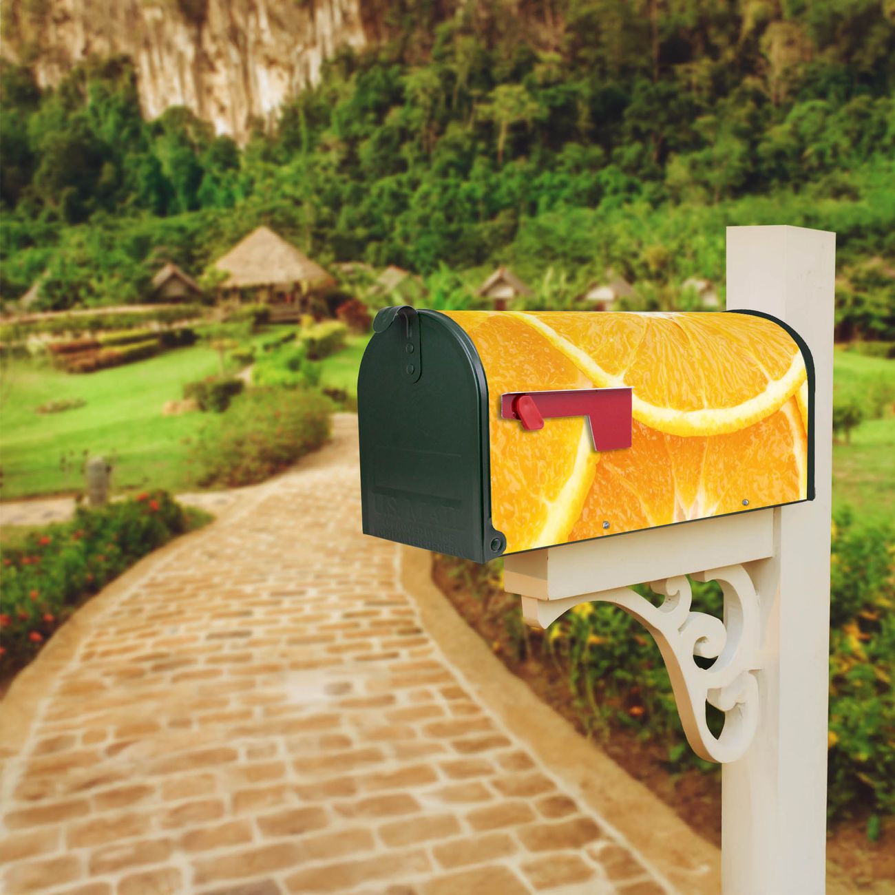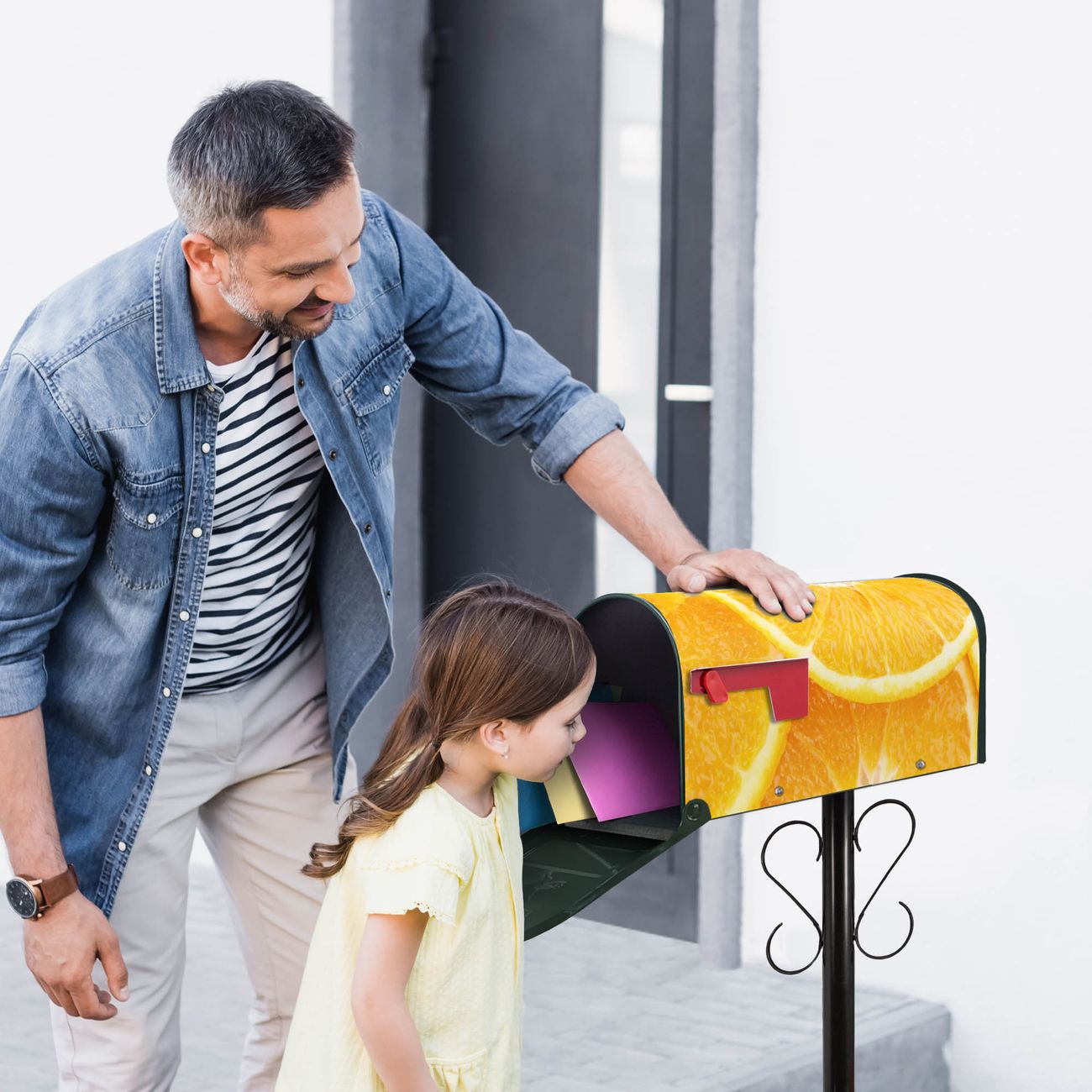 Der amerikanische Briefkasten von banjado mit Orangenscheiben Motiv bietet Ihnen ausreichend Fassungsvermögen, um große A4 Sendungen und Zeitschriften zu empfangen. Die typisch amerikanische rote Fahne zeigt Ihnen an, wenn Sie Post erhalten haben. Die US-Mailbox besteht aus verzinktem Stahlblech welches lackiert wurde und ist 48 x 22 x 16 CM (BxHxT) groß. Die Folie mit Motiv Orangenscheiben besteht aus einer wetter- und UV-resistenten Folie, die mit einem Schutzlaminat überzogen ist, sodass die US Mailbox zusätzlich vor Kratzern geschützt ist. An der Unterkante sind 4 Löcher je Seite um die Mailbox, typisch amerikanisch, an einem Holzpfahl oder einem Zaun zu befestigen. Auf Wunsch können Sie bei uns den passenden Standfuß oder die passende Wandhalterung kaufen um die US-Mailbox sicher zu befestigen. Wir bieten Ihnen ebenfalls Namensschilder, bereits beschriftet oder frei zu beschriften, und verschiedene selbst gestaltete Bitte-Keine-Werbung-Aufkleber.